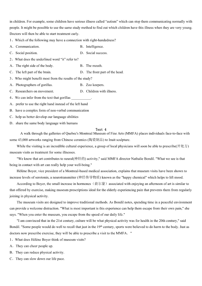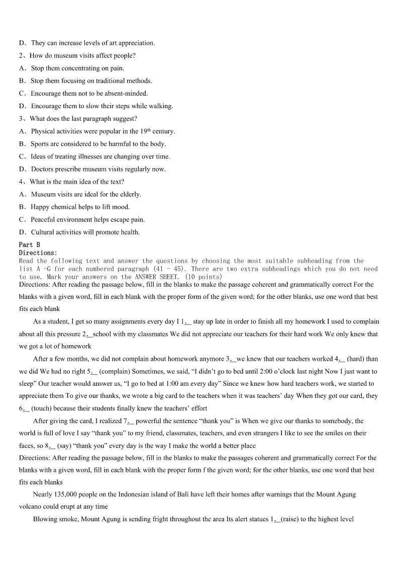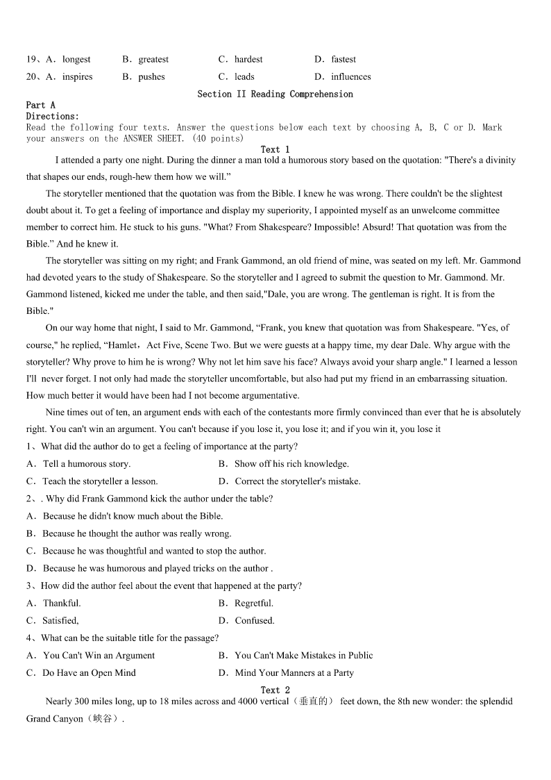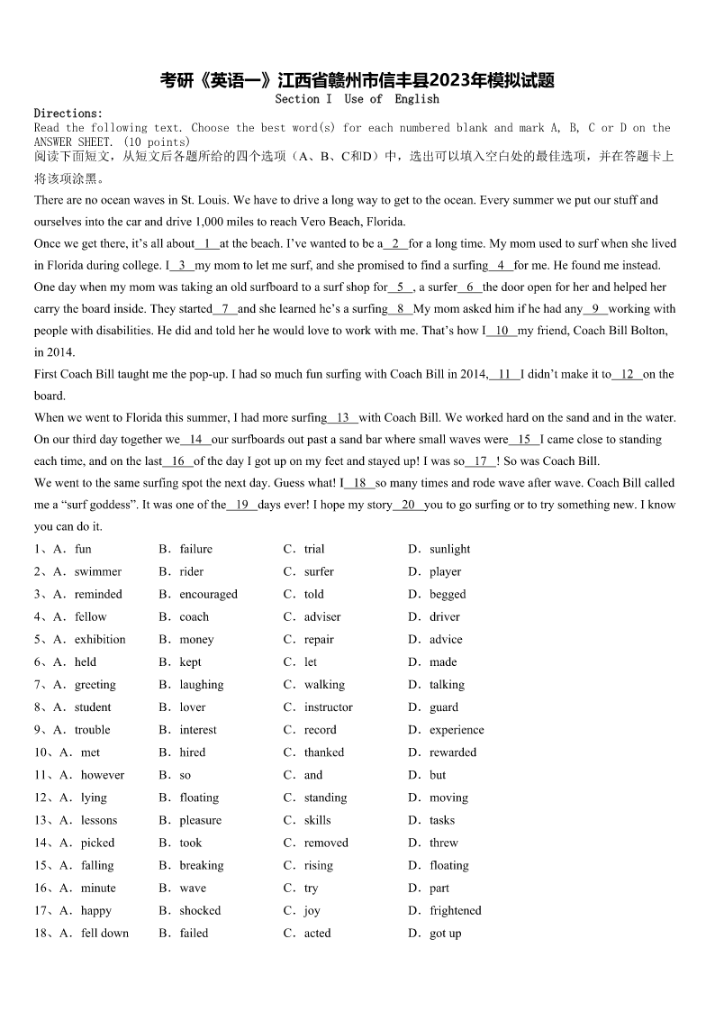 考研《英语一》江西省赣州市信丰县2023年模拟试题 SectionIUseofEnglish Directions: Readthefollowingtext.Choosethebestword(s)foreachnumberedblankandmarkA,B,CorDonthe ANSWERSHEET.(10points) 阅读下面短文,从短文后各题所给的四个选项(A、B、C和D)中,选出可以填入空白处的最佳选项,并在答题卡上 将该项涂黑。 TherearenooceanwavesinSt.Louis.Wehavetodrivealongwaytogettotheocean.Everysummerweputourstuffand ourselvesintothecaranddrive1,000milestoreachVeroBeach,Florida. Oncewegetthere,it’sallabout1atthebeach.I’vewantedtobea2foralongtime.Mymomusedtosurfwhenshelived inFloridaduringcollege.I3mymomtoletmesurf,andshepromisedtofindasurfing4forme.Hefoundmeinstead. Onedaywhenmymomwastakinganoldsurfboardtoasurfshopfor5,asurfer6thedooropenforherandhelpedher carrytheboardinside.Theystarted7andshelearnedhe’sasurfing8Mymomaskedhimifhehadany9workingwith peoplewithdisabilities.Hedidandtoldherhewouldlovetoworkwithme.That’showI10myfriend,CoachBillBolton, in2014. FirstCoachBilltaughtmethepop-up.IhadsomuchfunsurfingwithCoachBillin2014,11Ididn’tmakeitto12onthe board. WhenwewenttoFloridathissummer,Ihadmoresurfing13withCoachBill.Weworkedhardonthesandandinthewater. Onourthirddaytogetherwe14oursurfboardsoutpastasandbarwheresmallwaveswere15Icameclosetostanding eachtime,andonthelast16ofthedayIgotuponmyfeetandstayedup!Iwasso17!SowasCoachBill. Wewenttothesamesurfingspotthenextday.Guesswhat!I18somanytimesandrodewaveafterwave.CoachBillcalled mea“surfgoddess”.Itwasoneofthe19daysever!Ihopemystory20youtogosurfingortotrysomethingnew.Iknow youcandoit. 1、A.funB.failureC.trialD.sunlight 2、A.swimmerB.riderC.surferD.player 3、A.remindedB.encouragedC.toldD.begged 4、A.fellowB.coachC.adviserD.driver 5、A.exhibitionB.moneyC.repairD.advice 6、A.heldB.keptC.letD.made 7、A.greetingB.laughingC.walkingD.talking 8、A.studentB.loverC.instructorD.guard 9、A.troubleB.interestC.recordD.experience 10、A.metB.hiredC.thankedD.rewarded 11、A.howeverB.soC.andD.but 12、A.lyingB.floatingC.standingD.moving 13、A.lessonsB.pleasureC.skillsD.tasks 14、A.pickedB.tookC.removedD.threw 15、A.fallingB.breakingC.risingD.floating 16、A.mi