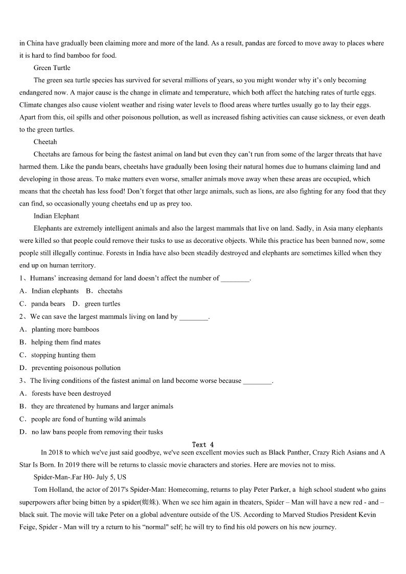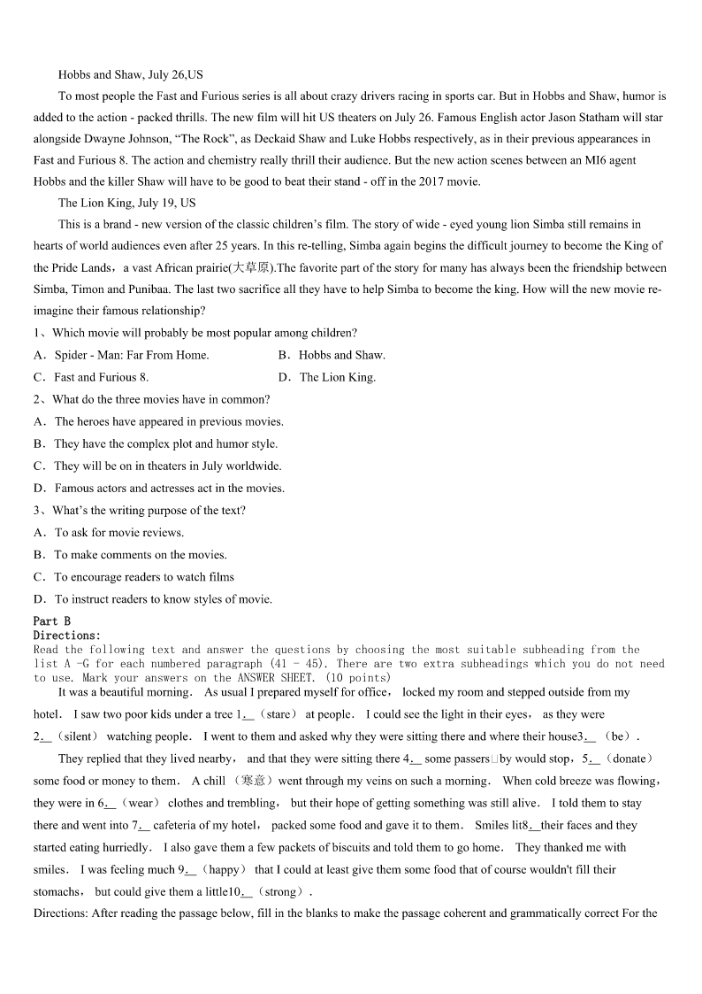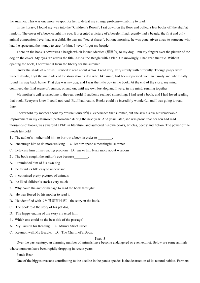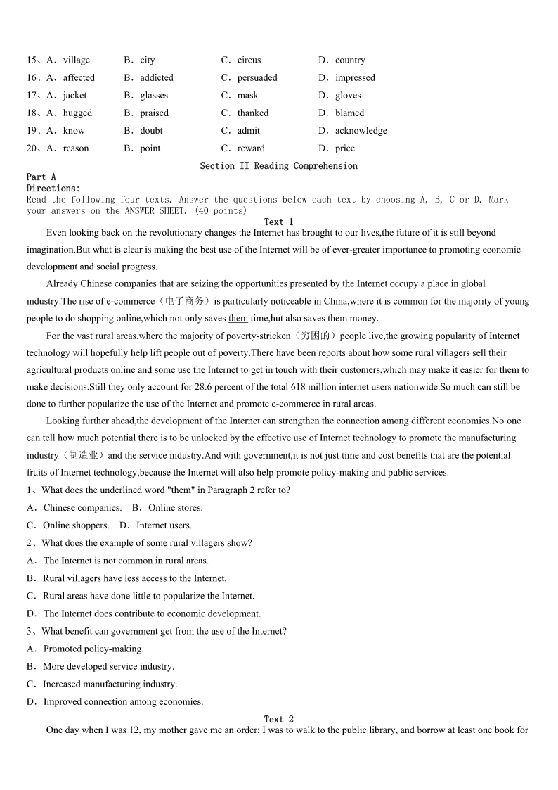 考研《英语一》沈丘县2023年深度预测试卷 SectionIUseofEnglish Directions: Readthefollowingtext.Choosethebestword(s)foreachnumberedblankandmarkA,B,CorDonthe ANSWERSHEET.(10points) Twelve-year-oldAllendecidedtoleavehomecityandmakealivingbyhimselfbecausehisfamilywastoopoor. Beforeheleft,hisfatheraskedhimwhathewasgoingtodo.Allenanswered,“Iwanttolearn1performance.” Hisfatherwas2withhisanswer,“What?No,youcan’tdothat.Circusistheplaceforclownsinmanypeople’seyes. Ourfamilywillbe3ofyou.” ButAllen4,“Ourfamilyissopoorrightnow.Whichismoreimportanttoyou,5orclothingandfood?Iwillgive yousomemoneyeverymonthfromthecircus.Itprobablywillbeahuge6.”Hisfatherwasvery7,“Ifyougothere, somebodywillknowaboutitverysoonandI’llbevery8.” Aftergoing9alotofdifficulties,Allenfinallyfoundacircusandconvincedthe10tolethimstay.Heworkedvery hardstudyingmagicandlivedwithanimals. Everymonth,hisparentswouldgeta11fromhim.Buttheyneverknewhisaddress.Theyknewthemoneywasfrom AllenbutwhenpeopleaskedthemaboutAllen’s12,theynevertoldthemthetruth.Later,hisparentsreceivedmoreand moremoneyfromhim. Then,a13namedAlbertbecameveryfamousinthewholeworld.Everyonethought14ofhisperformance.Lotsof peoplehurriedtoseehisperformancefromfaraway. Oneday,Allen’sfatherwenttovisitarelativeinanother15.TherelativepaidalotofmoneyforticketsofAlbertthe magician’sshow.Allen’sfatherwenttotheshowwiththerelative.Duringtheshow,Allen’sfathergottotally16bythe magician’stricks.Whenthemagiciantookoffhis17,thefatherfoundAlbertwashisson,Allen. Allenrecognizedhisfather.Hisfather18him,“Whydidyouchangeyourname?” “Becauseyousaidyouwouldbeembarrassedforme.” “Butnobodywill19thefamousmagicianismysonAllen.” Wewantallthebestthingsinlifeandavoidthebadpast.However,everygoodthingcomesata20.Youcan’thave themallwithoutgivingupsomething. 1、A.musicB.theatreC.circusD.animal 2、A.satisfiedB.unhappyC.curiousD.hopeful 3、A.guiltyB.proudC.tiredD.ashamed 4、A.insistedB.demandedC.addedD.declined 5、A.dignityB.popularityC.nameD.money 6、A.careerB.successC.fortuneD.performance 7、A.convincingB.stubborn