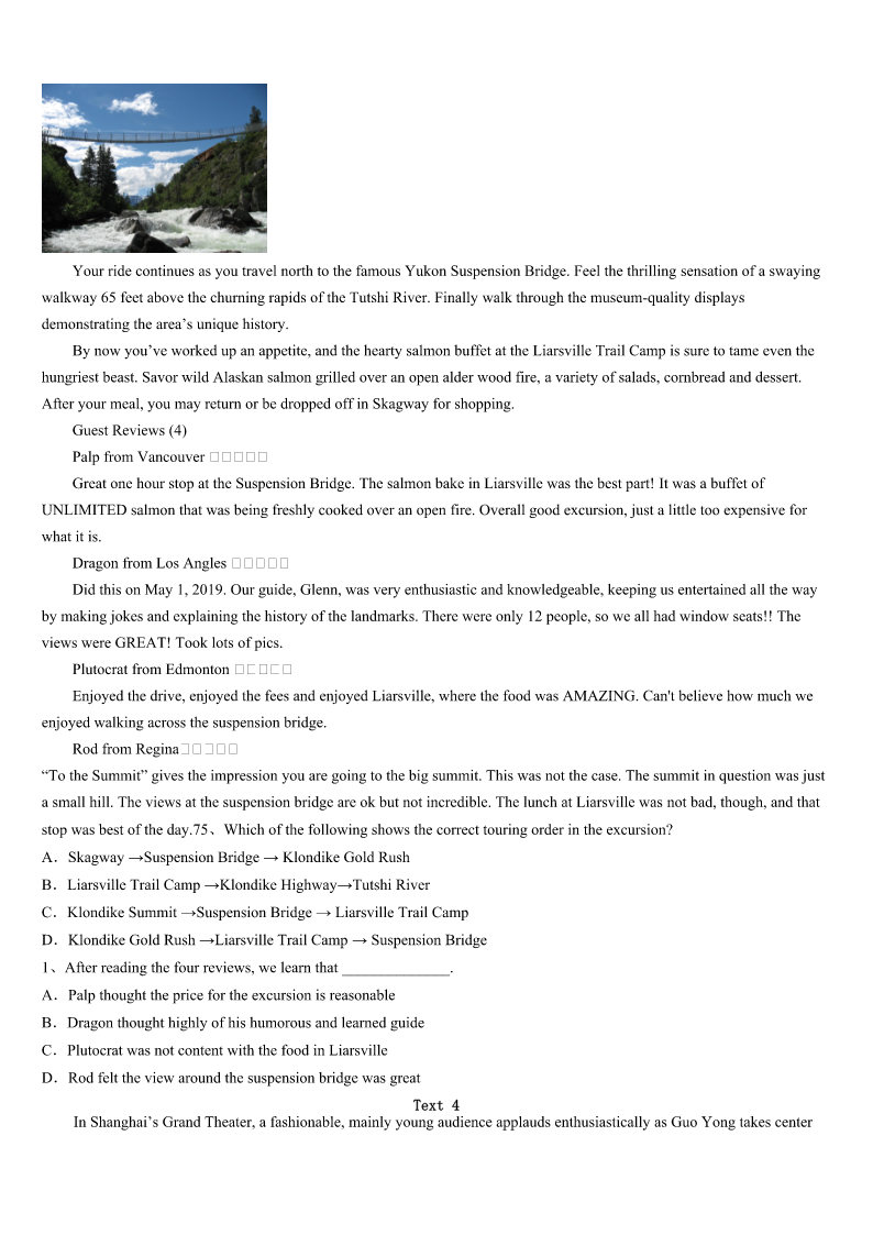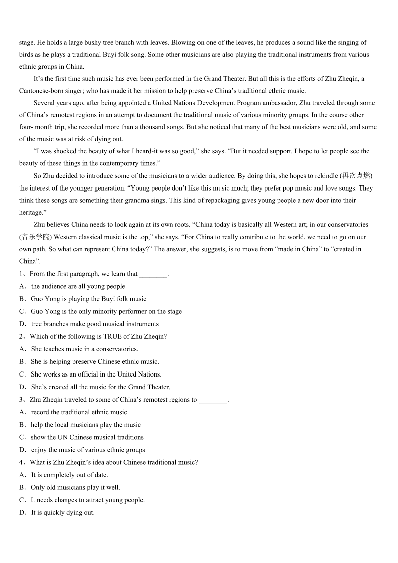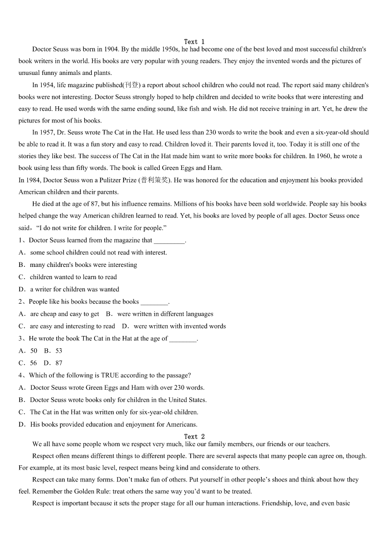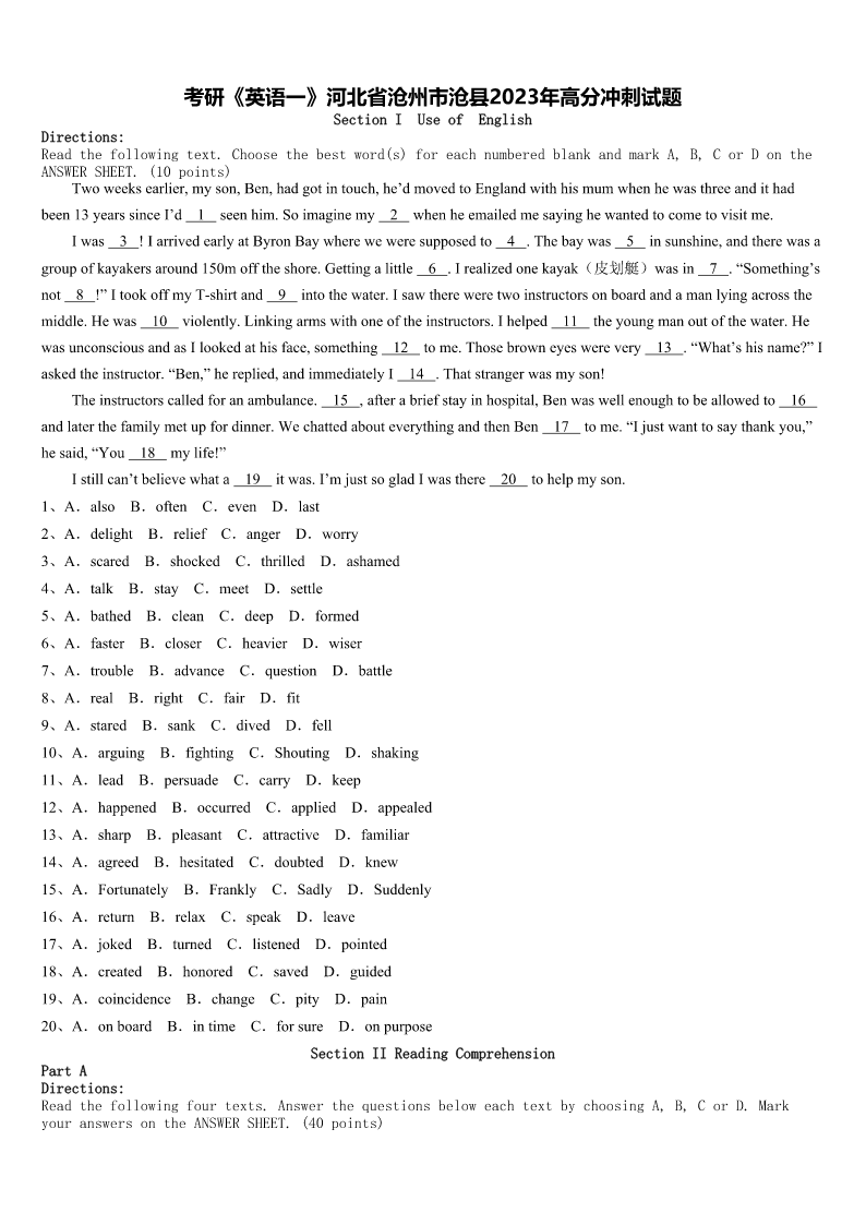 考研《英语一》河北省沧州市沧县2023年高分冲刺试题 SectionIUseofEnglish Directions: Readthefollowingtext.Choosethebestword(s)foreachnumberedblankandmarkA,B,CorDonthe ANSWERSHEET.(10points) Twoweeksearlier,myson,Ben,hadgotintouch,he’dmovedtoEnglandwithhismumwhenhewasthreeandithad been13yearssinceI’d1seenhim.Soimaginemy2whenheemailedmesayinghewantedtocometovisitme. Iwas3!IarrivedearlyatByronBaywhereweweresupposedto4.Thebaywas5insunshine,andtherewasa groupofkayakersaround150mofftheshore.Gettingalittle6.Irealizedonekayak(皮划艇)wasin7.“Something’s not8!”ItookoffmyTshirtand9intothewater.Isawthereweretwoinstructorsonboardandamanlyingacrossthe middle.Hewas10violently.Linkingarmswithoneoftheinstructors.Ihelped11theyoungmanoutofthewater.He wasunconsciousandasIlookedathisface,something12tome.Thosebrowneyeswerevery13.“What’shisname?”I askedtheinstructor.“Ben,”hereplied,andimmediatelyI14.Thatstrangerwasmyson! Theinstructorscalledforanambulance.15,afterabriefstayinhospital,Benwaswellenoughtobeallowedto16 andlaterthefamilymetupfordinner.WechattedabouteverythingandthenBen17tome.“Ijustwanttosaythankyou,” hesaid,“You18mylife!” Istillcan’tbelievewhata19itwas.I’mjustsogladIwasthere20tohelpmyson. 1、A.alsoB.oftenC.evenD.last 2、A.delightB.reliefC.angerD.worry 3、A.scaredB.shockedC.thrilledD.ashamed 4、A.talkB.stayC.meetD.settle 5、A.bathedB.cleanC.deepD.formed 6、A.fasterB.closerC.heavierD.wiser 7、A.troubleB.advanceC.questionD.battle 8、A.realB.rightC.fairD.fit 9、A.staredB.sankC.divedD.fell 10、A.arguingB.fightingC.ShoutingD.shaking 11、A.leadB.persuadeC.carryD.keep 12、A.happenedB.occurredC.appliedD.appealed 13、A.sharpB.pleasantC.attractiveD.familiar 14、A.agreedB.hesitatedC.doubtedD.knew 15、A.FortunatelyB.FranklyC.SadlyD.Suddenly 16、A.returnB.relaxC.speakD.leave 17、A.jokedB.turnedC.listenedD.pointed 18、A.createdB.honoredC.savedD.guided 19、A.coincidenceB.changeC.pityD.pain 20、A.onboardB.intimeC.forsureD.onpurpose SectionIIReadingComprehension PartA Directions: Readthefollowingfourtexts.Answerthequestionsbeloweachtextbych