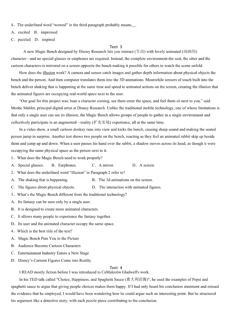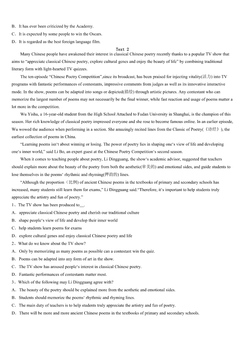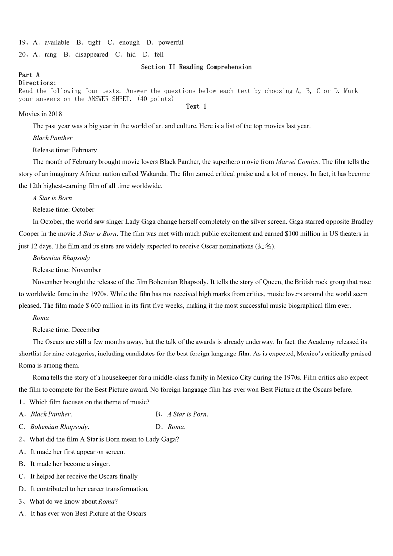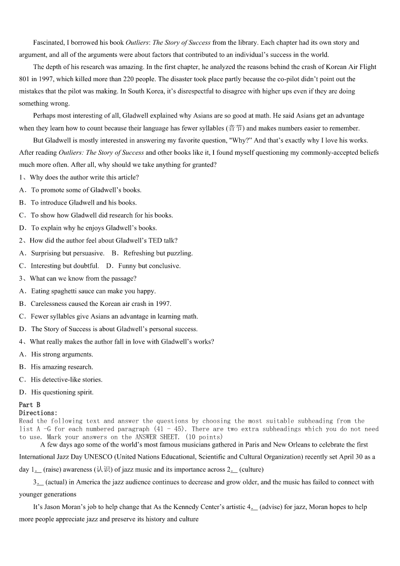 2023年乌恰县考研《英语一》最后冲刺试题 SectionIUseofEnglish Directions: Readthefollowingtext.Choosethebestword(s)foreachnumberedblankandmarkA,B,CorDonthe ANSWERSHEET.(10points) IsatandwaitedforKathleentospeak.“Annie,”shesaid,“Afoodbankthatservestheelderlyisaskingfor1.I’dlike youtoorganizetheevent”“Well,errr…sure.”AsIstuttered(结巴地说)throughmy2,allIcouldthinkwas,“What?Why me?” Iwalkedbacktomyofficewonderingwhereto3.Thiswasatimewhentheeconomywas4.Therisein unemploymentforcedmanyofmycoworkersto5tosurvive.HowcouldIaskthemformore? ThateveningIdrovehomewithnegativity.ThenIrememberedatimewhenmyfatherwasoutofwork.Momwroteanote toJim,themilkman,askinghimnotto6anymoremilk.TwodayslaterJimpickedupthe7andleftfourlitersofmilk. Hewrotehismessage,whichread,“Kidsneedmilk.”Themilkdelivery8asusualandJimnevercollectedacent9us. ThememoryofJim’s10firedmyenthusiasm.PerhapsI’dbeinforapleasantsurprise. ThenextmorningI11signsaboutourfooddrivealloverthecafeteriaandoneverynoticeboardIcouldfind.Each signsaid,“Fooddrivetosupportthepoorelderly!12ofnon-perishable(不易腐的)foodsaregreatlyneeded.” WithinafewdaysIhadtolocateemptyofficespaceto13themassivenumberofcontributionswehad14.Oneof mycoworkers,Maggie,madetheroundswithmeeverydayfromonedepartmenttoanotherto15thecannedgoodsand otherfoods.Thoughoversixty,shepushedourfoodtrolleyaroundwiththe16ofawomanhalfherage. Iaskedherwhereshegotalltheenthusiasm.Shesaid,“Withtheunemploymentratetouching10percent,Ican’tthinkofa betterwaytobe17forkeepingourjobswhensomanyhave18theirs.Suremoneyis19.Butwhenisn’tit?People needfood.” AsIlistenedtoMaggie,themilkman’swords20inmyears,“Kidsneedmilk.” 1、A.adviceB.helpC.pityD.medicine 2、A.responseB.commentC.explanationD.complaint 3、A.sitB.stayC.beginD.work 4、A.growingB.fadingC.recoveringD.booming 5、A.driveB.attemptC.refuseD.struggle 6、A.spareB.drinkC.deliverD.sell 7、A.keysB.kidsC.centsD.empties 8、A.returnedB.continuedC.stoppedD.delayed 9、A.forB.toC.withD.from 10、A.kindnessB.happinessC.patienceD.politeness 11、A.designedB.noticedC.markedD.posted 12、A.