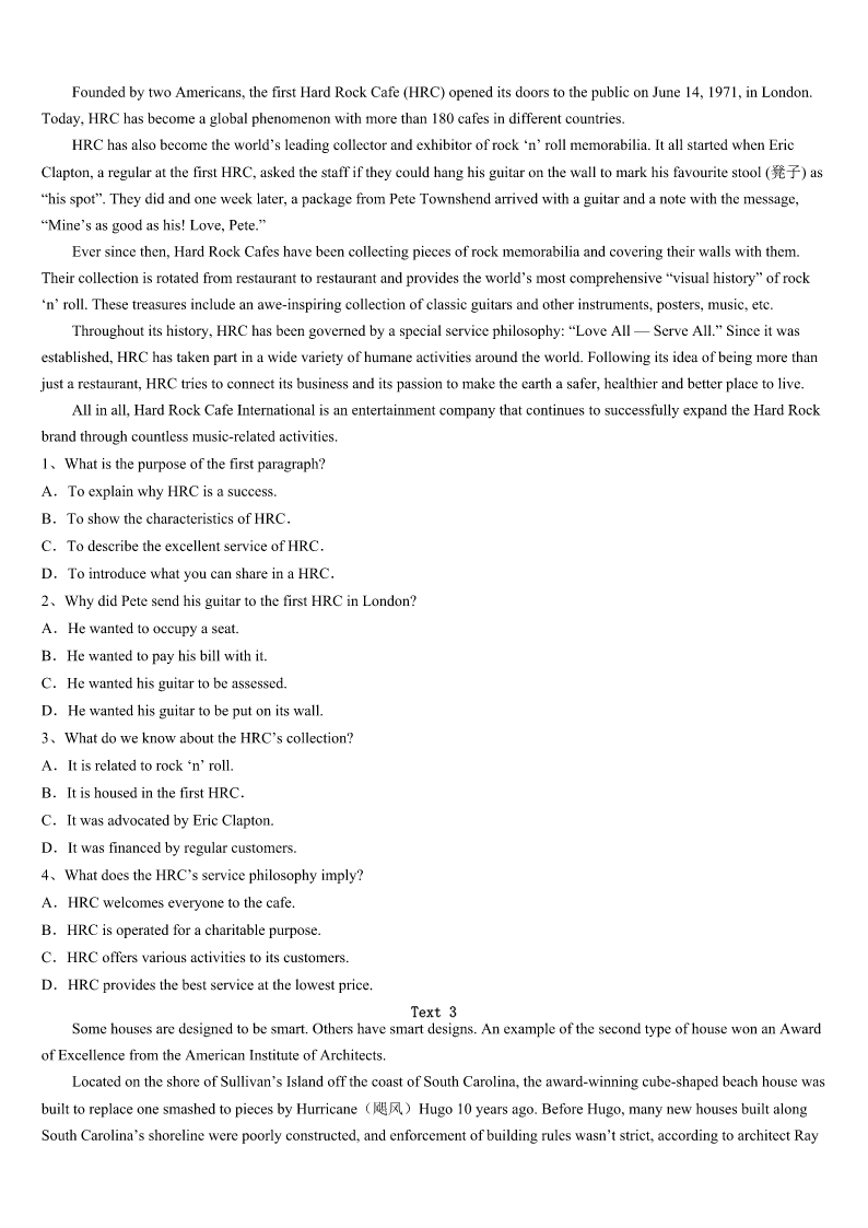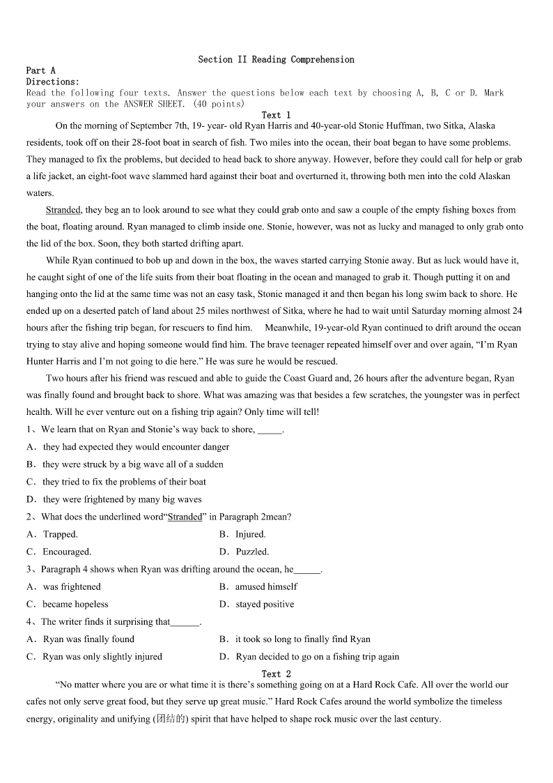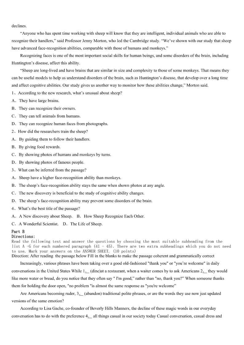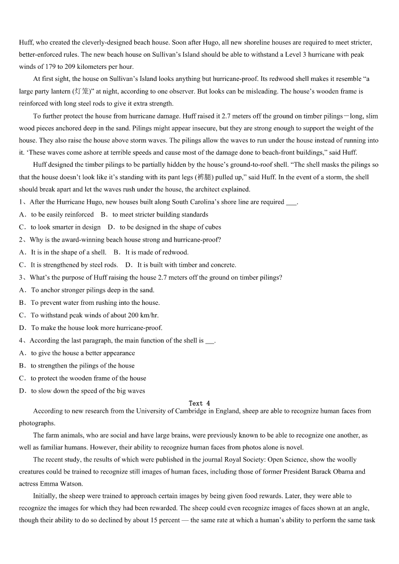 考研《英语一》河北省衡水市枣强县2023年考前冲刺试题 SectionIUseofEnglish Directions: Readthefollowingtext.Choosethebestword(s)foreachnumberedblankandmarkA,B,CorDonthe ANSWERSHEET.(10points) Iaskmygrandpawhatitfeelsliketogrowold.He1thisquestionwhilewesitinhisofficeoverlookingtheyard, whereanemptybirdfeederswings2fromatreebranch.Theyardhasgoneintoastateof3inrecentyears.Grandpano longerpossessestheenergytomaintainits4splendidglory. Aftertakingasipofhisblacktea,heasksmeaquestion.“Haveyoueverbeeninahot5whenthewaterrancold?”I tellhimIhave.“That’swhat6feelslike,”hesays.“Atfirstthewateristoowarm,butyou7theheatandbeginenjoying it.Whenyou’reyoung,youthinkit’sgoingtobethisway8.Butonedayyourealizethe9beginstodrop.You graduallyfeelthewarmthleavingyourbody.Thewaterisstillpleasant,butyouknowit’llsoonbecomecoldandthere’s nothingyoucando,”he10.“Iknewafewpeoplewhodecidedto11theshower.IwasabletostayinbecauseI12 myselfrecallingtheshowersofmyyouth.It’stoolatenow,andnomatterhowhardItry,I’llnevergetthehotwater13 again.” Thisishowmygrandpafeltaboutgrowingold,buthehaslivedagoodlifetohave14thebirthofhischildren, grandchildrenandgreat-grandchildren. Afterdinner,Ifetchabagofbirdseed,takeitouttothe15andpourtheseedintothefeeder.Igoinside,16totell GrandpaaboutwhatI’vedone,onlytofindheissleeping.Ithinkaboutwakinghimup17decidenottodisturbhissleep,a sleepwhichwillsoon18forever.Ihopeheis19thedreamsofhisyouth,rememberingthe20ofdaysgoneby,the daysbeforethewaterrancold. 1、A.readsB.considersC.admitsD.asks 2、A.wildlyB.lifelesslyC.helplesslyD.slowly 3、A.declineB.peaceC.boomD.repair 4、A.everB.latelyC.onceD.only 5、A.stoveB.showerC.temperD.day 6、A.growingB.sleepingC.agingD.living 7、A.getusedtoB.getaddictedtoC.gettiredofD.getridof 8、A.insteadB.foreverC.sometimeD.then 9、A.pressureB.qualityC.temperatureD.level 10、A.concludesB.compromisesC.complainsD.continues 11、A.takeB.enjoyC.leaveD.refuse 12、A.contentedB.confusedC.taughtD.cheated 13、A.onB.offC.upD.down 14、A.orderedB.givenC.demandedD.witnessed 15、A.windowB.yardC.roomD.office 16、A.disa