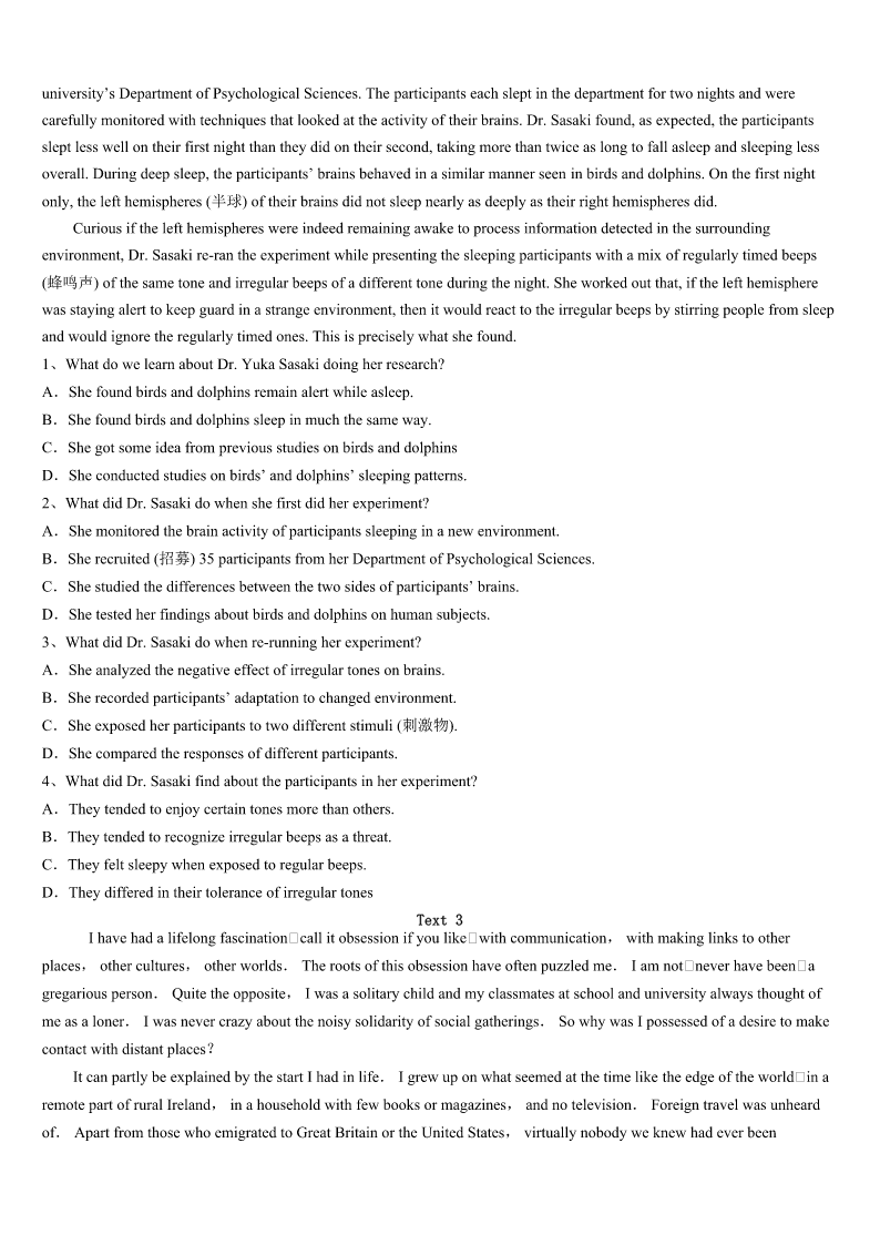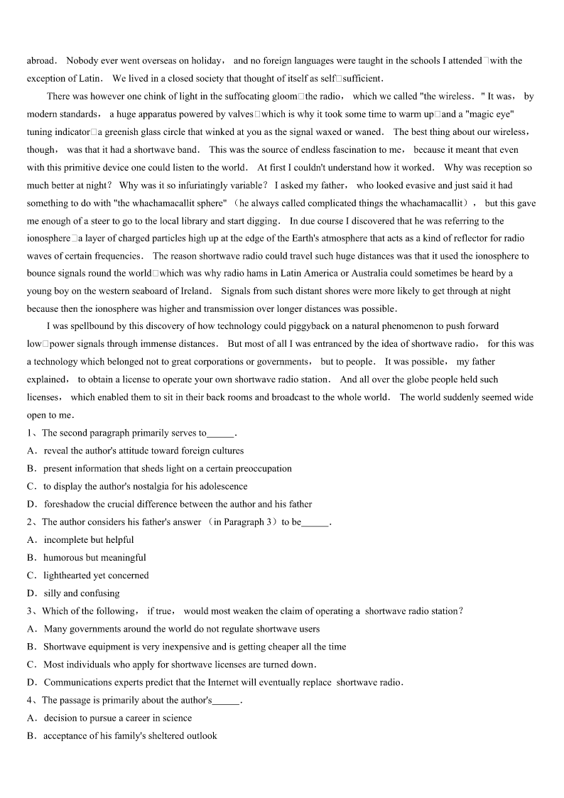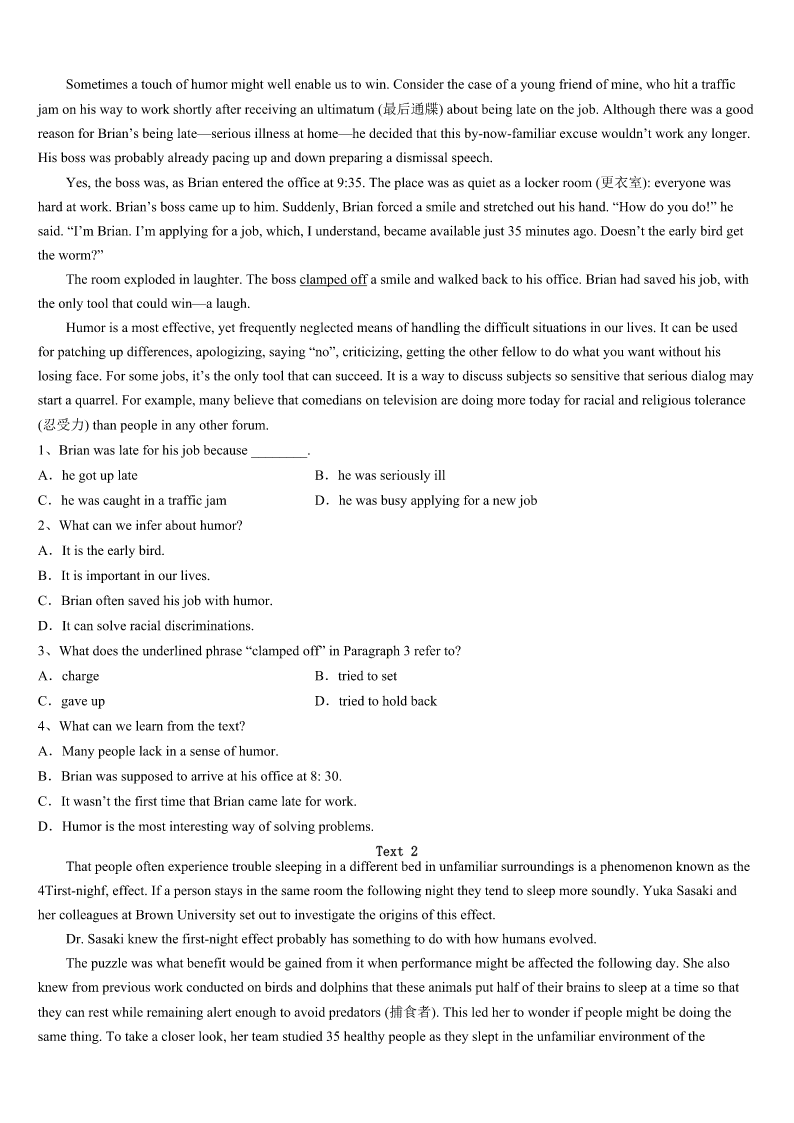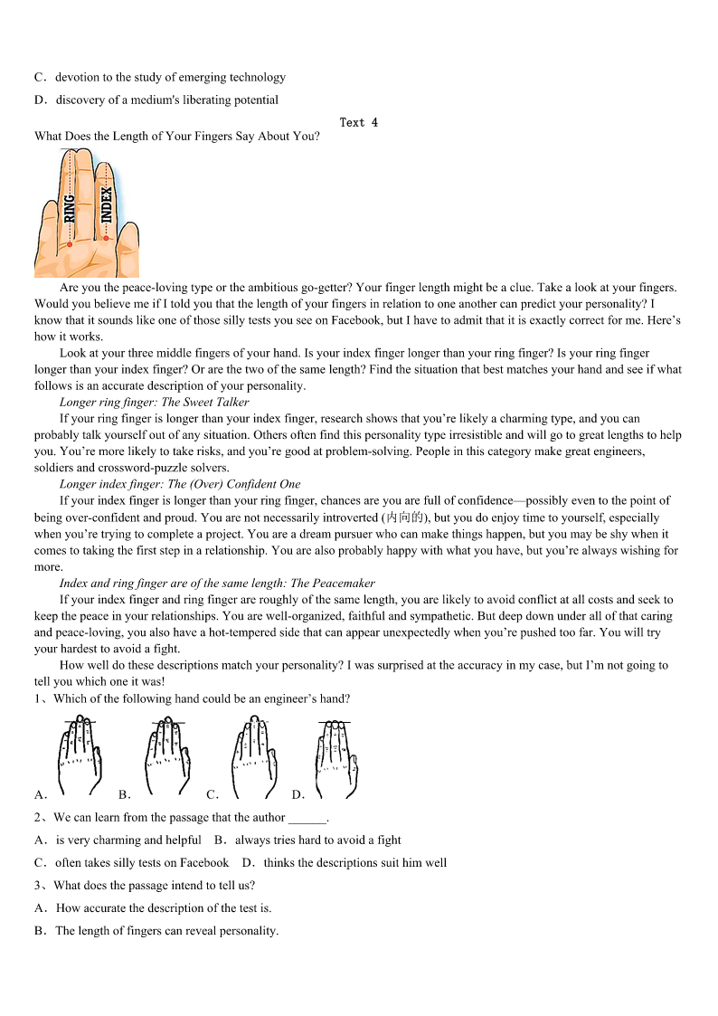 2023年广西壮族南宁市邕宁区考研《英语一》押题密卷 SectionIUseofEnglish Directions: Readthefollowingtext.Choosethebestword(s)foreachnumberedblankandmarkA,B,CorDonthe ANSWERSHEET.(10points) Agreatmanypeoplearedisappointedbecauseofunrealisticexpectations. Walkinguptoadepartmentstore’sclothcounter,a(n)1youngwomansaid,“Iwanttobuythismaterialforanewdress. Howmuchdoesitcost?” “Onlyone2peryard,”repliedthesmirking(自鸣得意的)maleclerk. Nottobetakenbackbythefunnywords,thewomansaid,”That’sfine!I’lltaketenyards.” With3writtenalloverhisface,theclerk4measuredoutandwrappedthecloth,thenhelditoutteasingly,5forwardto receivehis“6. Thewomangotthepackagequicklyfromtheclerkandpointedtoalittleoldmanstandingbesideher.“Grandpawillpaythe billinsteadofme,”she7 Hewasnodoubtdisappointed.Butinthecourseofliving,manypeopleare8whenothersdonot9theirexpectations.In ordertobehappy,someexpectationsmustbedropped.Thesethreeparticular10andunhealthyexpectationsaresomeofthe maincauses: 1.Expecttoomuch11Whenotherssay,“Thankyou,”orinanywaytoshowtheirgratitude,behappy.Itisagift! 2.Expectotherstomakeyouhappy.Theysimplycannotdothat.Makeyourselfhappyand12yourjoywithothers. 3.Expectnottobe13.Attimes,peoplewillsimplynotcomethroughforyouinthewayyouneed14themandmoveon. Getridofthesethreeunrealisticexpectationsandyoucanbegintoexpectmore15rightaway! 1、A.trickyB.attractiveC.uglyD.generous 2、A.kissB.payC.dollarD.cent 3、A.happinessB.enjoymentC.expectationD.courage 4、A.hurriedlyB.slowlyC.patientlyD.curiously 5、A.settingB.sittingC.leaningD.taking 6、A.rewardB.paymentC.bonusD.money 7、A.smiledB.beggedC.wavedD.thought 8、A.encouragedB.disappointedC.annoyedD.surprised 9、A.liveuptoB.goagainstC.gowithoutD.hopefor 10、A.reasonableB.properC.unimportantD.unrealistic 11、A.profitB.kissC.appreciationD.disappointment 12、A.spareB.shareC.makeD.control 13、A.putdownB.letdownC.takendownD.throwndown 14、A.ForgiveB.PunishC.BlameD.Praise 15、A.happinessB.encouragementC.excitementD.pride SectionIIReadingComprehension PartA Directions: Readthefollowingfourtexts.Answerthequestio