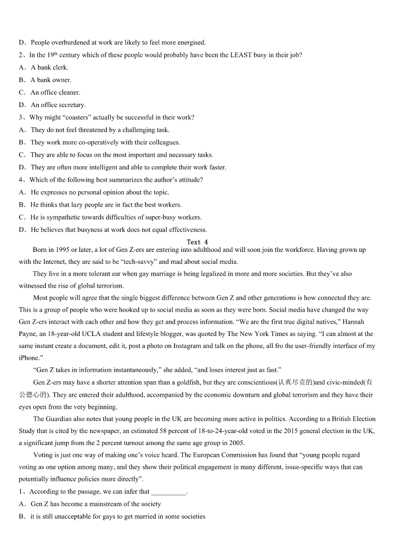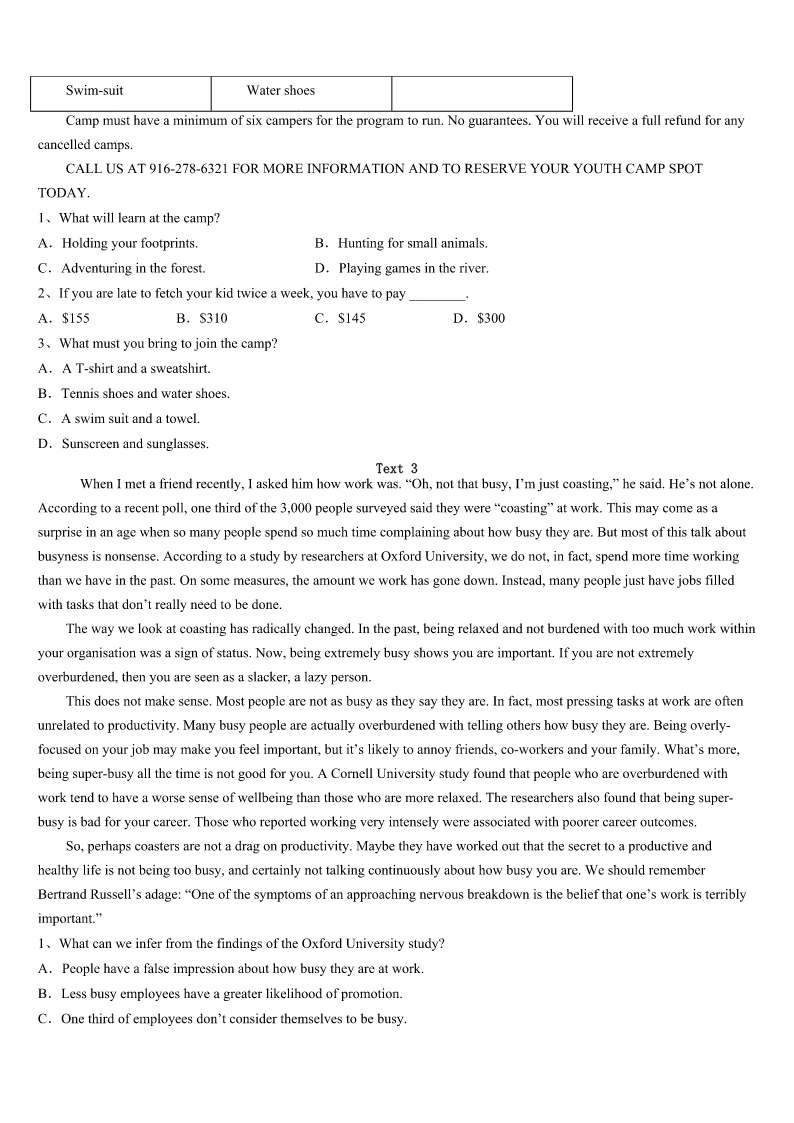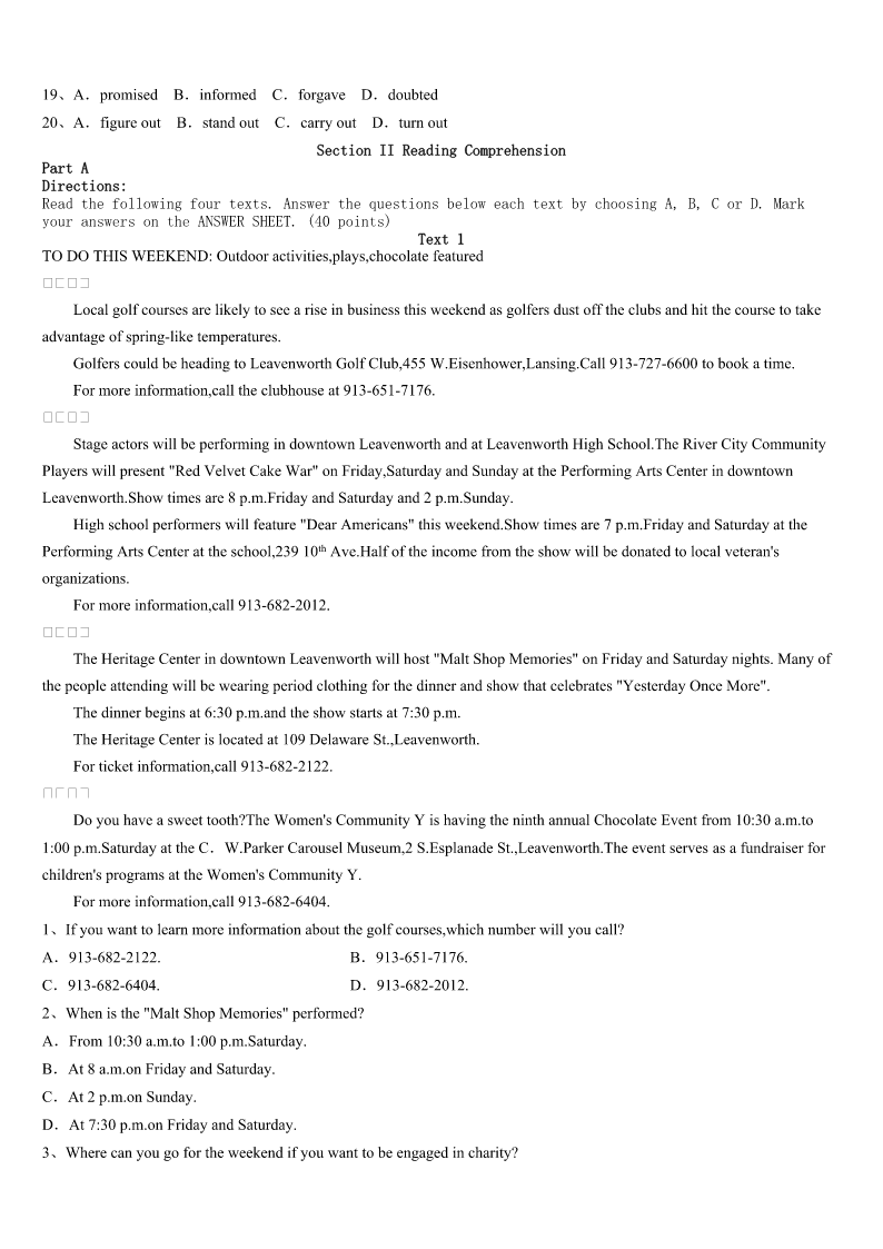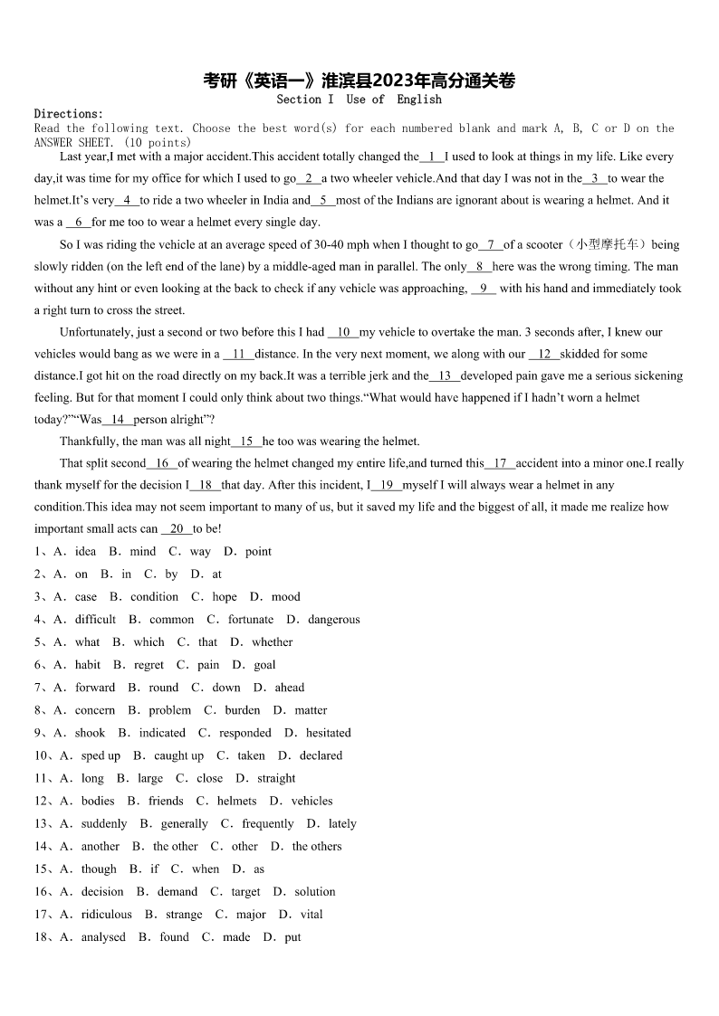 考研《英语一》淮滨县2023年高分通关卷 SectionIUseofEnglish Directions: Readthefollowingtext.Choosethebestword(s)foreachnumberedblankandmarkA,B,CorDonthe ANSWERSHEET.(10points) Lastyear,Imetwithamajoraccident.Thisaccidenttotallychangedthe1Iusedtolookatthingsinmylife.Likeevery day,itwastimeformyofficeforwhichIusedtogo2atwowheelervehicle.AndthatdayIwasnotinthe3towearthe helmet.It’svery4torideatwowheelerinIndiaand5mostoftheIndiansareignorantaboutiswearingahelmet.Andit wasa6formetootowearahelmeteverysingleday. SoIwasridingthevehicleatanaveragespeedof30-40mphwhenIthoughttogo7ofascooter(小型摩托车)being slowlyridden(ontheleftendofthelane)byamiddle-agedmaninparallel.Theonly8herewasthewrongtiming.Theman withoutanyhintorevenlookingatthebacktocheckifanyvehiclewasapproaching,9withhishandandimmediatelytook arightturntocrossthestreet. Unfortunately,justasecondortwobeforethisIhad10myvehicletoovertaketheman.3secondsafter,Iknewour vehicleswouldbangaswewereina11distance.Intheverynextmoment,wealongwithour12skiddedforsome distance.Igothitontheroaddirectlyonmyback.Itwasaterriblejerkandthe13developedpaingavemeaserioussickening feeling.ButforthatmomentIcouldonlythinkabouttwothings.“WhatwouldhavehappenedifIhadn’twornahelmet today?”“Was14personalright”? Thankfully,themanwasallnight15hetoowaswearingthehelmet. Thatsplitsecond16ofwearingthehelmetchangedmyentirelife,andturnedthis17accidentintoaminorone.Ireally thankmyselfforthedecisionI18thatday.Afterthisincident,I19myselfIwillalwayswearahelmetinany condition.Thisideamaynotseemimportanttomanyofus,butitsavedmylifeandthebiggestofall,itmademerealizehow importantsmallactscan20tobe! 1、A.ideaB.mindC.wayD.point 2、A.onB.inC.byD.at 3、A.caseB.conditionC.hopeD.mood 4、A.difficultB.commonC.fortunateD.dangerous 5、A.whatB.whichC.thatD.whether 6、A.habitB.regretC.painD.goal 7、A.forwardB.roundC.downD.ahead 8、A.concernB.problemC.burdenD.matter 9、A.shookB.indicatedC.respondedD.hesitated 10、A.spedupB.caughtupC.takenD.declared 11、A.longB.largeC.closeD.straight 12、A.bodiesB.friendsC.helme