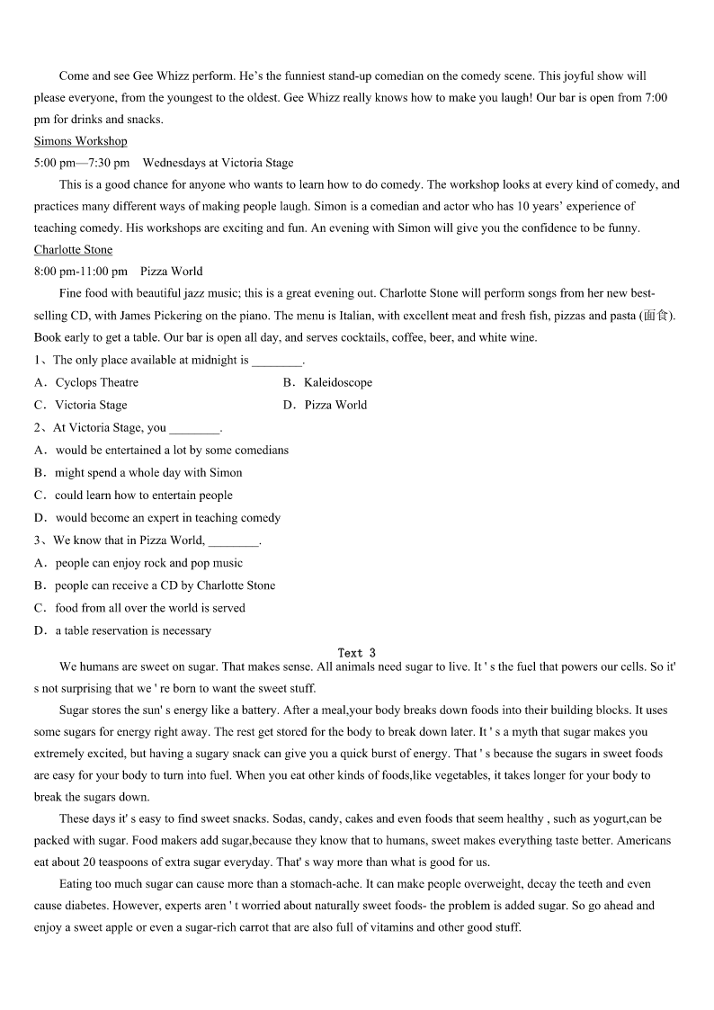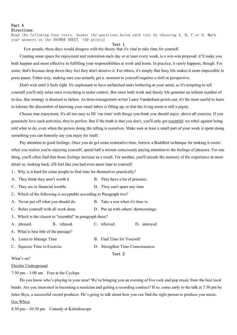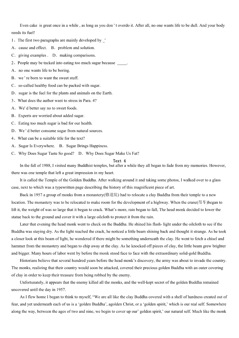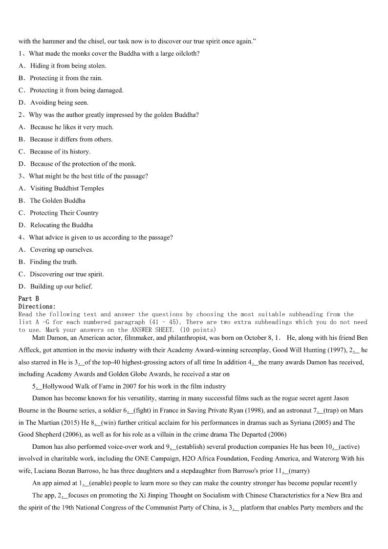 考研《英语一》湖北省咸宁市赤壁市2023年最后冲刺试题 SectionIUseofEnglish Directions: Readthefollowingtext.Choosethebestword(s)foreachnumberedblankandmarkA,B,CorDonthe ANSWERSHEET.(10points) Akindergartenteacherhaddecidedtoletherclassplayagame.Theteachertoldeachchildintheclasstobringalonga plasticbag1afewpotatoes.Eachpotatowillbe2anameofapersonthatthechildhates.Sothe3ofpotatoesthata childwillputinhis/herplasticbagwill4actuallyhowmanypeoplehe/shehates. Sowhenthe5came,everychildbroughtsomepotatoes.Somehadtwopotatoes,somethree6someuptofive potatoes.Theteacherthentoldthechildrentocarrythepotatoesintheplasticbagwiththemwherevertheygoforawhole7 . Daysafterdays8,andthechildrenstartedtocomplainduetothe9smellletoutbytherottenpotatoes.Besides, thosehavingfivepotatoesalsohadtocarry10bags.Aftersevendays,thechildrenwere11becausethegamehad finallyended. Theteacherasked:“Howdidyou12whilecarryingthepotatoeswithyou?”Thechildrenstartedcomplainingofthe troublethattheyhadto13havingtocarrythe14andsmellypotatoeswherevertheygo. Thentheteachertoldthemthehidden15behindthegame.Theteachersaid:“Thisis16thesituationwhenyou carryyourhatredforsomebodyinsideyourheart.Thestench(臭味)of17willpolluteyourheartandwithyouforever. Ifyoucannot18thesmellofrottenpotatoesforjustaweek,canyou19whatisitliketohavethestenchofhatredin yourheartforyour20?” 1、A.containingB.wrappingC.decoratingD.collecting 2、A.calledB.plantedC.madeD.given 3、A.weightB.sizeC.numberD.shape 4、A.focusonB.dependonC.leadtoD.makeup 5、A.dayB.classC.meetingD.trouble 6、A.soB.asC.becauseD.while 7、A.dayB.weekC.yearD.month 8、A.walkedB.disappearedC.passedD.ran 9、A.unpleasantB.poisonousC.sweetD.funny 10、A.shorterB.seniorC.prettierD.heavier 11、A.disappointedB.shockedC.relievedD.suspected 12、A.keepB.sayC.feelD.make 13、A.putoutB.gothroughC.catchupD.insiston 14、A.uglyB.numerousC.hugeD.heavy 15、A.meaningB.feelingC.emotionsD.kindness 16、A.hardlyB.slightlyC.exactlyD.partly 17、A.potatoesB.hatredC.wordsD.dirt 18、A.produceB.smellC.carryD.tolerate 19、A.imagineB.analyzeC.agreeD.declare 2