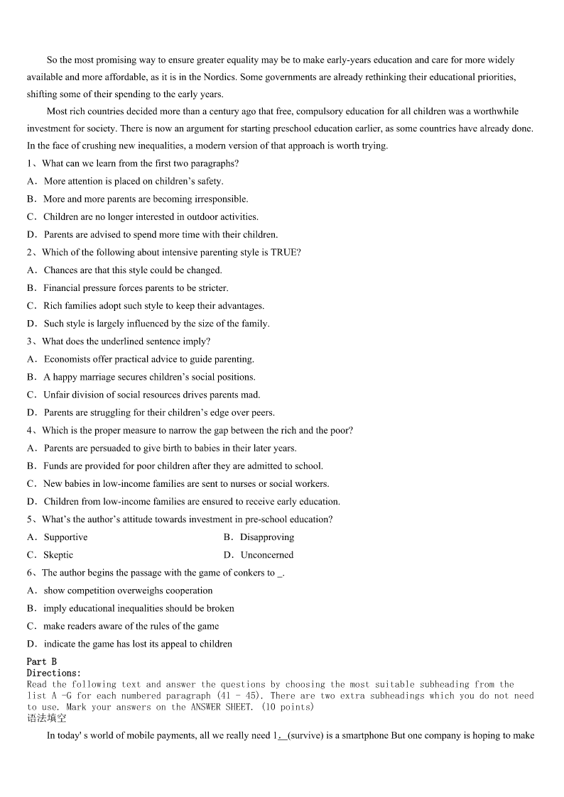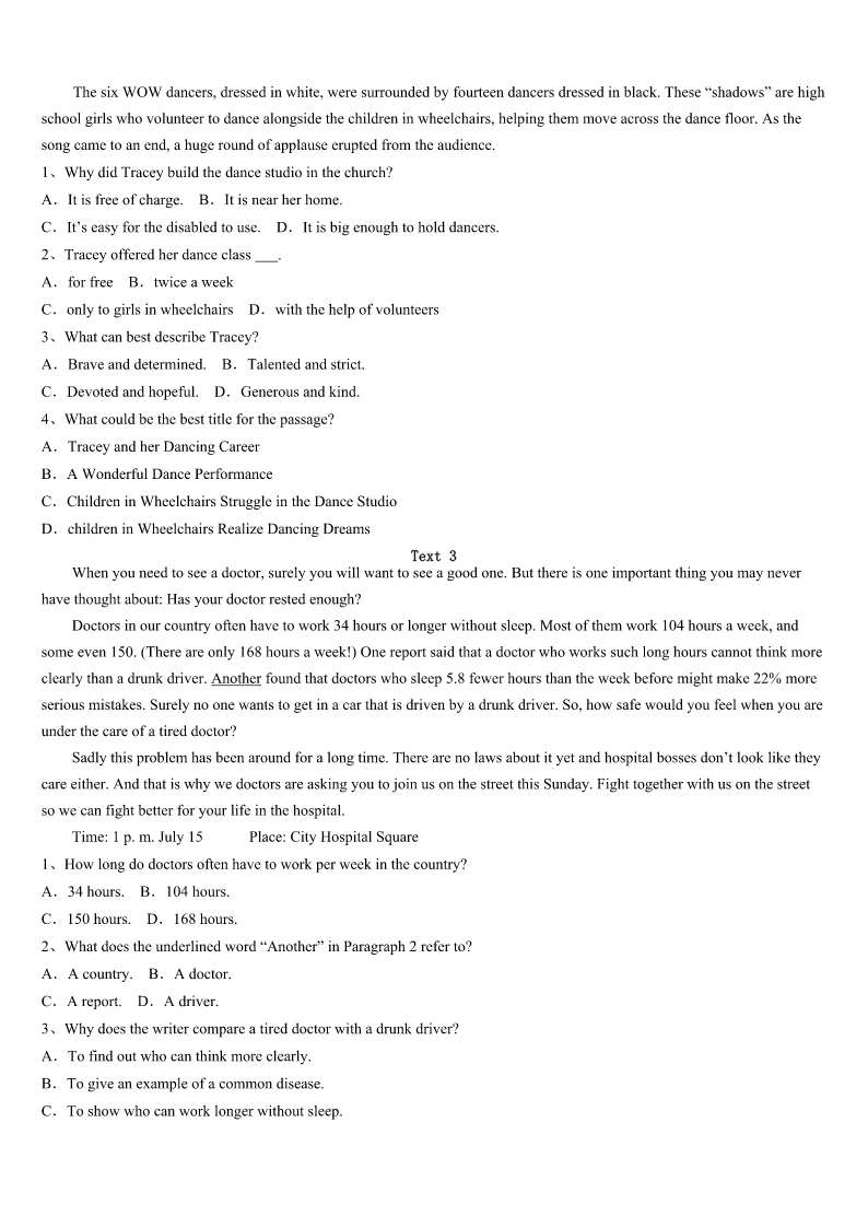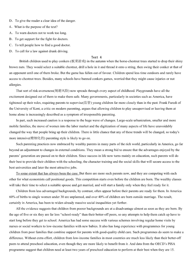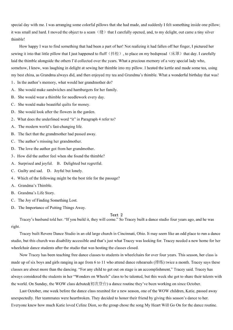 考研《英语一》湖北省黄石市大冶市2023年最后冲刺试题 SectionIUseofEnglish Directions: Readthefollowingtext.Choosethebestword(s)foreachnumberedblankandmarkA,B,CorDonthe ANSWERSHEET.(10points) Inthismodernworld,werusharoundalldaywithnotimeforstillness.Andwhenweare1tobestill,we'reinlinefor something,orwaitingatadoctor'sappointment,oronabusortrain.Thiscomesata2:welosethattimeforconsideration, forobservingandlistening.Welosepeace.And3yet:sometimesnoactionisbetterthantoomuchactionatall.Youcanrun aroundcrazily,butgetnothingdone.Takeamomenttothinkabouthowyouspendyourdays?Areyoualways4through yourschedule? Isthishowyouwanttospendyourlife?Ifnot,takeamomenttobestill.Don'tthinkaboutwhatyouhavetodo,orwhatyou've donealready.5beinthemoment.Thenafteraminuteortwoofdoingthat,consideryour6,andhowyou'dlikeittobe. Seeyourlifewithlessmovementandlessrushing.Seeitwithmorestillnessandmorepeace.It'sprettysimple:allyouhaveto doissitstillforalittlebiteachday.Onceyou'vegot7tothat,trydoinglesseachday.Findhappinessnow,inthismoment, insteadofwaitingforit. Valuethestillness.It'satreasureandit's8tous,always. 1、A.forcedB.orderedC.invitedD.told 2、A.costB.riskC.lossD.danger 3、A.laterB.worseC.betterD.deeper 4、A.breakingB.rushingC.livingD.going 5、A.NearlyB.EverC.JustD.Already 6、A.lifeB.beliefC.roadD.future 7、A.addictedB.accustomedC.permittedD.ready 8、A.availableB.convenientC.potentialD.reasonable SectionIIReadingComprehension PartA Directions: Readthefollowingfourtexts.AnswerthequestionsbeloweachtextbychoosingA,B,CorD.Mark youranswersontheANSWERSHEET.(40points) Text1 IamastonishedatthewayGodknowswhentosendaspecialgiftofencouragementatjusttherighttime!Itmightbeina dream,alostletter,amemory,orsomethingfoundthatwe’dforgottenabout. MygrandmotherwasfromatowninMichigan.AndsummeraftersummerIenjoyedstayingwithmygrandparentsasa youngchild.Iwasfromthecityandlovedthesmalltownwheretheylived.Peoplekneweveryone,theirchildren,theirpets, theirancestors. Grandmawasalwaysusingherhandsforsomethingexciting...shewouldmakesandwichesandwe’dhaveteapart