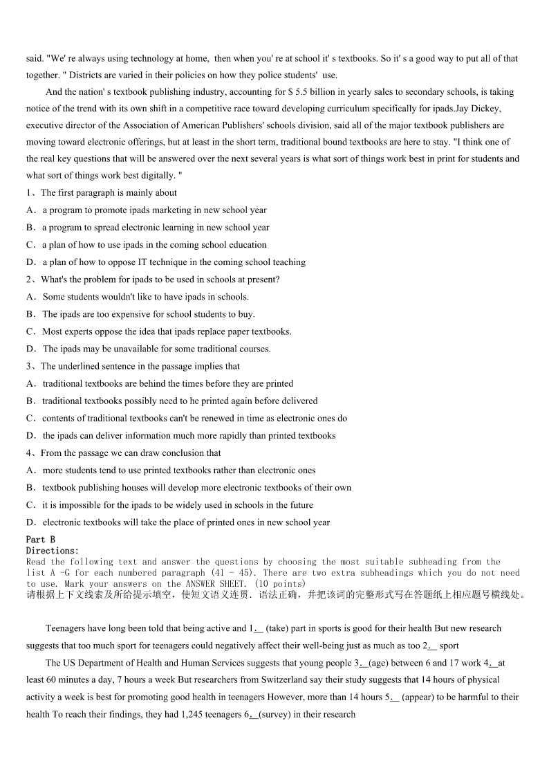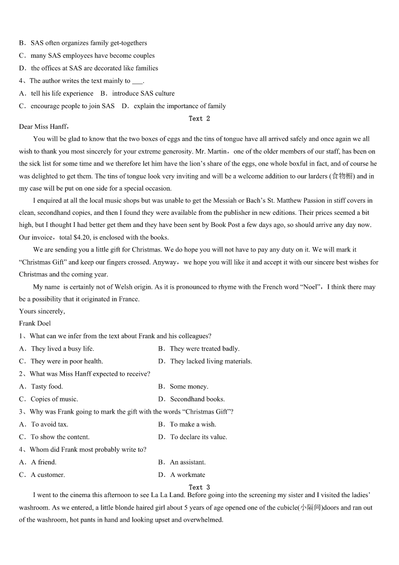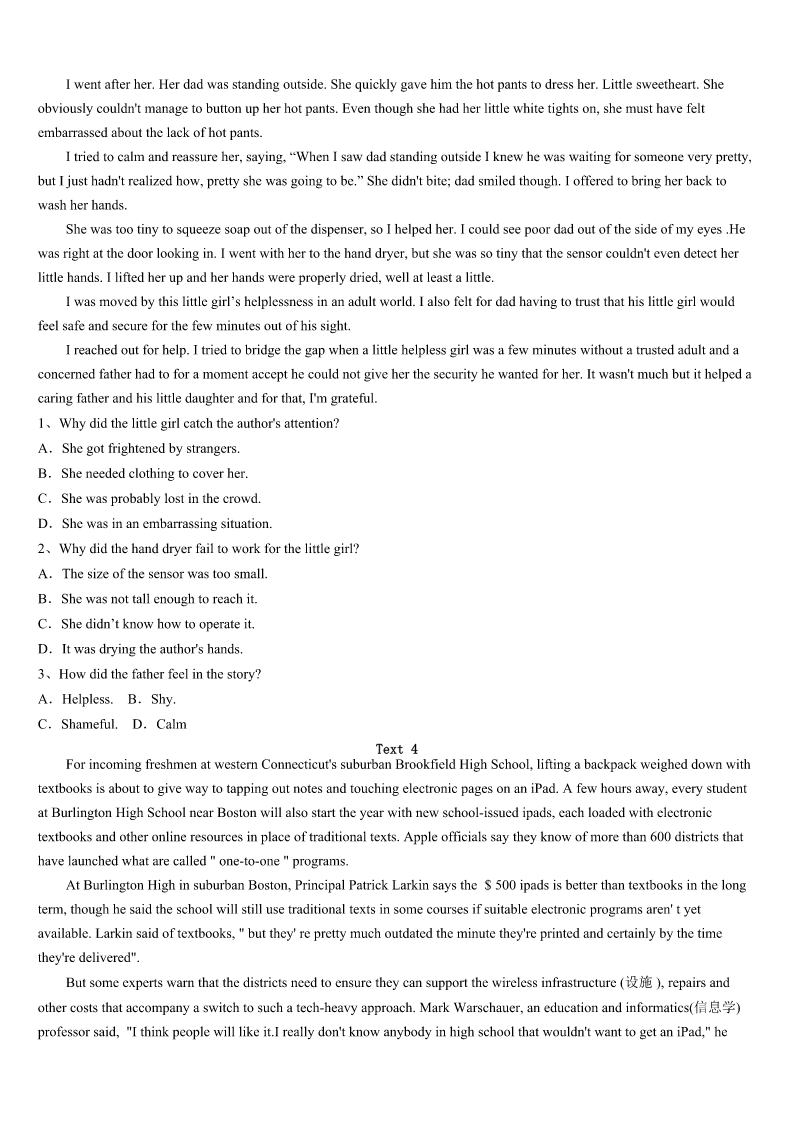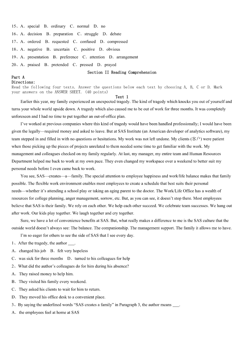 考研《英语一》湖北省宜昌市长阳土家族自治县2023年临考冲刺试题 SectionIUseofEnglish Directions: Readthefollowingtext.Choosethebestword(s)foreachnumberedblankandmarkA,B,CorDonthe ANSWERSHEET.(10points) III.完形填空(共20小题;每小题1.5分),满分30分) 阅读下面短文,掌握其大意,然后从36-55各题所给的四个选项(A,B,C和D)中,选出最佳选项。 Oneday,apoorboywhowastryingtopayhiswaythroughschoolbysellinggoodsfromdoortodoorfoundthatheonly hadonedimeleft.Hewashungrysohedecidedto21foramealatthenexthouse. However,helosthisnerve22alovelyyoungwomanopenedthedoor.Insteadofamealheaskedforadrinkofwater. Shethoughthelooked23soshebroughthimalargeglassofmilk.Hedrankit24,andthenasked,“HowmuchdoI oweyou?” “Youdon’towemeanything,”she25.“Motherhastaughtmenevertoacceptpayfora _26.”Hesaid,“ThenIthankyoufromthebottomofmyheart.”AsHowardKellyleftthathouse,henotonlyfeltstronger 27,butitalsoincreasedhisfaithinGodandhumanrace.Hewasabouttogiveupandquitbeforethispoint. Yearslatertheyoungwomanbecamecriticallyill.Thelocaldoctorswerebaffled.Theyfinallysenthertothebigcity,where specialistscanbecalled28tostudyherraredisease.Dr.HowardKelly,now29,wascalledinfortheconsultation. Whenheheardthenameofthetownshecamefrom,astrangelight30hiseyes.Immediately,he31andwentdown throughthehospitalhallintoherroom. 32inhisdoctor’sgownhewentintoseeher.He33heratonce.Hewentbacktotheconsultationroomand34to dohisbesttosaveherlife.Fromthatdayon,hegave35__attentiontohercase. Afteralong36thebattlewaswon.Dr.Kelly37thebusinessofficetopassthefinalbilltohimforapproval.He lookedatitandthenwrotesomethingontheside.Thebillwassenttoherroom.Shewasafraidtoopenitbecauseshewas 38thatitwouldtaketherestofherlifetopayitoff.Finallyshelooked,andthenoteonthesideofthebillcaughther39. Shereadthesewords… “Paidinfullwithaglassofmilk.”Dr.HowardKelly Tearsofjoyfloodedhereyesasshe40silently.“Thankyou,God.Yourlovehasspreadthroughhumanheartsandhands.” 1、A.callB.makeC.begD.prepare 2、A.whileB.whenC.thoughD.unless 3、A.thirstyB.lazyC.tiredD.hungry 4、A.slowlyB.unexpectedlyC.steadilyD.hurriedly 5、A.announcedB.shookC.repliedD.doubted 6、A.rewardB.kindn