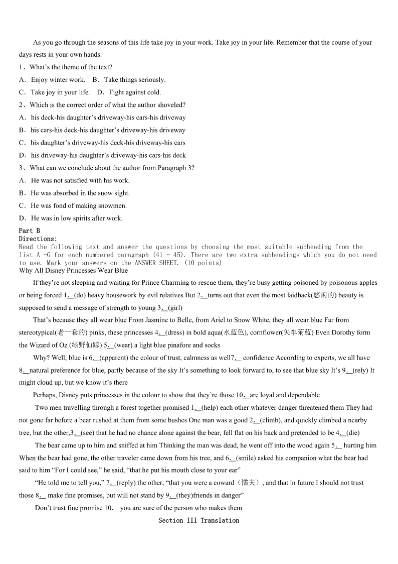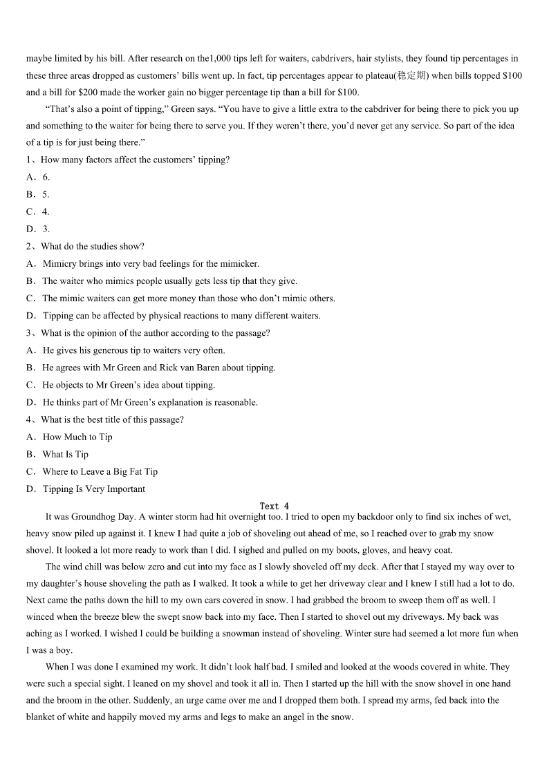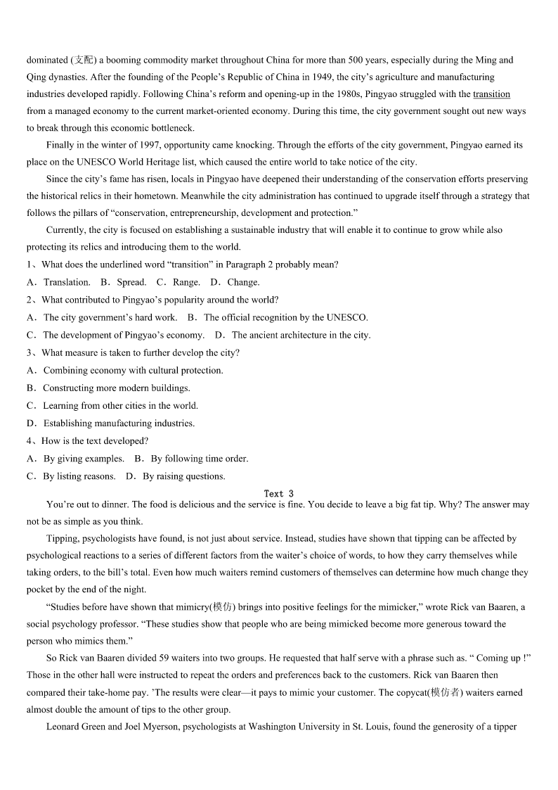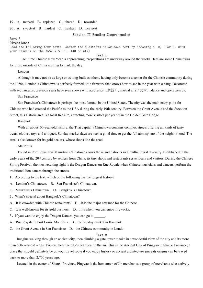 考研《英语一》温州市苍南县2023年高分冲刺试卷 SectionIUseofEnglish Directions: Readthefollowingtext.Choosethebestword(s)foreachnumberedblankandmarkA,B,CorDonthe ANSWERSHEET.(10points) TheSweetestThing WhenIwasten,Iwascrazyaboutcandy.Wheneverinoursmall-town1withmymom,Iwouldrunmyfingers throughmyfavoritecandyontheshelf. Oncethere,thinkingaboutallthingssweet,InoticedamanafewfeetawaypushingbuttonsontheATMmachine. Dressedinasuit,heseemedtobelateforsomething,2waitingforhiscashtoappear.Themachinemadeanoise,andhe immediately3apileofbillsandheadedout.Curiously,IwalkedovertotheATM,whereIstartedpressingthebuttonsasif knowingthe4.ThenIlookedintothebottomofthemachine.ThereIsawit:abeautiful,crisp$20bill!5Iwantedto believemymagicmadethecashappear,Iknewthemaninthesuitmusthaveleftitbehind. Iheldthemoneyinmyhand,staringatthenumber“20”andfeeling6thanIeverhad.Ithoughtaboutslippingthe moneyintomypocket.Noonewouldknow,butitdidn’tfeel7.Iknewitdidn’tbelongtome.Ihadtofinditsownerand giveitback!SoItoldmymomwhathadhappened.“We’lllookforhim.”shesaidkindly.Werushedoutandfoundhim steppingintohiscarintheparkinglot!We8himandaskedwhetherhehadleftmoneyatthecashmachine. “Letme9,”hesaid,pullingouthiswalletandbills.“Twenty,forty,eighty…Oh!You’reright,”hesaidwithsurprise, “I’m10a$20bill.” “Hereyougo,”Isaid,smilingwithpride,asifIwasa(n)11whohadsolvedamystery.“Thankyousomuch,”hesaid, bendingdownandshakingmyhand.Myheart12.Beforesayinggoodbye,heaskedmymomformynameand13.“I wanttosendyourdaughterathank-youcard,”hesaid. Onmywayhome,my14wasracing.Twentydollars.WhatcouldIhavedonewithit?IbetIcouldhaveboughta puppyoreverysinglecandybarintown!Butnow15ofthatwouldhappen.YetIknewIhaddonetherightthing. Afewweekslater,Igotaboxwithanote.Irippeditopentofindpackagesofcandy. “DearFelice,Thankyouverymuchfor16my$20.Youareagreatgirl,andIappreciateyour17.Ihopeyouenjoy thiscandy.BestWishes,Tom.”Tomincludedhisbusinesscard.Itturnedouthewasvice-presidentforthecandycompany.The candytastedsweet,each18remindingmethatwhatIhaddonemattered.Althoughmyhonestyw
