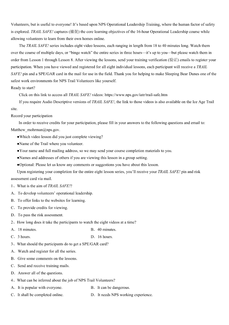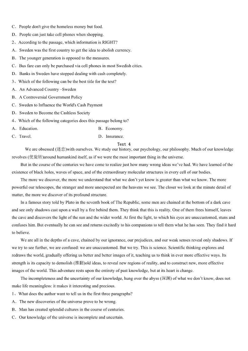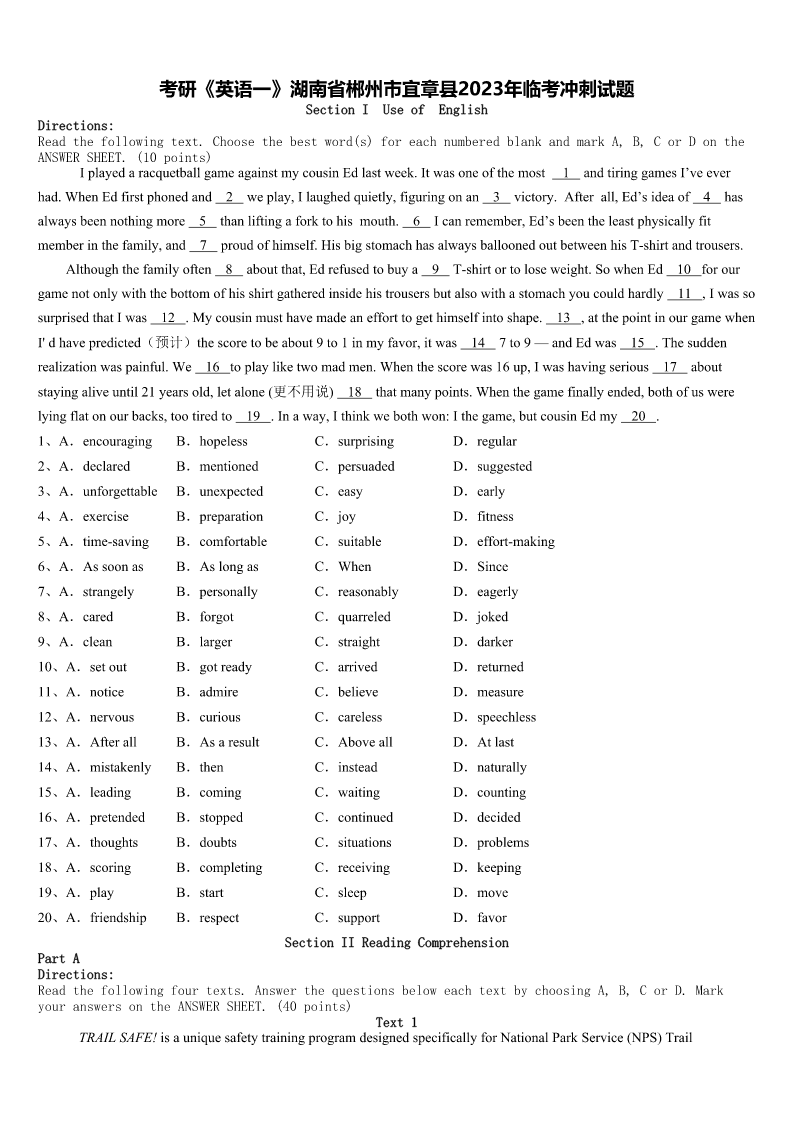 考研《英语一》湖南省郴州市宜章县2023年临考冲刺试题 SectionIUseofEnglish Directions: Readthefollowingtext.Choosethebestword(s)foreachnumberedblankandmarkA,B,CorDonthe ANSWERSHEET.(10points) IplayedaracquetballgameagainstmycousinEdlastweek.Itwasoneofthemost1andtiringgamesI’veever had.WhenEdfirstphonedand2weplay,Ilaughedquietly,figuringonan3victory.Afterall,Ed’sideaof4has alwaysbeennothingmore5thanliftingaforktohismouth.6Icanremember,Ed’sbeentheleastphysicallyfit memberinthefamily,and7proudofhimself.HisbigstomachhasalwaysballoonedoutbetweenhisT-shirtandtrousers. Althoughthefamilyoften8aboutthat,Edrefusedtobuya9T-shirtortoloseweight.SowhenEd10forour gamenotonlywiththebottomofhisshirtgatheredinsidehistrousersbutalsowithastomachyoucouldhardly11,Iwasso surprisedthatIwas12.Mycousinmusthavemadeanefforttogethimselfintoshape.13,atthepointinourgamewhen I'dhavepredicted(预计)thescoretobeabout9to1inmyfavor,itwas147to9—andEdwas15.Thesudden realizationwaspainful.We16toplayliketwomadmen.Whenthescorewas16up,Iwashavingserious17about stayingaliveuntil21yearsold,letalone(更不用说)18thatmanypoints.Whenthegamefinallyended,bothofuswere lyingflatonourbacks,tootiredto19.Inaway,Ithinkwebothwon:Ithegame,butcousinEdmy20. 1、A.encouragingB.hopelessC.surprisingD.regular 2、A.declaredB.mentionedC.persuadedD.suggested 3、A.unforgettableB.unexpectedC.easyD.early 4、A.exerciseB.preparationC.joyD.fitness 5、A.time-savingB.comfortableC.suitableD.effort-making 6、A.AssoonasB.AslongasC.WhenD.Since 7、A.strangelyB.personallyC.reasonablyD.eagerly 8、A.caredB.forgotC.quarreledD.joked 9、A.cleanB.largerC.straightD.darker 10、A.setoutB.gotreadyC.arrivedD.returned 11、A.noticeB.admireC.believeD.measure 12、A.nervousB.curiousC.carelessD.speechless 13、A.AfterallB.AsaresultC.AboveallD.Atlast 14、A.mistakenlyB.thenC.insteadD.naturally 15、A.leadingB.comingC.waitingD.counting 16、A.pretendedB.stoppedC.continuedD.decided 17、A.thoughtsB.doubtsC.situationsD.problems 18、A.scoringB.completingC.receivingD.keeping 19、A.playB.startC.sleepD.move 20、A.friendshipB.resp