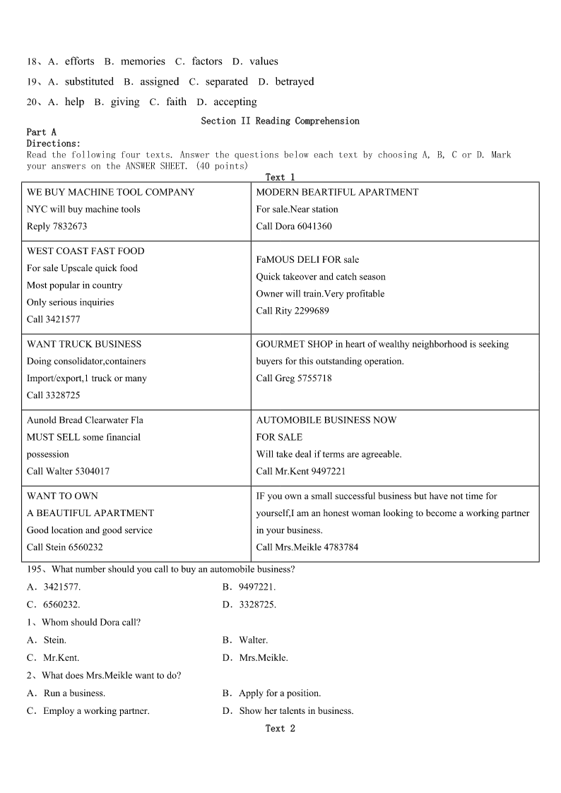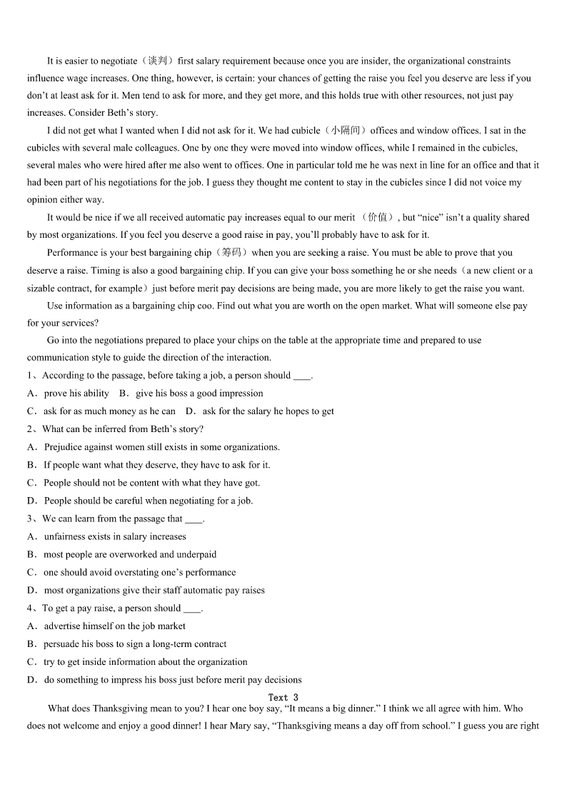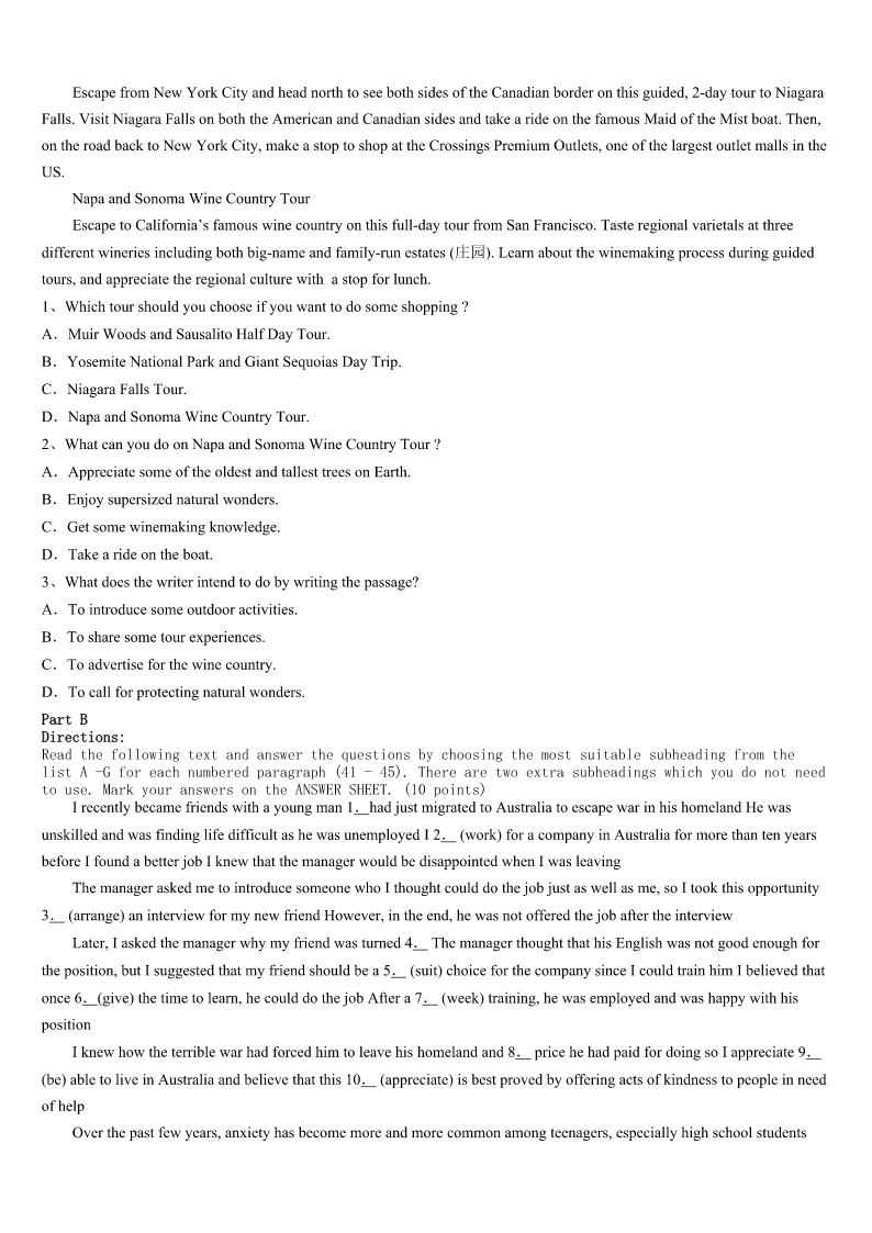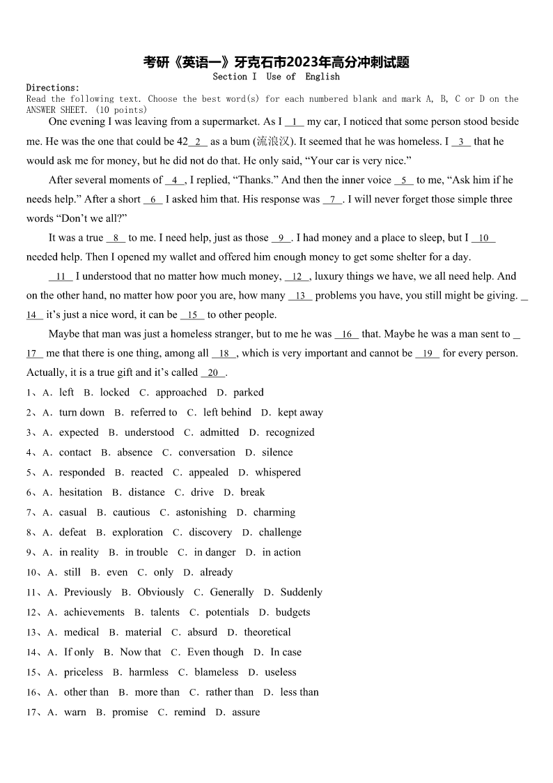 考研《英语一》牙克石市2023年高分冲刺试题 SectionIUseofEnglish Directions: Readthefollowingtext.Choosethebestword(s)foreachnumberedblankandmarkA,B,CorDonthe ANSWERSHEET.(10points) OneeveningIwasleavingfromasupermarket.AsI1mycar,Inoticedthatsomepersonstoodbeside me.Hewastheonethatcouldbe422asabum(流浪汉).Itseemedthathewashomeless.I3thathe wouldaskmeformoney,buthedidnotdothat.Heonlysaid,“Yourcarisverynice.” Afterseveralmomentsof4,Ireplied,“Thanks.”Andthentheinnervoice5tome,“Askhimifhe needshelp.”Afterashort6Iaskedhimthat.Hisresponsewas7.Iwillneverforgetthosesimplethree words“Don’tweall?” Itwasatrue8tome.Ineedhelp,justasthose9.Ihadmoneyandaplacetosleep,butI10 neededhelp.ThenIopenedmywalletandofferedhimenoughmoneytogetsomeshelterforaday. 11Iunderstoodthatnomatterhowmuchmoney,12,luxurythingswehave,weallneedhelp.And ontheotherhand,nomatterhowpooryouare,howmany13problemsyouhave,youstillmightbegiving. 14it’sjustaniceword,itcanbe15tootherpeople. Maybethatmanwasjustahomelessstranger,buttomehewas16that.Maybehewasamansentto 17methatthereisonething,amongall18,whichisveryimportantandcannotbe19foreveryperson. Actually,itisatruegiftandit’scalled20. 1、A.leftB.lockedC.approachedD.parked 2、A.turndownB.referredtoC.leftbehindD.keptaway 3、A.expectedB.understoodC.admittedD.recognized 4、A.contactB.absenceC.conversationD.silence 5、A.respondedB.reactedC.appealedD.whispered 6、A.hesitationB.distanceC.driveD.break 7、A.casualB.cautiousC.astonishingD.charming 8、A.defeatB.explorationC.discoveryD.challenge 9、A.inrealityB.introubleC.indangerD.inaction 10、A.stillB.evenC.onlyD.already 11、A.PreviouslyB.ObviouslyC.GenerallyD.Suddenly 12、A.achievementsB.talentsC.potentialsD.budgets 13、A.medicalB.materialC.absurdD.theoretical 14、A.IfonlyB.NowthatC.EventhoughD.Incase 15、A.pricelessB.harmlessC.blamelessD.useless 16、A.otherthanB.morethanC.ratherthanD.lessthan 17、A.warnB.promiseC.remindD.assure 18、A.effortsB.memoriesC.factorsD.values 19、A.substitutedB.assignedC.separatedD.betrayed 20、A.helpB.givingC.faithD.accepting SectionIIRead