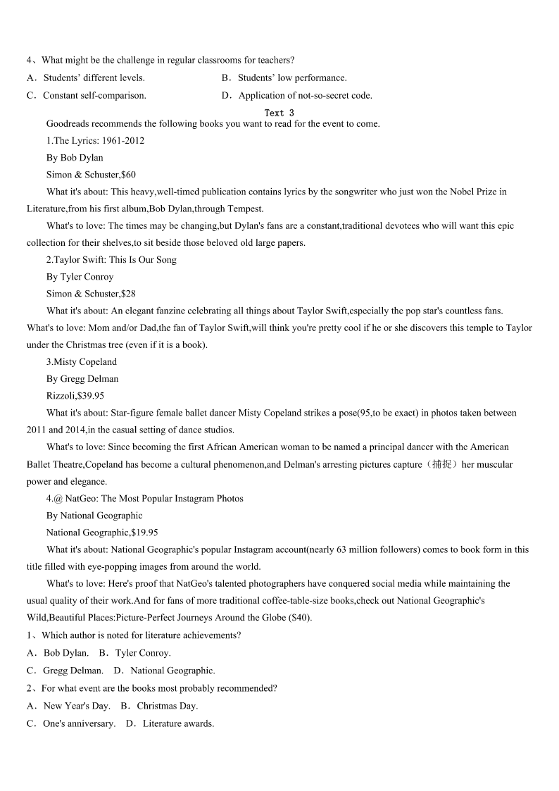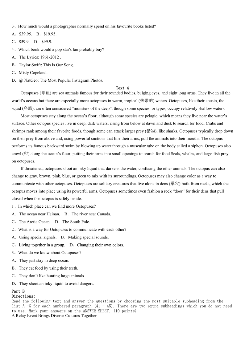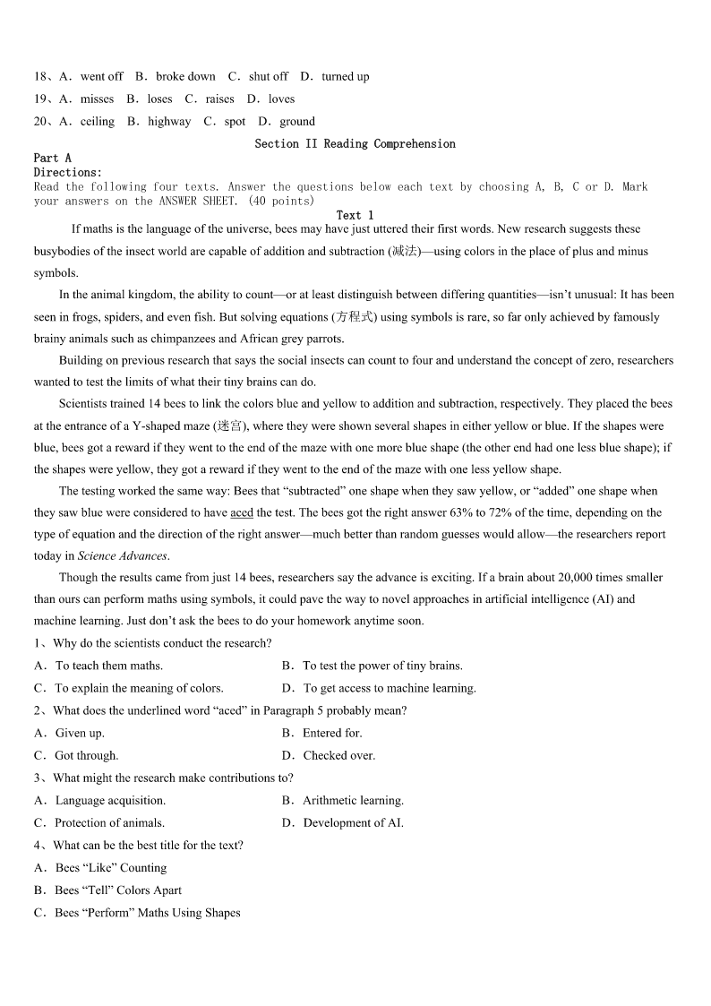 考研《英语一》玉林市北流市2023年深度自测卷 SectionIUseofEnglish Directions: Readthefollowingtext.Choosethebestword(s)foreachnumberedblankandmarkA,B,CorDonthe ANSWERSHEET.(10points) AngelaFullmeralreadyhadenoughtohandle.She’drecentlycompletedherbachelor’sdegreeandshehadgivenbirthto her1babyAtreyujustthreemonthsbefore. Soat1:30a.m.March15,whenherdogCaponewasbarking2intheirhome,sheyelled,“Shutup!You’regoingto 3thebaby.” Hewouldn’t4. ShecalledforCaponetocometoher. Hewouldn’tcome. Thedog5comes,shesaid,eversincesheandhusband,Isaac,6thewanderinganimalfromabusyhighway18 monthsago. Caponejustlookedatherandranbacktothe7. Fullmer,32—whohasa8aboutdogs—thoughtsomethingwasn’t9.Tiredasshewas,shewentto10what wasgoingoninthekitchen. Theplugforthemicrowavewasonfire.Thefireseemed11atfirst,butsheknewsheneededtogetthe12outfast. Shescoopedupher13babyAtreyu,andthengrabbedher20-month-oldtoddlerMondecai.Sheyelledforheroldest, Landon,12,tohelp14theotherchildren. Bythetimemostofthechildrenwereheadingout.15shotuptothekitchenceilingandthesmokealarm16went off.Shecalled911anddidarollcall.Herninechildrenwereall17outsidethehouse. Capone?Hehadbarkedandbarkedfortwominutesbeforethefirealarmeven18.Hehadsavedtheirlives. “He19hisfamily,”Fullmersaid.“I’mgladwefoundhimonthe20.” 1、A.firstB.ninthC.healthyD.sleepy 2、A.asuaualB.onpurposeC.likecrazyD.atrandom 3、A.wakeB.feedC.protectD.milk 4、A.shutupB.showupC.listenupD.wakeup 5、A.seldomB.hardlyC.alwaysD.rarely 6、A.huntedB.purchasedC.trappedD.rescued 7、A.gardenB.kitchenC.bathroomD.bedroom 8、A.doubtB.curiosityC.senseD.puzzle 9、A.trueB.sureC.strangeD.right 10、A.checkoutB.setdownC.tellaboutD.thinkup 11、A.fierceB.dangerousC.openedD.small 12、A.dogB.cookersC.kidsD.plug 13、A.cleverestB.weakestC.youngestD.strongest 14、A.examineB.gatherC.cureD.educate 15、A.floodB.fogC.cloudsD.flames 16、A.finallyB.immediatelyC.graduallyD.causally 17、A.afraidB.presentC.injuredD.awake 18、A.wentoffB.brokedownC.shutoffD.turnedup 19、A.missesB.losesC.raisesD.loves 20、A.ceilingB.highwayC.spotD.ground SectionIIRead