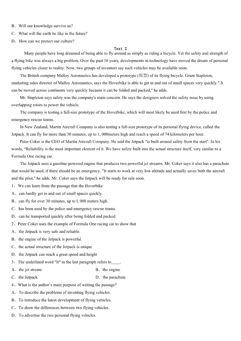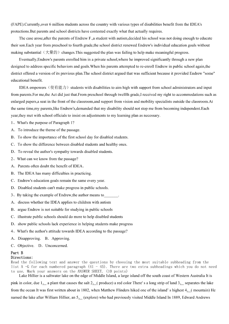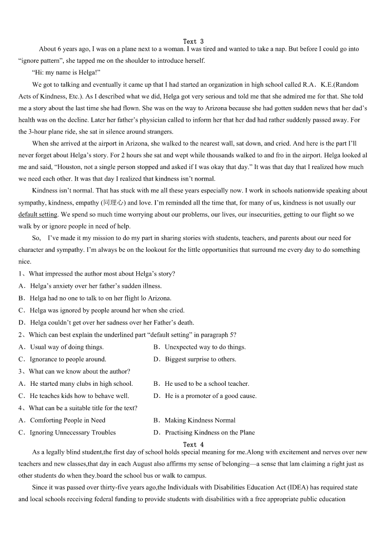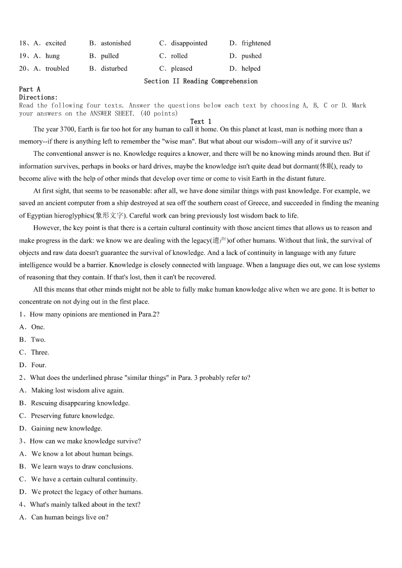 考研《英语一》琼海市2023年考前冲刺预测试卷 SectionIUseofEnglish Directions: Readthefollowingtext.Choosethebestword(s)foreachnumberedblankandmarkA,B,CorDonthe ANSWERSHEET.(10points) Howdidyoudoit,Dad?Howhaveyoumanagednottotakeadrinkforalmost20years?Ittookmealmost20yearsto havethe1toevenaskmyfatherthisverypersonalquestion.WhenDadfirst2drinking,thewholefamilywasonpins andneedleseverytimehegotintoa3that,inthepast,wouldhavestartedhim4again.Forafewyearswewere5to bringitupforfearthatthedrinkingwouldbeginagain. “IhadthislittlepoemthatIwouldrecitetomyselfatleastfourtofivetimesaday,”wasDad’s6tomy18-year-old unaskedquestion.“Thewordswereaconstant7tomethatthingswere8sohardthatIcouldnotdealwiththem,”Dad said.Thenhe9thepoemwithme.Thepoem’s10,yetprofoundwordsimmediatelybecame11ofmydailyroutine aswell. Aboutamonthafterthis12withmyfather,Ireceivedagiftinthemailfromafriendofmine.Itwasabookofdaily sayingsofwisdomwithone13foreachdayoftheyear. Ithasbeenmy14thatwhenyougetsomethingwithdaysoftheyearonit,younaturallyturntothepagethatlistsyour own15. I16openedthebooktoNovember10tosee17wordsofwisdomthisbookhadinstoreforme.Iwas18when Ilookedatthepage,andthentearsofdisbeliefandappreciation19downmyface.There,onmybirthday,wastheexact samepoemthathad20myfatherforalltheseyears!ItiscalledtheSerenity(平静)Prayer. Godgrantme theserenitytoacceptthethingsIcannotchange; thecouragetochangethethingsIcan; andthewisdomtoknowthedifference. 1、A.chanceB.courageC.abilityD.right 2、A.gaveupB.tookupC.wentonD.carriedon 3、A.wayB.habitC.situationD.house 4、A.recitingB.askingC.smokingD.drinking 5、A.sureB.uncertainC.afraidD.eager 6、A.replyB.wordsC.excuseD.explanation 7、A.fearB.imaginationC.thoughtD.reminder 8、A.neverB.seldomC.alwaysD.ever 9、A.discussedB.sharedC.offeredD.talked 10、A.wonderfulB.longC.simpleD.boring 11、A.allB.thatC.anyD.part 12、A.talkB.quarrelC.tripD.lesson 13、A.listedB.includedC.readD.said 14、A.methodB.experienceC.wealthD.message 15、A.characterB.birthdayC.qualitiesD.favorites 16、A.doubtfullyB.carefullyC.happilyD.hurriedly 17、A