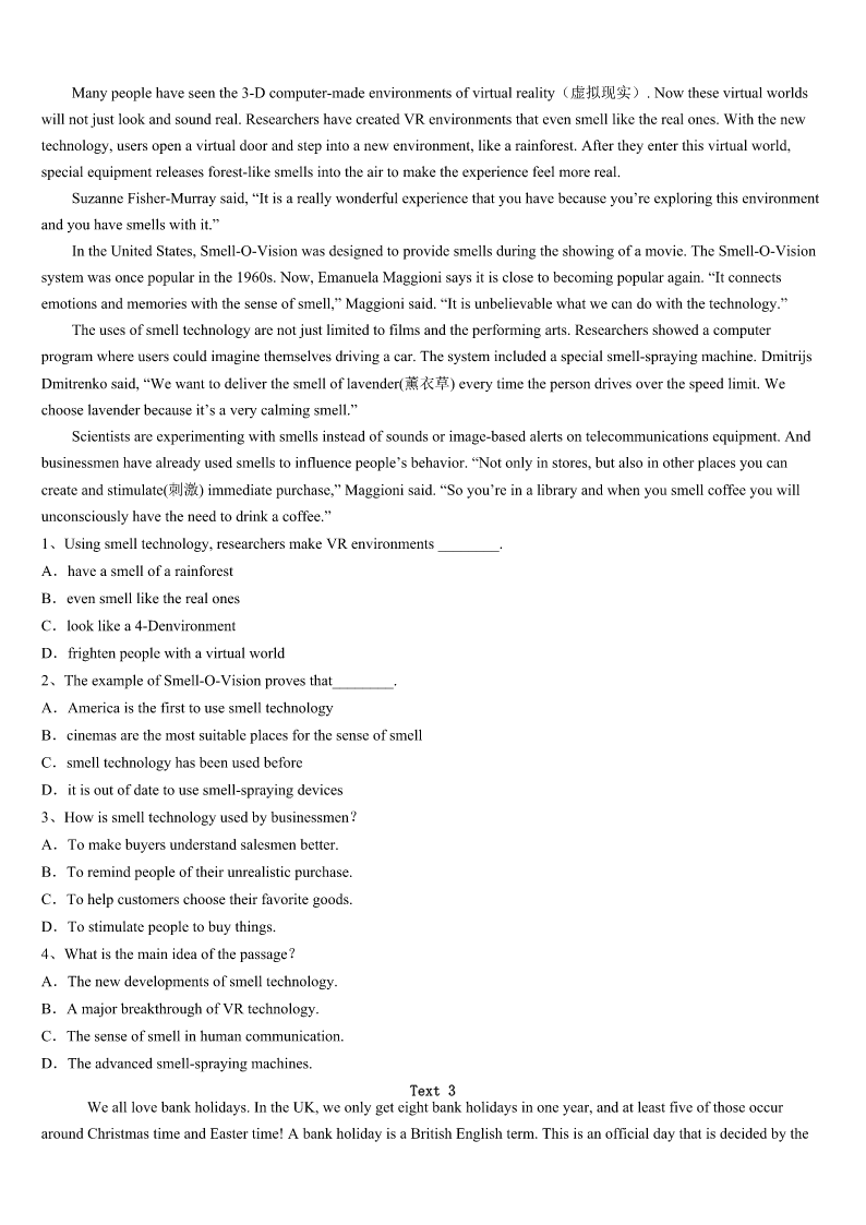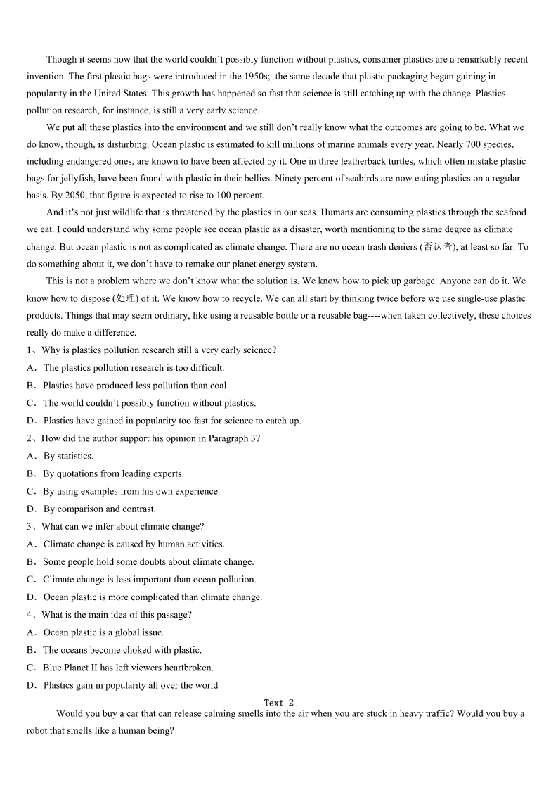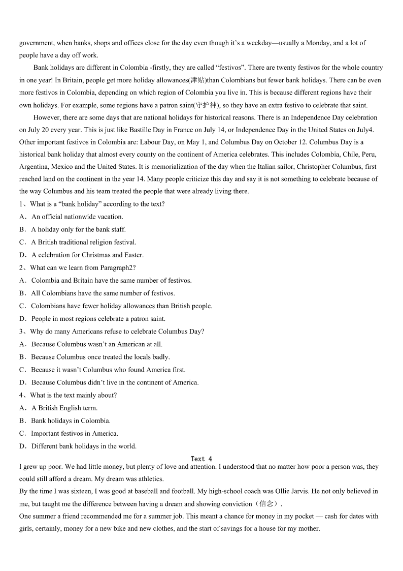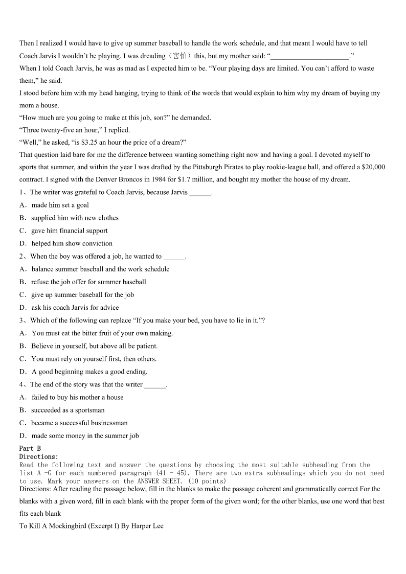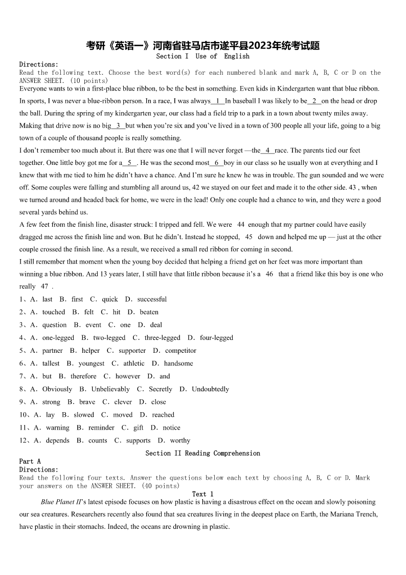 考研《英语一》河南省驻马店市遂平县2023年统考试题 SectionIUseofEnglish Directions: Readthefollowingtext.Choosethebestword(s)foreachnumberedblankandmarkA,B,CorDonthe ANSWERSHEET.(10points) Everyonewantstowinafirst-placeblueribbon,tobethebestinsomething.EvenkidsinKindergartenwantthatblueribbon. Insports,Iwasneverablue-ribbonperson.Inarace,Iwasalways1InbaseballIwaslikelytobe2ontheheadordrop theball.Duringthespringofmykindergartenyear,ourclasshadafieldtriptoaparkinatownabouttwentymilesaway. Makingthatdrivenowisnobig3butwhenyou’resixandyou’velivedinatownof300peopleallyourlife,goingtoabig townofacoupleofthousandpeopleisreallysomething. Idon’tremembertoomuchaboutit.ButtherewasonethatIwillneverforget—the4race.Theparentstiedourfeet together.Onelittleboygotmefora5.Hewasthesecondmost6boyinourclasssoheusuallywonateverythingandI knewthatwithmetiedtohimhedidn’thaveachance.AndI’msureheknewhewasintrouble.Thegunsoundedandwewere off.Somecoupleswerefallingandstumblingallaroundus,42westayedonourfeetandmadeittotheotherside.43,when weturnedaroundandheadedbackforhome,wewereinthelead!Onlyonecouplehadachancetowin,andtheywereagood severalyardsbehindus. Afewfeetfromthefinishline,disasterstruck:Itrippedandfell.Wewere44enoughthatmypartnercouldhaveeasily draggedmeacrossthefinishlineandwon.Buthedidn’t.Insteadhestopped,45downandhelpedmeup—justattheother couplecrossedthefinishline.Asaresult,wereceivedasmallredribbonforcominginsecond. Istillrememberthatmomentwhentheyoungboydecidedthathelpingafriendgetonherfeetwasmoreimportantthan winningablueribbon.And13yearslater,Istillhavethatlittleribbonbecauseit’sa46thatafriendlikethisboyisonewho really47. 1、A.lastB.firstC.quickD.successful 2、A.touchedB.feltC.hitD.beaten 3、A.questionB.eventC.oneD.deal 4、A.one-leggedB.two-leggedC.three-leggedD.four-legged 5、A.partnerB.helperC.supporterD.competitor 6、A.tallestB.youngestC.athleticD.handsome 7、A.butB.thereforeC.howeverD.and 8、A.ObviouslyB.UnbelievablyC.SecretlyD.Undoubtedly 9、A.strongB.braveC.cleverD.close 10、A.layB.slowedC.movedD.reached