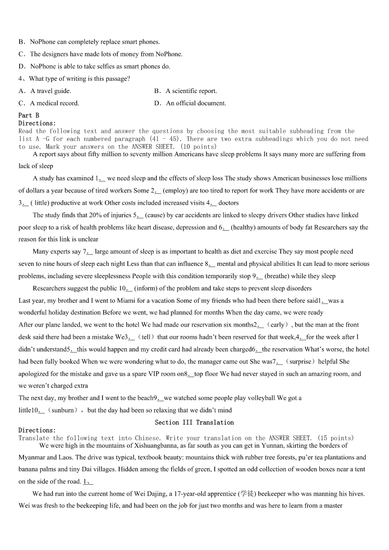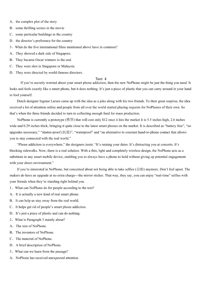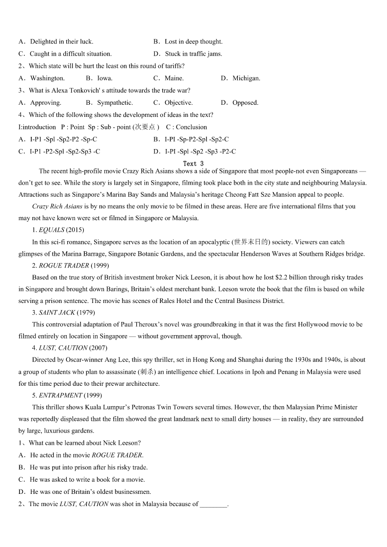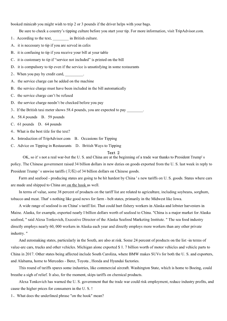 考研《英语一》甘南藏族自治州夏河县2023年点睛提分卷 SectionIUseofEnglish Directions: Readthefollowingtext.Choosethebestword(s)foreachnumberedblankandmarkA,B,CorDonthe ANSWERSHEET.(10points) WouldyoulikethechancetodiscoveraplaceofmysteryandbeautyinthesouthwestofChina?Ifyouransweris“yes”, consideratriptoShangri-la! Theword“Shangri-la”first1inthe1993novelLostHorizonbytheBritishwriterJamesHilton.Hedescribeda beautifulkingdomwherethree2joinedtogether,snow-cappedmountains3tothesky,4fieldsoflonggrasscovered theearth.Inthisperfectworldlivedpeoplewhohaddiscoveredhowtostay5forever. Threemountainsarecoveredwithsnow,tower6theland.Thesesnowymountaintops7abeautifulpicturethatwill makeanyviewerspeechless. Lakes,surroundedbyvastgrasslands,look8jewels.Sheep,cowsandhorsesandanimalsfeed9onthegreen grassandtheforestsaroundare10tolotsofbirdsandanimals.Inthisheavenlyworld,peopleliveinperfectharmonywith natureandtheoutsideworldisforgotten. 1、A.cameB.appearedC.producedD.found 2、A.lakesB.countriesC.riversD.railways 3、A.reachedB.expandedC.spreadD.stretched 4、A.butB.soC.becauseD.and 5、A.calmB.stillC.youngD.thesame 6、A.overB.aboveC.onD.beyond 7、A.areB.formC.developD.show 8、A.asB.ifC.likeD.for 9、A.simplyB.deeplyC.finallyD.mainly 10、A.spaceB.roomC.familyD.home SectionIIReadingComprehension PartA Directions: Readthefollowingfourtexts.AnswerthequestionsbeloweachtextbychoosingA,B,CorD.Mark youranswersontheANSWERSHEET.(40points) Text1 Tippingisn’tabigpartofBritishculture,unlikeinNorthAmerica,wherewaitersandwaitressesarepaidbelowminimum wage.Tipsareusuallyappreciated,butofferingatipofsomeservicescancauseconfusion. Incasualrestaurants,whereyoupayforyourorderatacounterbutfoodisbroughttoyourtable,tippingisuncommon.Youare welcometoleaveapoundortwoifyouwish.Inrestaurantswhereyouplaceyourorderwithawaiterorawaitressandreceive yourfoodandbillatyourtable,it’scustomarytotiparound10percent.Insomerestaurants,aservicechargemaybeaddedto thebillautomatically,typically10or12.5percent.Inthiscase,youdon’tneedtoaddafurthertip.Whenyoupaybycred