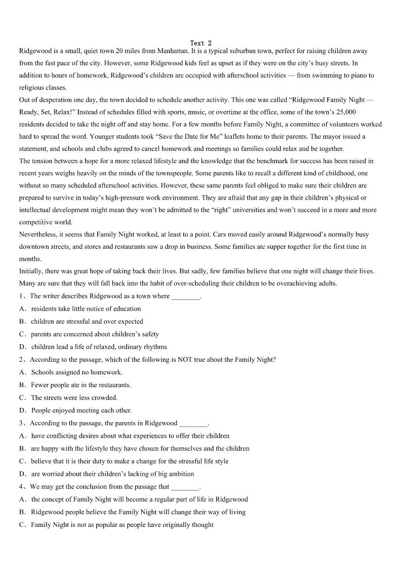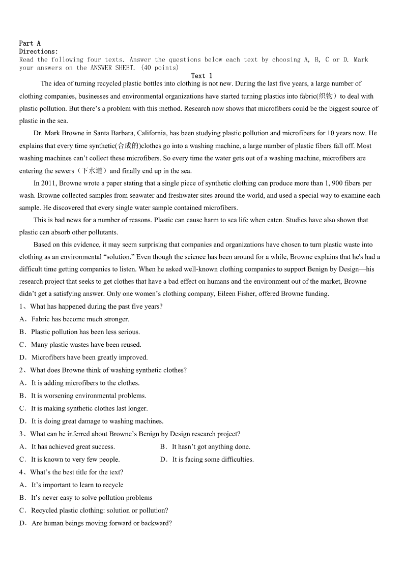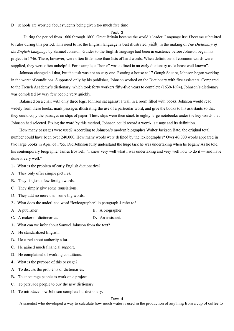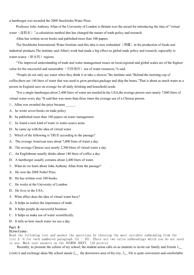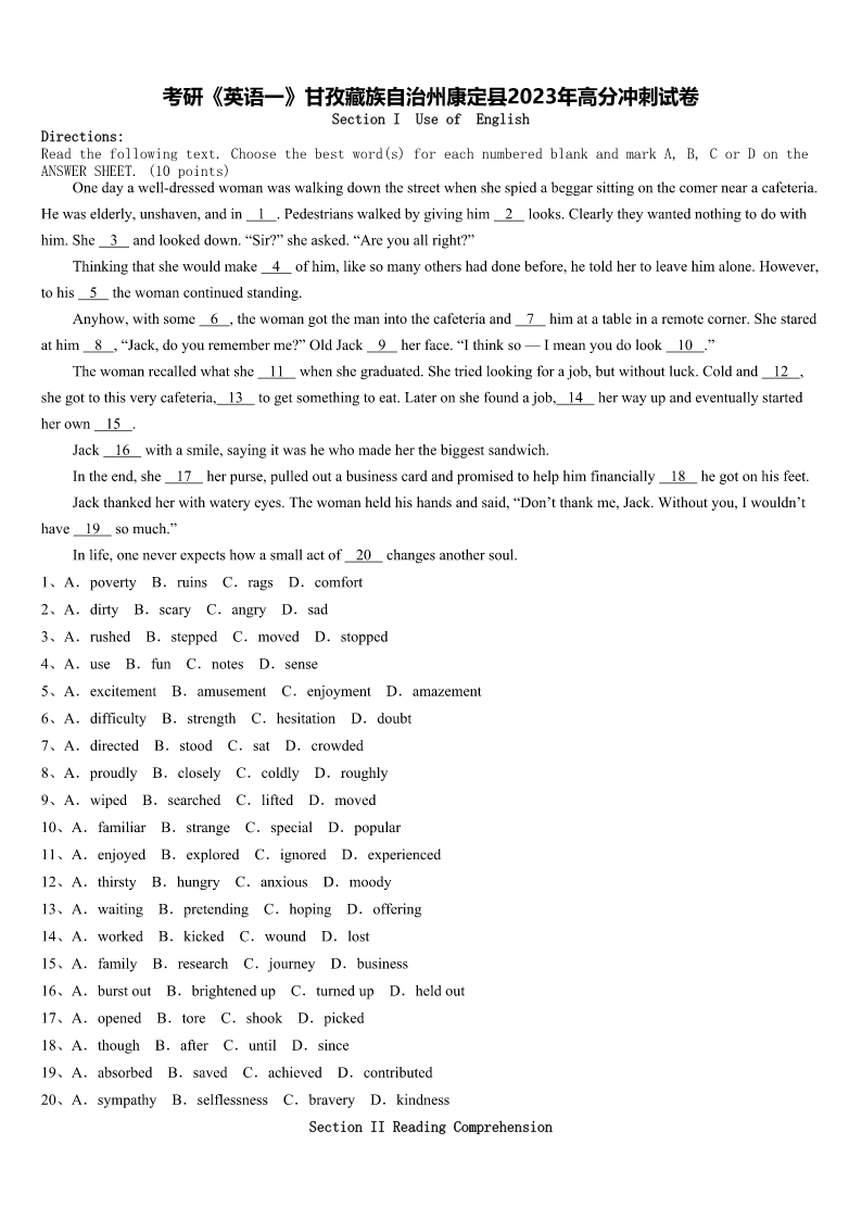 考研《英语一》甘孜藏族自治州康定县2023年高分冲刺试卷 SectionIUseofEnglish Directions: Readthefollowingtext.Choosethebestword(s)foreachnumberedblankandmarkA,B,CorDonthe ANSWERSHEET.(10points) Onedayawell-dressedwomanwaswalkingdownthestreetwhenshespiedabeggarsittingonthecomernearacafeteria. Hewaselderly,unshaven,andin1.Pedestrianswalkedbygivinghim2looks.Clearlytheywantednothingtodowith him.She3andlookeddown.“Sir?”sheasked.“Areyouallright?” Thinkingthatshewouldmake4ofhim,likesomanyothershaddonebefore,hetoldhertoleavehimalone.However, tohis5thewomancontinuedstanding. Anyhow,withsome6,thewomangotthemanintothecafeteriaand7himatatableinaremotecorner.Shestared athim8,“Jack,doyourememberme?”OldJack9herface.“Ithinkso—Imeanyoudolook10.” Thewomanrecalledwhatshe11whenshegraduated.Shetriedlookingforajob,butwithoutluck.Coldand12, shegottothisverycafeteria,13togetsomethingtoeat.Lateronshefoundajob,14herwayupandeventuallystarted herown15. Jack16withasmile,sayingitwashewhomadeherthebiggestsandwich. Intheend,she17herpurse,pulledoutabusinesscardandpromisedtohelphimfinancially18hegotonhisfeet. Jackthankedherwithwateryeyes.Thewomanheldhishandsandsaid,“Don’tthankme,Jack.Withoutyou,Iwouldn’t have19somuch.” Inlife,oneneverexpectshowasmallactof20changesanothersoul. 1、A.povertyB.ruinsC.ragsD.comfort 2、A.dirtyB.scaryC.angryD.sad 3、A.rushedB.steppedC.movedD.stopped 4、A.useB.funC.notesD.sense 5、A.excitementB.amusementC.enjoymentD.amazement 6、A.difficultyB.strengthC.hesitationD.doubt 7、A.directedB.stoodC.satD.crowded 8、A.proudlyB.closelyC.coldlyD.roughly 9、A.wipedB.searchedC.liftedD.moved 10、A.familiarB.strangeC.specialD.popular 11、A.enjoyedB.exploredC.ignoredD.experienced 12、A.thirstyB.hungryC.anxiousD.moody 13、A.waitingB.pretendingC.hopingD.offering 14、A.workedB.kickedC.woundD.lost 15、A.familyB.researchC.journeyD.business 16、A.burstoutB.brightenedupC.turnedupD.heldout 17、A.openedB.toreC.shookD.picked 18、A.thoughB.afterC.untilD.since 19、A.absorbedB.savedC.achievedD.contributed 20、A.sympathyB.selflessnessC.braveryD.kind
