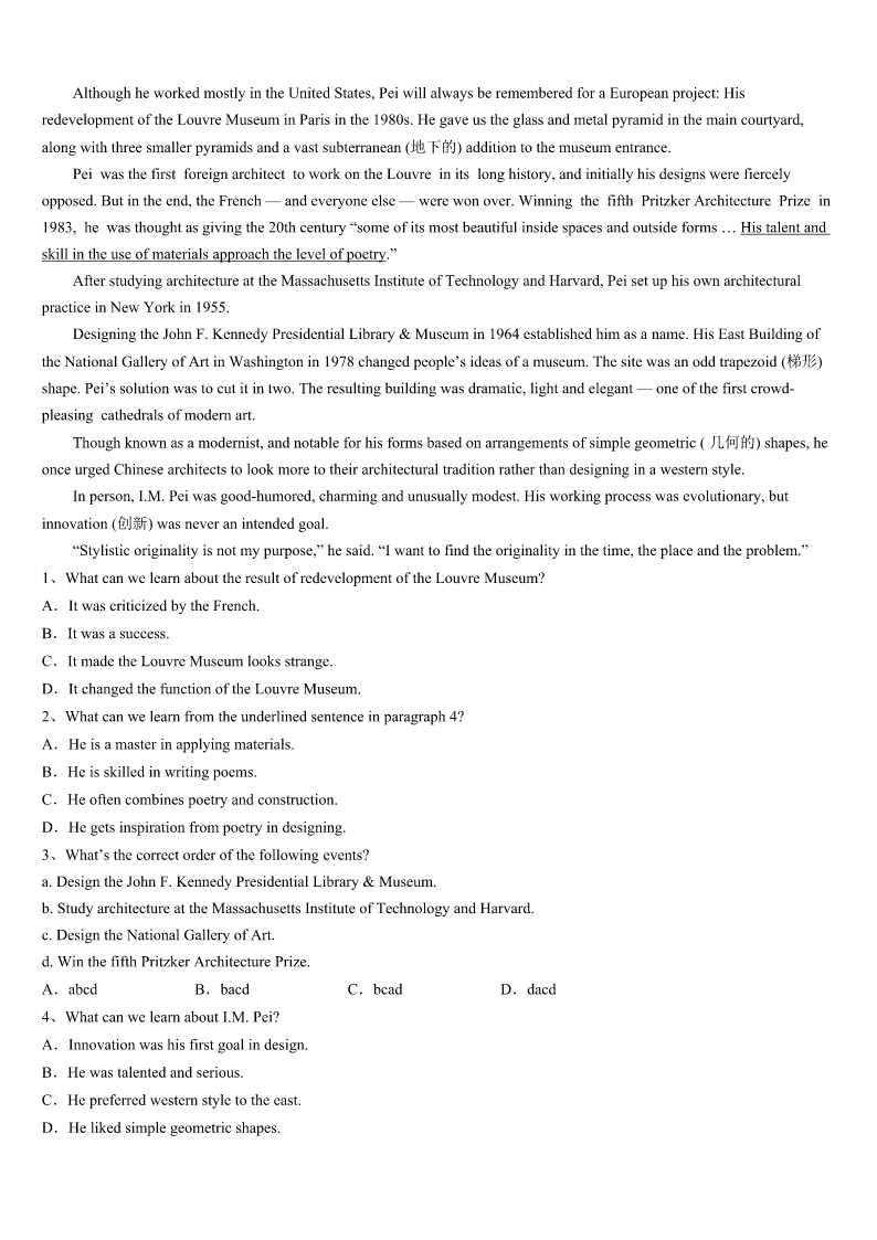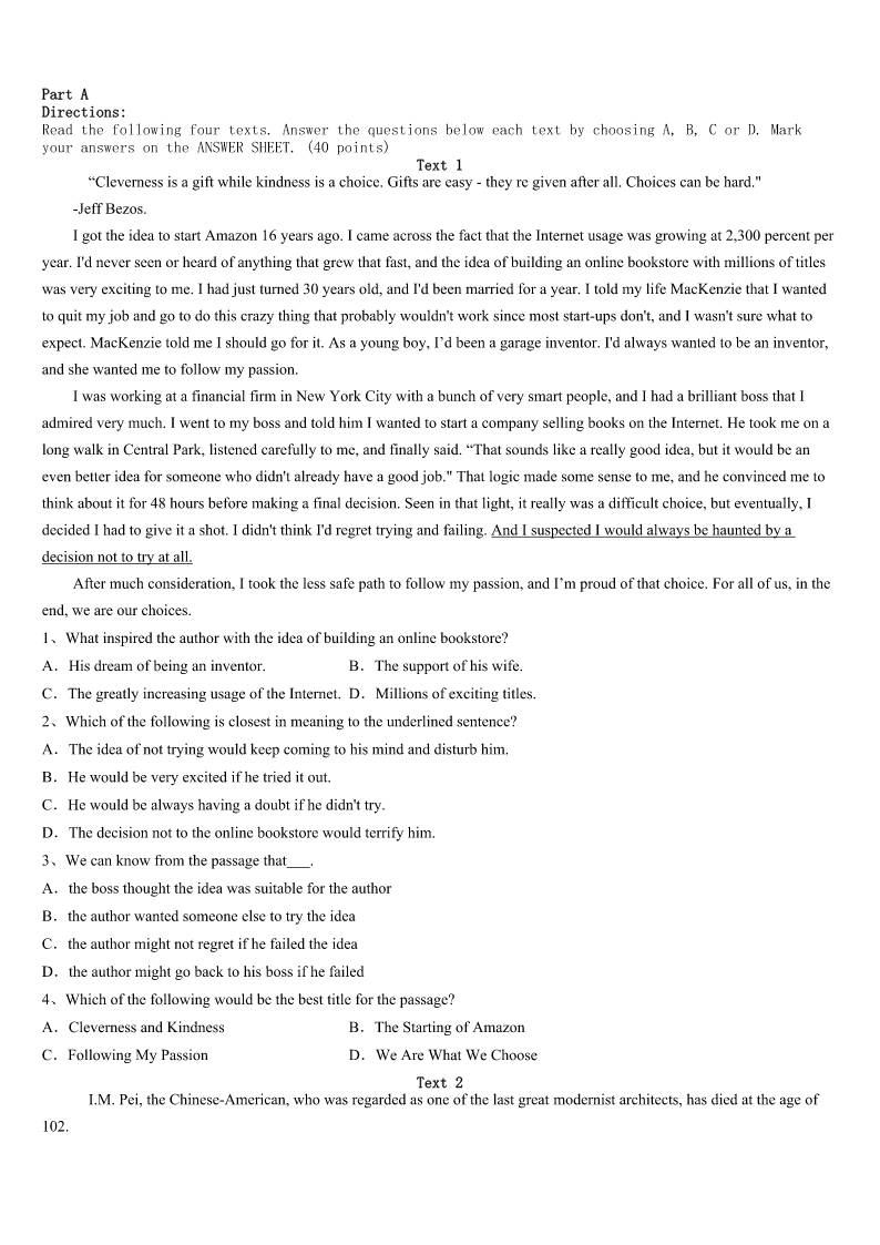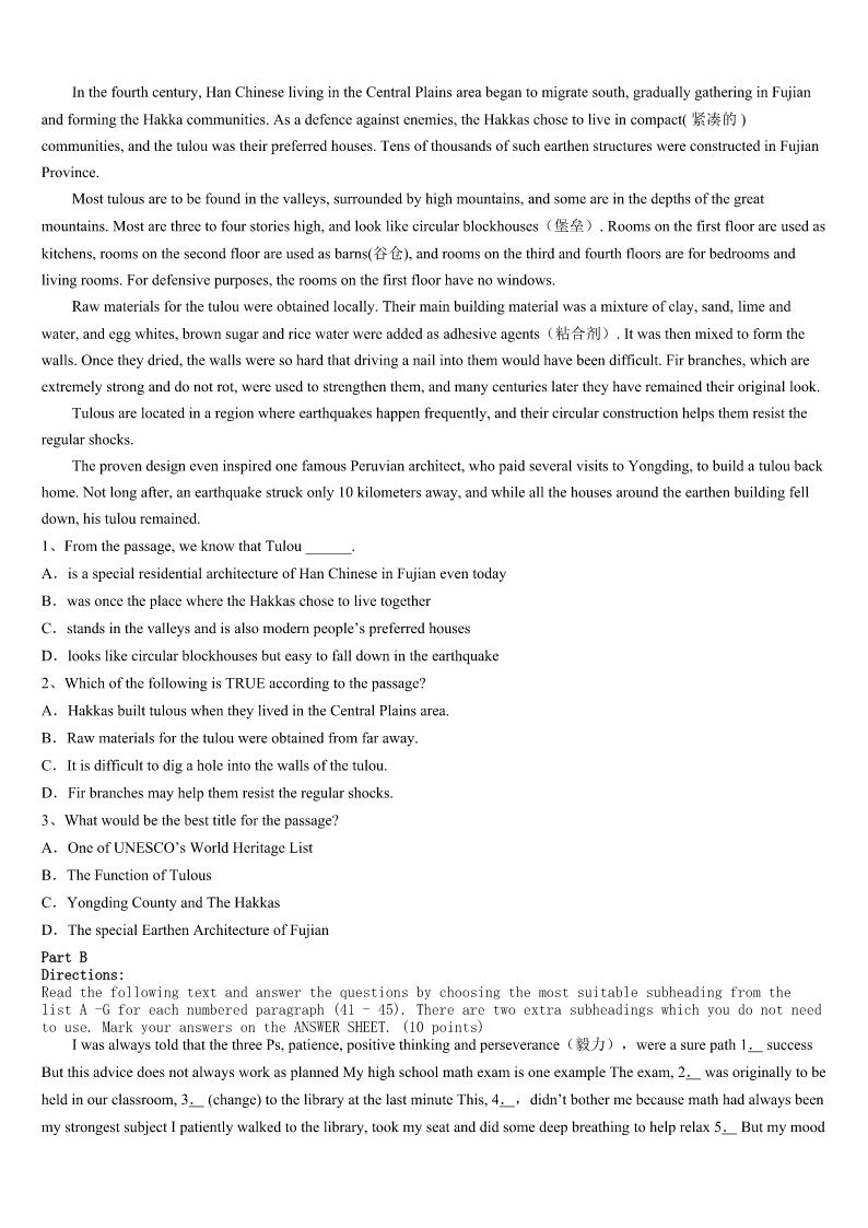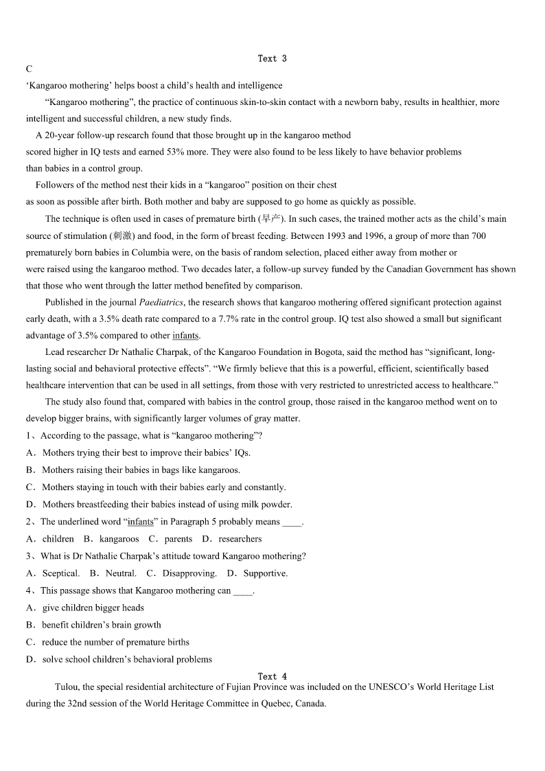 考研《英语一》河南省濮阳市台前县2023年临考冲刺试卷 SectionIUseofEnglish Directions: Readthefollowingtext.Choosethebestword(s)foreachnumberedblankandmarkA,B,CorDonthe ANSWERSHEET.(10points) ThefirsttimeIremembernoticingIremembernoticingthecrossingguardwaswhenhewavedtomeasIdrovemyson toschool.He1mewithapuzzleallbecausehewavedtomelikesomeonedoes2seeingaclosefriend.Abig,3 smileaccompaniedhiswave.ForthenextfewdaysItriedto4hisfacetoseeifIknewhim.Ididn’t.Perhapshehad5me forsomeoneelse.BythetimeIcontentedmyselfwiththe6thatheandIwerestrangers,weweregreetingeachotherwarmly everymorninglikeoldfriends. Thenonedaythe7wassolved.AsI8theschoolhewasstandinginthemiddleoftheroad9hisstopsign.Iwasin livebehindfourcars.10thekidshadreachedthesafetyofthesidewalk,heloweredhissignandletthecars11.Tothe firsthewavedand12injustthesamewayhehaddonetomeoverthelastfewdays.Thekidsalreadyhadthewindowdown andwerehappilywavingtheirreply.Thesecondcargotthesame13fromthecrossingguard,andthedriver,astiff looking(表情刻板的)businessman,gaveabrief,almost14waveback.Eachfollowingcarofkidsontheirwaytoschool 15moreheartily. EverymorningIcontinuedtowatchthemanwith16.SofarIhaven’tseenanyone17towaveback.Ifindit interestingthatonepersoncanmakesucha(n)18tosomanypeople’slivesbydoingonesimplethinglikewavingand smilingwarmly.His19armedthestartofmyday.Withafriendlywaveandsmilingfacehehadchangedthe20ofthe wholeneighbourhood. 1、A.hitB.disappointedC.presentedD.bored 2、A.onB.fromC.duringD.about 3、A.falseB.shyC.apologeticD.bright 4、A.researchB.studyC.recognizeD.explore 5、A.praisedB.blamedC.mistakenD.respected 6、A.conclusionB.descriptionC.evaluationD.introduction 7、A.argumentB.disagreementC.mysteryD.task 8、A.visitedB.approachedC.passedD.left 9、A.drawingbackB.puttingonC.handinginD.holdingout 10、A.OnceB.BeforeC.UnlessD.While 11、A.inB.throughC.outD.down 12、A.criedB.cheeredC.smiledD.gestured 13、A.ideaB.replyC.noticeD.greeting 14、A.awkwardB.angryC.elegantD.patient 15、A.cameB.respondedC.hurriedD.appeared 16、A.surpriseB.frustrationC.interestD.doubt 17、A.fa