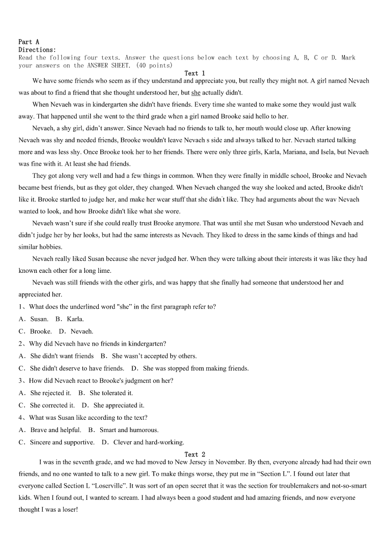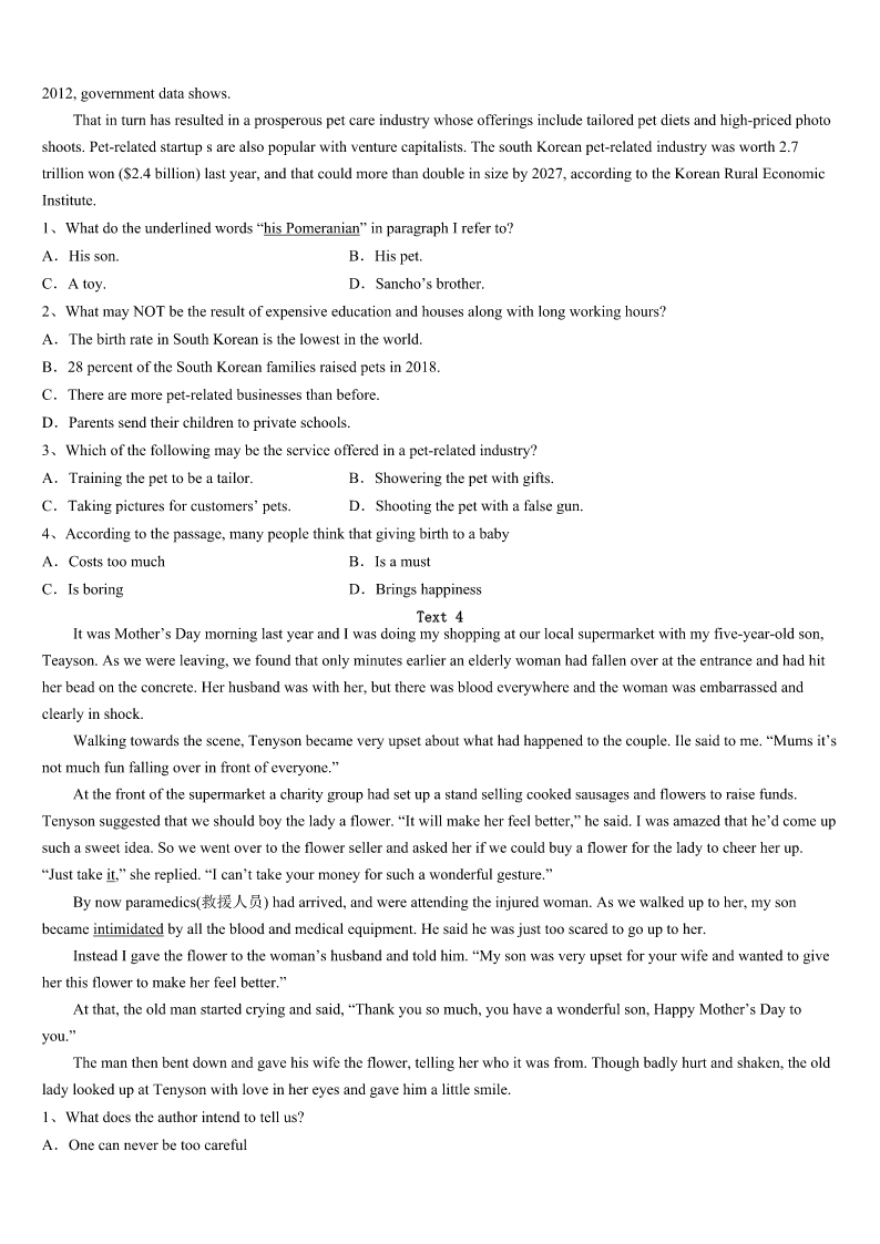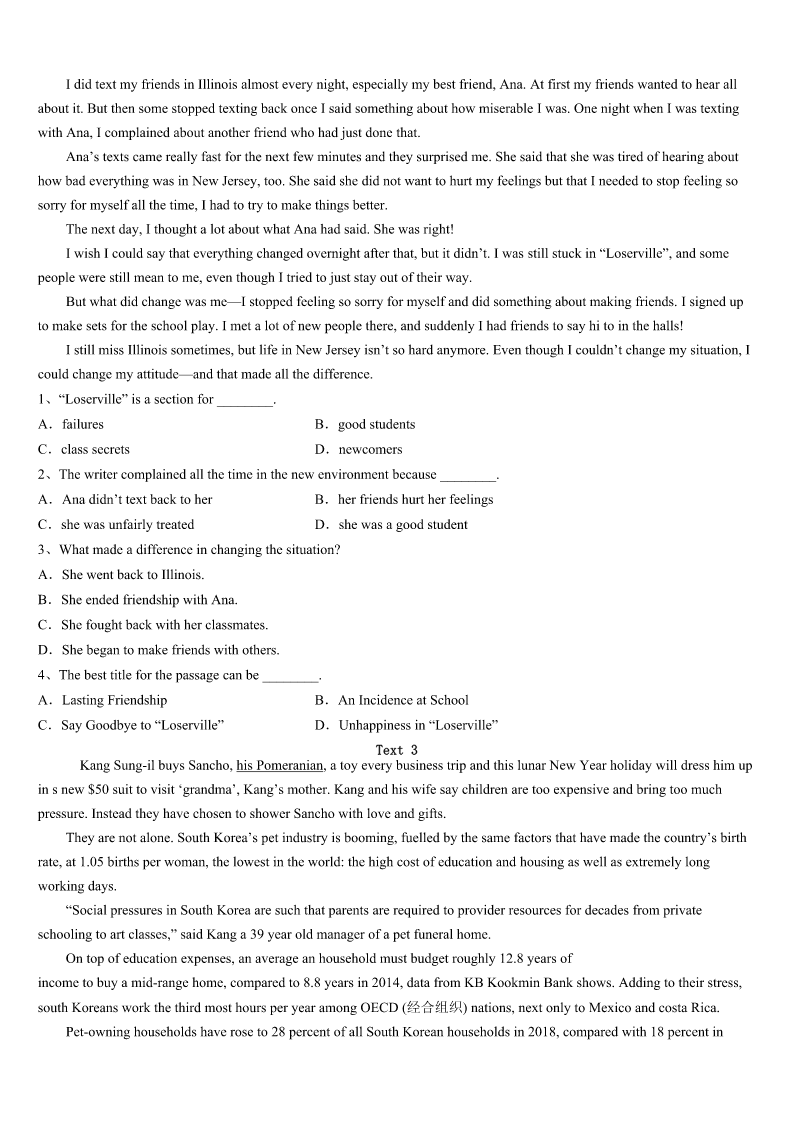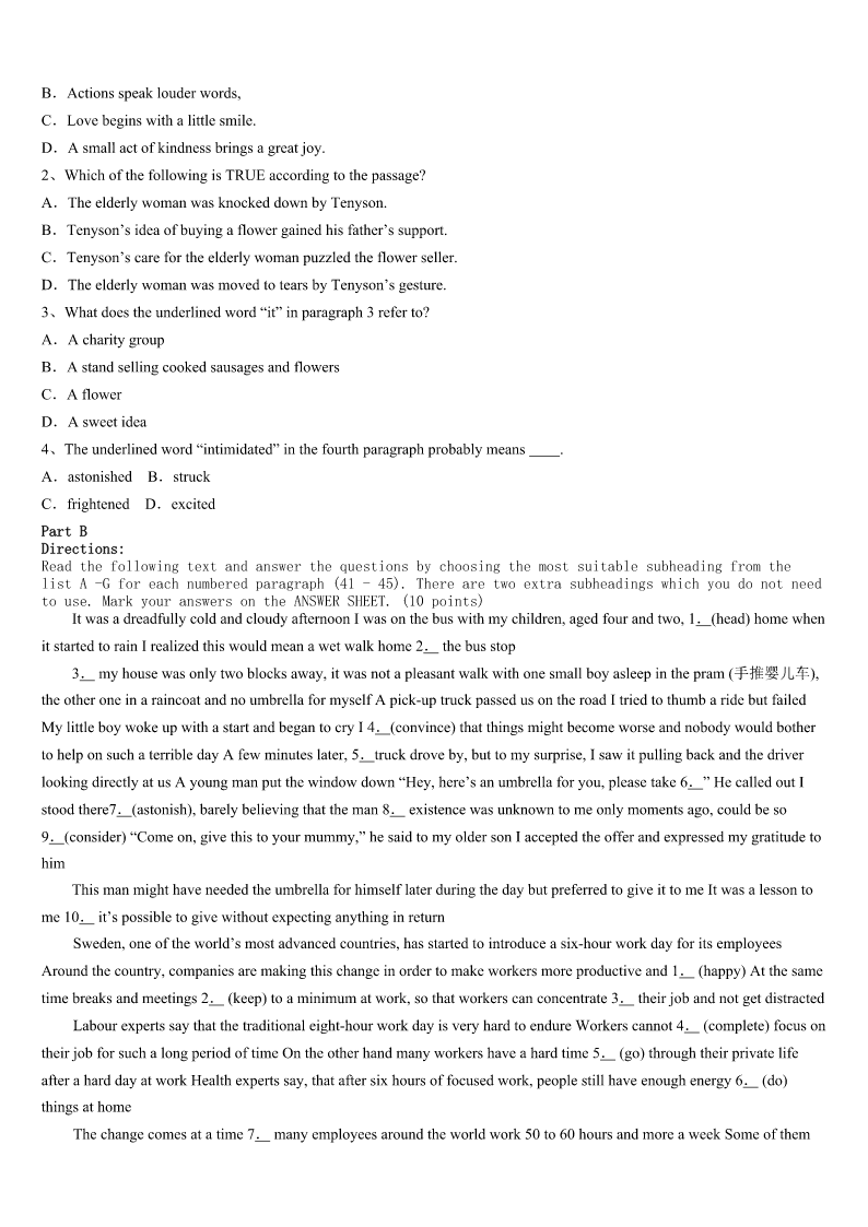 考研《英语一》清涧县2023年考前冲刺试题 SectionIUseofEnglish Directions: Readthefollowingtext.Choosethebestword(s)foreachnumberedblankandmarkA,B,CorDonthe ANSWERSHEET.(10points) Itwasanextraordinarilybusytimeofyear.Ifeltsome1toheadstraighthomeafteralongmeeting.SoIheadedto the2nearbyforsometherapeutic(治疗性的)hiking.AsIreachedthetopandadmiredtheview,myunclearmind3.Re- energized,IknewthatIcoulddealwiththe4thatwaitedformeuponmy5.WhenIarrivedbackintheofficethenext day,Iwasfullofenergy,andfinishedmywork6. Itwasalmost20yearsagothatIlearnedhow7itisformetocarveouttimetoescapetothewild.Ihadfinishedmy Ph.D.,8soilandwaterconservationinHonduras,butIwasn'tsurewhat9Iwantedtohave.So,Idecidedtoactona dreamIhadbeennursingforafewyears,10mymomshowedmeamagazinearticleaboutamanwhohad11around America.IfiguredthatIcould12cyclingwithresearchforabookonAmericanagriculturewhileIworkedoutmynext careerstep. SoIdidit.Duringthecycling13,IfoundtheclearnessIneededto14mynextcareermove.TalkingwithfarmersI metalongtheway,Ilearnedthattheirbiggest15wassellingtheirproduce.Idecidedtobroadenmy16fromland managementtoimprovingfarmers'accesstomarkets.My17interestledtoworkingforanongovernmentalorganization andIdideventually18abookon.Americanagriculture. The19istofindyoursourceofinspirationandmakegooduseofit.Forme,Ialwaysgetnourishment(营养)from being20intheoutdoors. 1、A.pressureB.dangerC.shameD.embarrassment 2、A.forestB.parkC.hospitalD.mountain 3、A.calmedB.wanderedC.developedD.appeared 4、A.meetingB.changeC.workD.time 5、A.replyB.returnC.relaxationD.recovery 6、A.successfullyB.casuallyC.anxiouslyD.constantly 7、A.strangeB.importantC.difficultD.interesting 8、A.continuingB.choosingC.studyingD.supporting 9、A.tourB.bookC.careerD.major 10、A.unlessB.ifC.thoughD.since 11、A.runB.cycledC.drivenD.flown 12、A.combineB.compareC.replaceD.practise 13、A.competitionB.historyC.performanceD.trip 14、A.insistonB.putdownC.figureoutD.learnfrom 15、A.challengeB.progressC.adventureD.sacrifice 16、A.experienceB.focusC.discussionD.search 17、A.deepB.particularC.pers