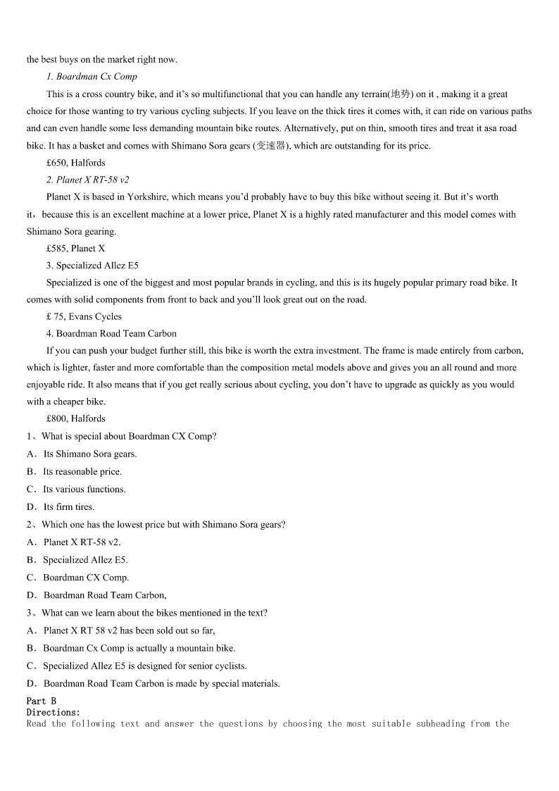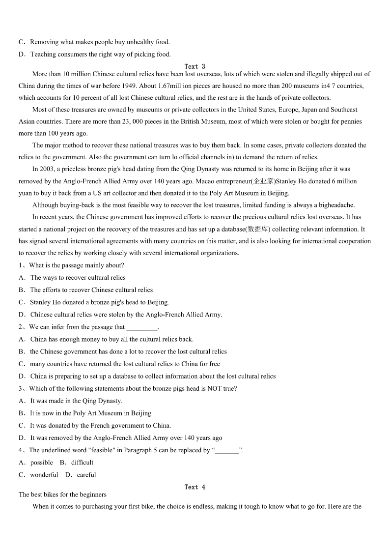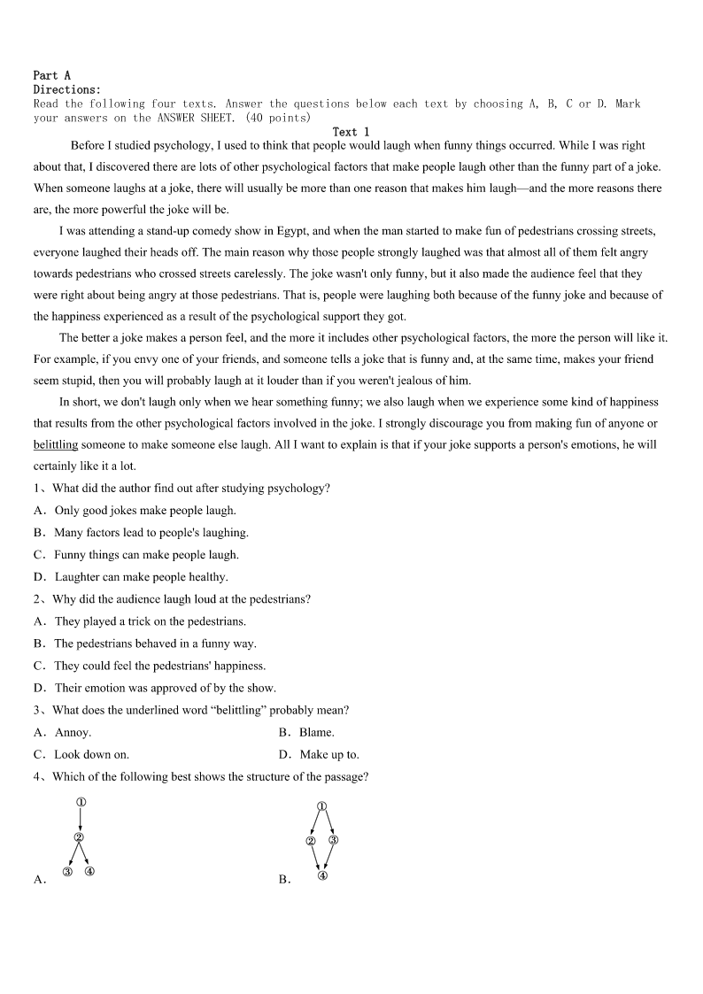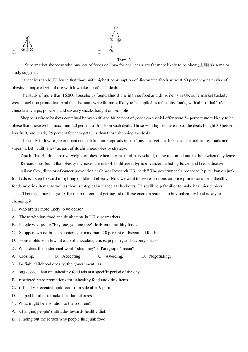 考研《英语一》河南省平顶山市舞钢市2023年预测试题 SectionIUseofEnglish Directions: Readthefollowingtext.Choosethebestword(s)foreachnumberedblankandmarkA,B,CorDonthe ANSWERSHEET.(10points) NancywasvisitingDr.Stephen.Accidentally,anurse1thepaintingshewasholding.Nancyhadplannedtodeliver thepaintingtoacustomerafterthe2.Thenursecontinued,“Itwouldbegreatifwehadartworklikethatforour chemotherapy(化疗)rooms.”Nancyhadn’trealizedtherooms3,andaskedtoseeone.Herheart4whenshesawthe emptydullwalls.“Icouldn’timagine5anyonecouldthinkaboutgettinghealthyinaroomlikethat.”6sheknewit’dbe her7toimprovetherooms. Shestartedimmediately,emailing20localdesigners,askingiftheywould8theirtimeandmoneyto9justone roomeach.Sixwomenwrotebackimmediately.TheyhadbeeninroomsliketheoneNancyhad10andthankedherfor givingthemtheopportunitytomakea11. Dr.Stephenexpressedhowmuchheappreciatedthedesigners’12.“Everythingisimprovedsothewhole13is betterforthepatients.”Heevennotedthathistoneof14wasdifferentintherooms,andthathewasbetterableto15 withhispatients. Soon,patientsbegan16certainrooms,andtheartistdecidedtoexpandtheproject.EachprojecttakesNancy anywherefromafewmonthstoafewyears,dependingonits17,andNancyhasnowregisteredanonprofit. Theobviouseffectsspeak18themselves.Whenawoman19sawthat,shesaid,“IthoughtIwasn’tgoingtobeat thediseasebutnowIknowI’mgoingto20it.” 1、A.appliedforB.madeforC.putonD.commentedon 2、A.agreementB.appointmentC.performanceD.acceptance 3、A.ignoredB.deniedC.existedD.permitted 4、A.sankB.slippedC.scannedD.flew 5、A.howB.whatC.whenD.where 6、A.AnxiouslyB.CuriouslyC.GratefullyD.Instantly 7、A.effortB.goalC.memoryD.development 8、A.saveB.produceC.donateD.preserve 9、A.evaluateB.checkC.exchangeD.transform 10、A.programmedB.fittedC.describedD.inspired 11、A.decisionB.differenceC.choiceD.living 12、A.reportsB.talentsC.understandingD.expression 13、A.experienceB.confidenceC.adventureD.restriction 14、A.actionB.tasteC.voiceD.impression 15、A.liveB.meetC.agreeD.communicate 16、A.requestingB.decoratingC.arrangingD.buying 17、A.locationB.comparis