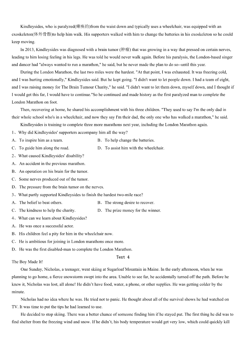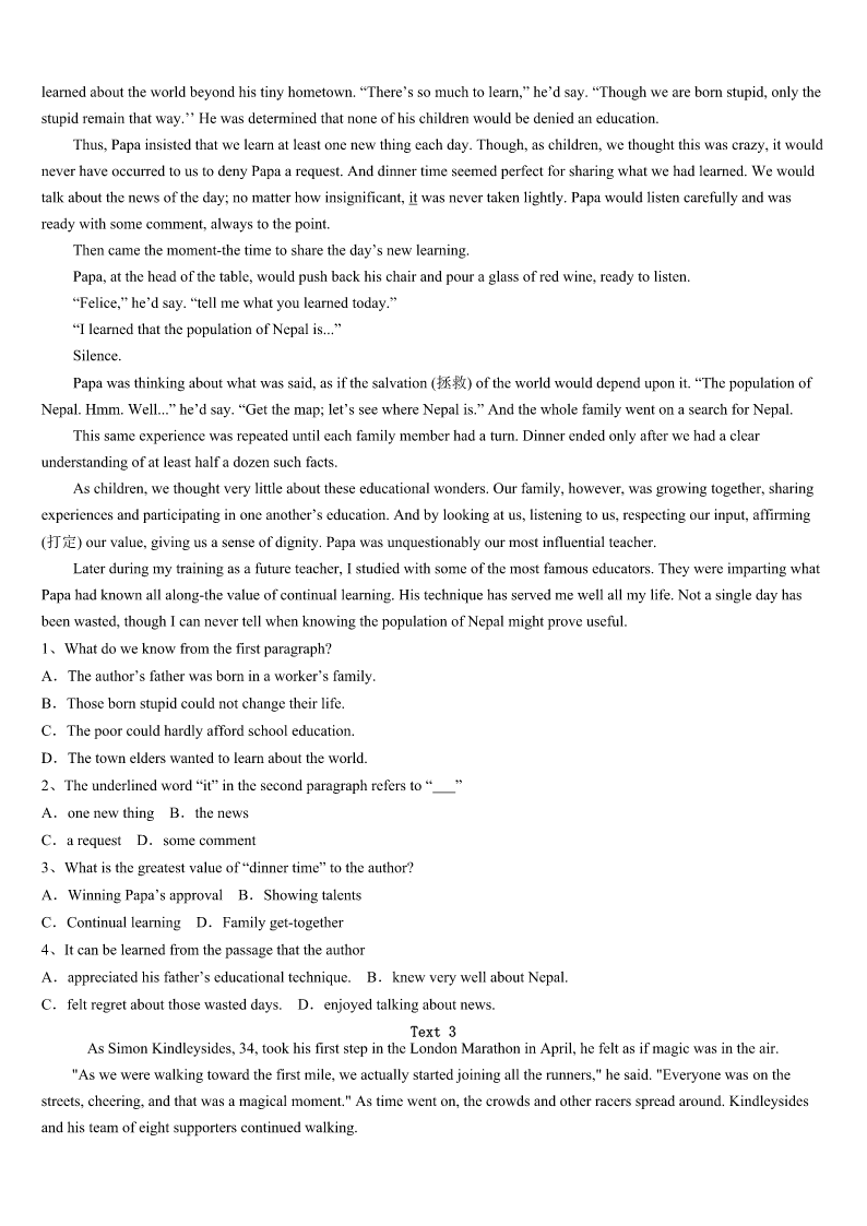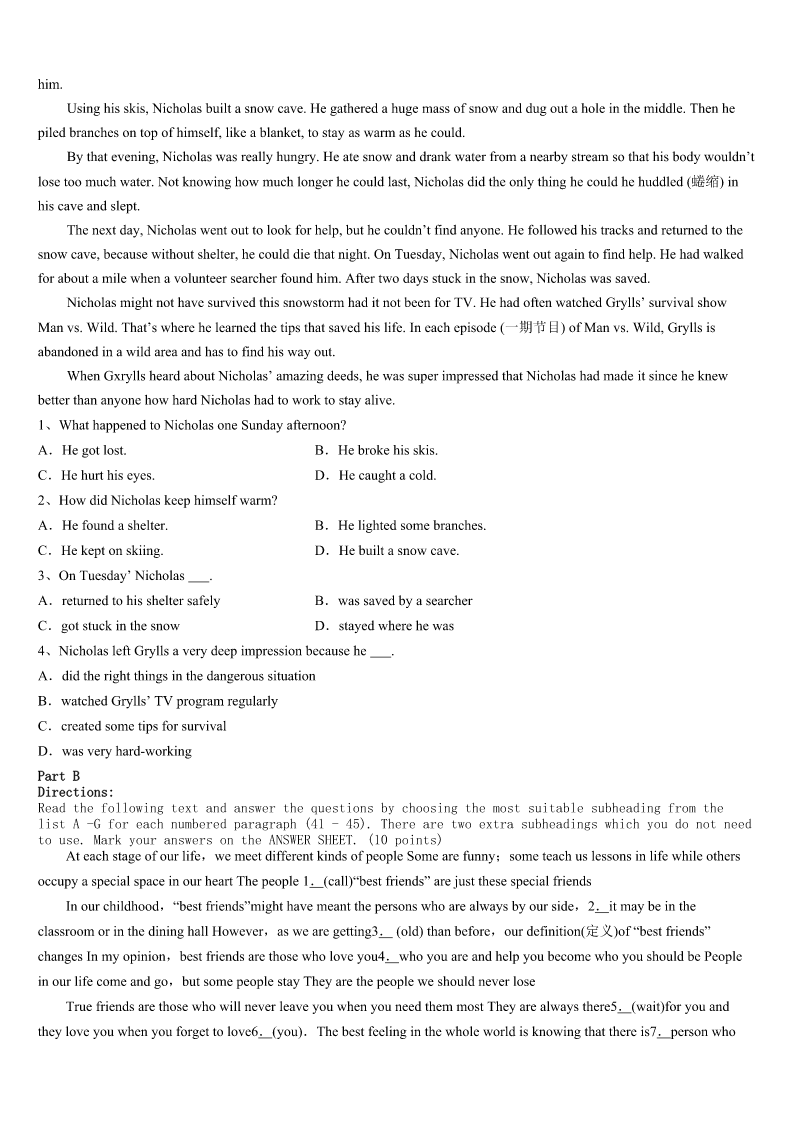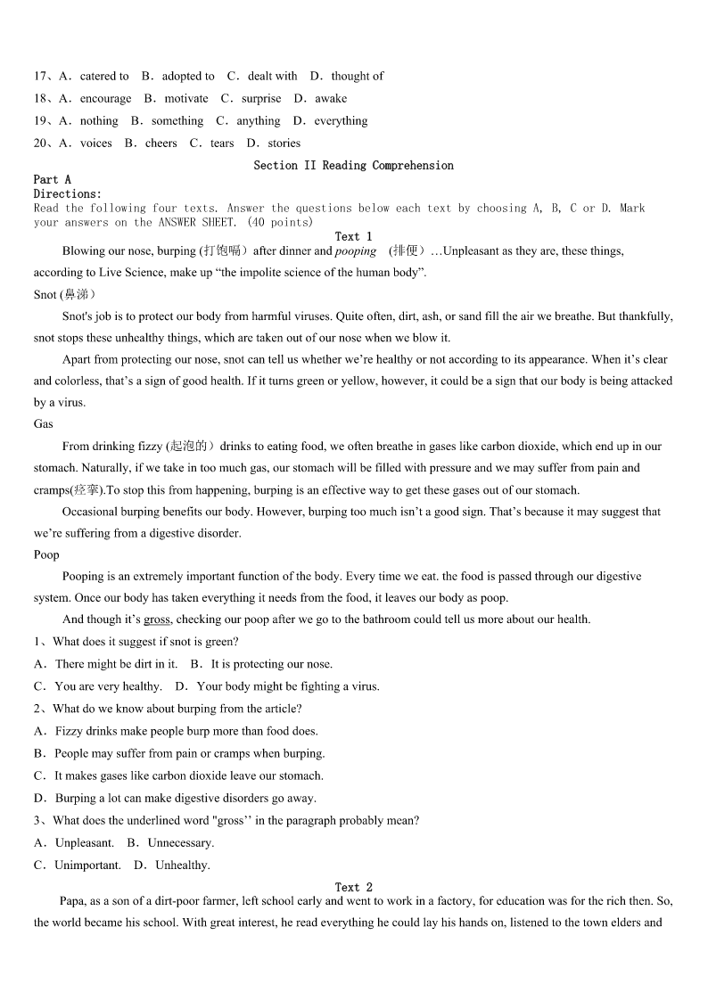 考研《英语一》玛多县2023年巅峰冲刺试卷 SectionIUseofEnglish Directions: Readthefollowingtext.Choosethebestword(s)foreachnumberedblankandmarkA,B,CorDonthe ANSWERSHEET.(10points) IboardedtheairplaneheadingtoBarcelona,frightenedbecauseinamatterofhoursI’dbelandinginacountry populatedbypeoplewhoallspokealanguagewhichwascompletelyunknowntome.Notonlythat.I’dbe1thenexttwo weeksthere. AllthebutterfliesIhadinmy2immediatelyflewawaybecauseasIarrivedatthewarm,colorfulcampus3I’dbe livingforthenextfourteendays.IfeltlikeI’dfoundmyselfasecond4.Counselorsandotherstaffmemberswelcomedusat thegate,introducingthemselves.andjustbeingallround5. Imademy6tomyassignedroomonlytofindacryinggirlandtwoothergirls7herdown.Little8Iknow howmanymemoriesI'dmake9thesethreegirls,howclosewe’dbecomeoverthenext10ofweeksandhowmany timesthecampdirectorwouldhavetocometoourroomat3:00a.m.and11nottosendusshoppingifwedidn’tgotobed 12. InthemorningswetookSpanishclassesandaguy13helearntmoreSpanishoverthesetwoweeksthanhedidforthe pastyearat14.Duringtheday,Iformedlife-longrelationshipswithpeoplefromall15oftheglobe,andmostly visitedthebreathtakingBarcelonanbeaches. Speakingofbreakfast,themealswererestaurant—worthy,the16wereendlessandpeoplewithspecialfoodneeds werewell17. Thestaffalwaysfoundsomewayoranotherto18us,whetheritwashavingasurprisewaterpartyattenp.m.or havinganunannouncedwatermelon—eatingcontest,theyalwayshad19uptheirsleeves. Bytheendofcamp,everyonewassosadthattheyhadtoleave,therewereenough20tofillupanOlympic—sized pool. 1、A.consumingB.spendingC.wastingD.requiring 2、A.stomachB.brainC.heartD.chest 3、A.whichB.whenC.thatD.where 4、A.chanceB.1ifeC.homeD.1anguage 5、A.nervousB.friendlyC.awkwardD.silent 6、A.wayB.headC.stepD.walk 7、A.1ayingB.strikingC.calmingD.attending 8、A.wouldB.doC.willD.did 9、A.upB.ofC.outD.with 10、A.dozenB.coupleC.scoreD.decade 11、A.threatenB.urgeC.promiseD.convince 12、A.frequentlyB.thoroughlyC.immediatelyD.comfortably 13、A.admittedB.shoutedC.rememberedD.argued 14、A.workB.restC.peaceD.school 15、A.sidesB.anglesC.squ
