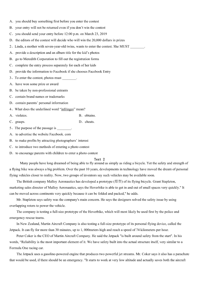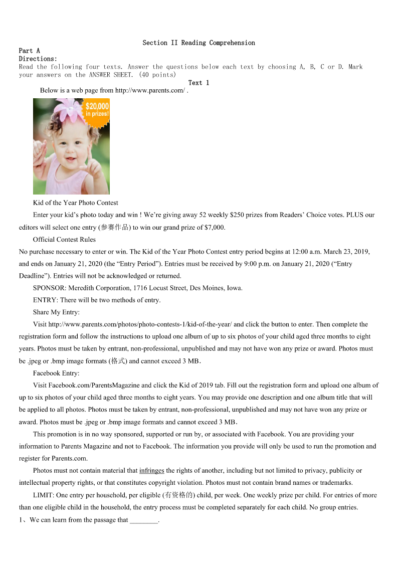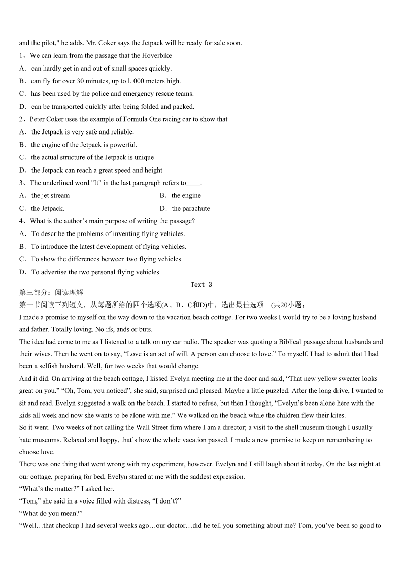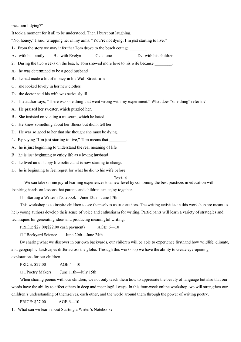 考研《英语一》甘肃省酒泉市金塔县2023年高分通关卷 SectionIUseofEnglish Directions: Readthefollowingtext.Choosethebestword(s)foreachnumberedblankandmarkA,B,CorDonthe ANSWERSHEET.(10points) Myhusbandhasalwayshadahugeaffectionforolderpeopleandhashelpedoutseveralelderlyfriendsinthepast.Mr.Dave 1thesamelakeasmyhusbandJohnforover15years.Afriendship2butwhenMrs.Davediedfiveyearsago,itleftMr. Dave3SoJohntookMr.Davefishingwithhimeverytimehewent.Mr.Davewasvery4for80yearsoldandnevertired ofbeingwithJohn. AfewyearslaterMr.Davehadastroke(中风)thatparalyzed(麻痹)hisrightside.Helosthisspeechandwas5,Mr.Dave begantosufferfrom6 ThisalmostbrokeJohn’sheart.Hefinallygot7fromthenursinghometotakeMr.Daveoutforaride.Theywereboth8 tobetogetheragainbutitwasverypainfulforMr.Davetobe9intoJohn’struck.Becausehewasparalyzedononeside. The10ofthatsidepulledheavilyonhisgoodside. Johnhadgottenhistruckayearearlier,arealcowboyCadillac,11wasthetruckofhisdreams.Butonedayhe12itsohe couldbuyavan(厢式货车)thatwas13forawheelchair.Thevanisn’tsportyorfastbutitsurely14Mr.Dave’spainon theiroutings. Johnhasmadea15fishingrodthatMr.Davecanuse,16theystillgofishingtogether.EventhoughMr.Davecan’t17, hehasledthenursinghomestafftobelieveJohnishisson.Idon’tknowanyonewhowould18theirprizedpossessionto helpafriend.Ihopehecanbeanexampleforotherstotakesimilarstepsto19thosewhoareinneed. 1、A.swamB.playedC.fishedD.visited 2、A.destroyedB.developedC.disappearedD.increased 3、A.disabledB.sleeplessC.homelessD.alone 4、A.happyB.energeticC.proudD.powerful 5、A.putintoB.keptawayC.lockedinD.pickedup 6、A.sleepB.communicateC.eatD.think 7、A.weaknessB.starvationC.depressionD.pressure 8、A.donationB.supportC.mercyD.permission 9、A.sadB.excitedC.desperateD.lucky 10、A.liftedB.invitedC.ledD.pushed 11、A.painB.fleshC.strengthD.weight 12、A.thatB.whichC.whatD.it 13、A.fixedB.repairedC.remadeD.sold 14、A.createdB.equippedC.changedD.decorated 15、A.overcomesB.removesC.reducesD.relaxes 16、A.expensiveB.beautifulC.strongD.special 17、A.butB.orC.soD.and 18、A.walkB.talkC.escapeD.hear 19、A.giveupB