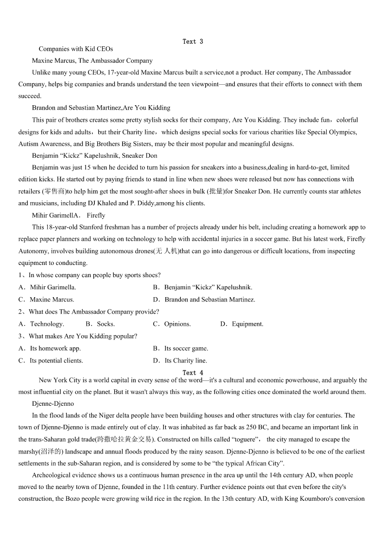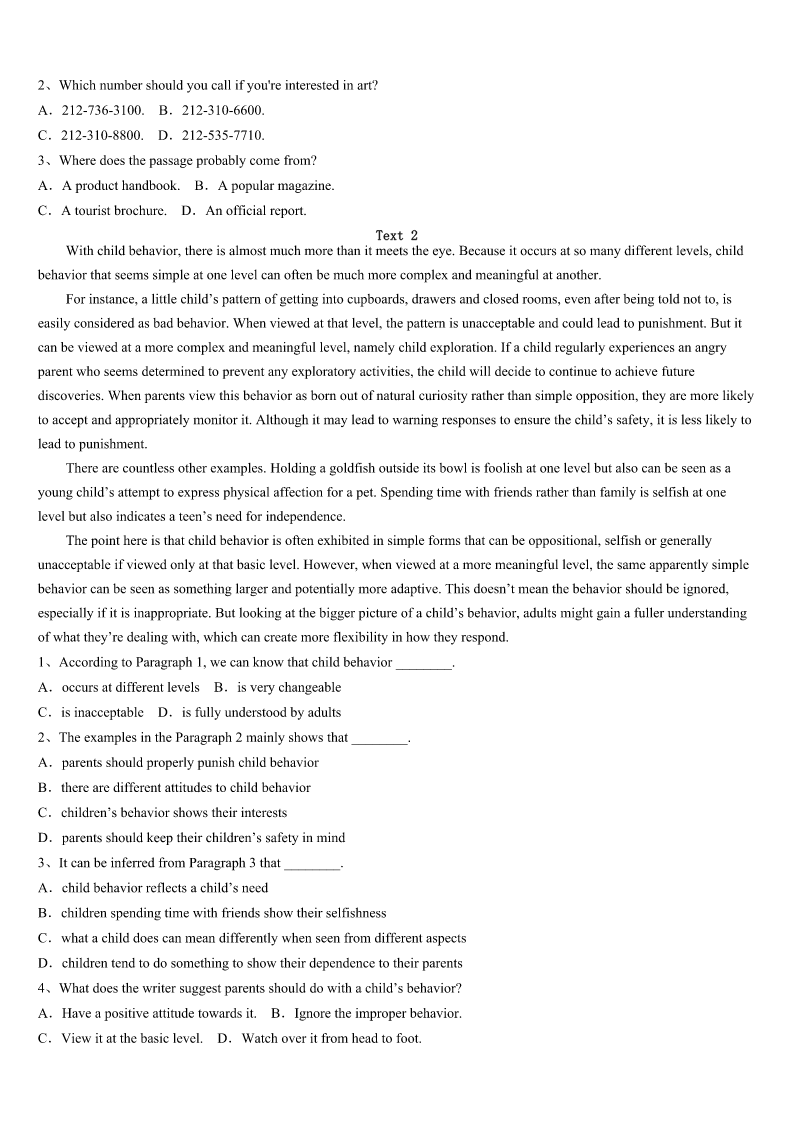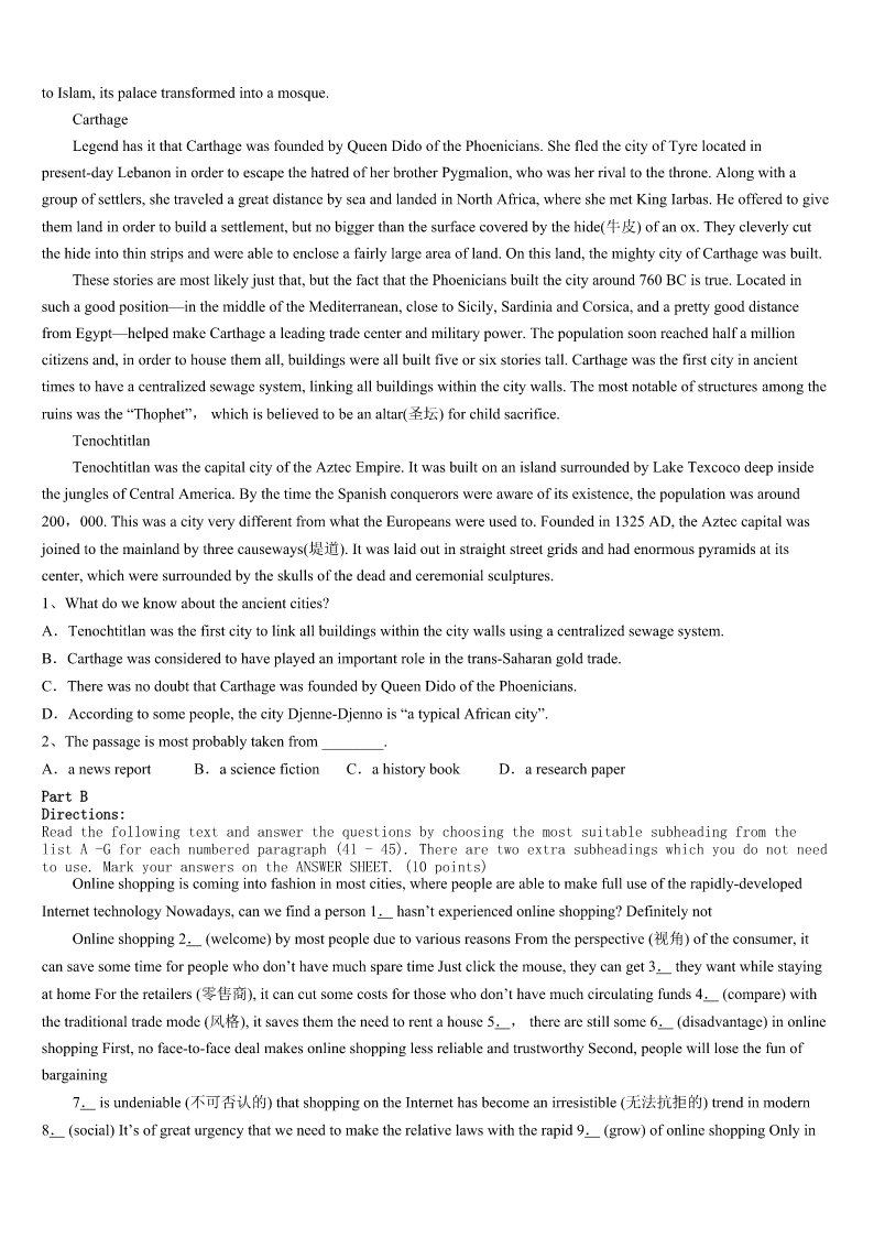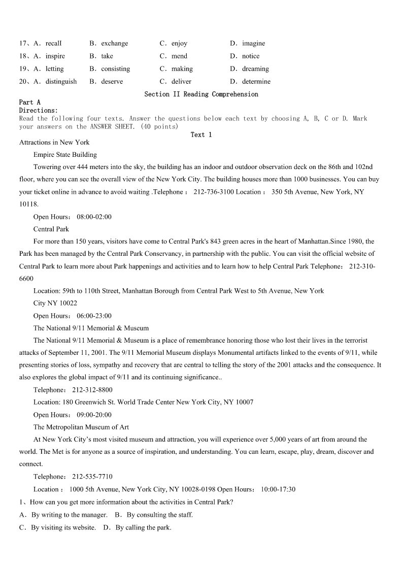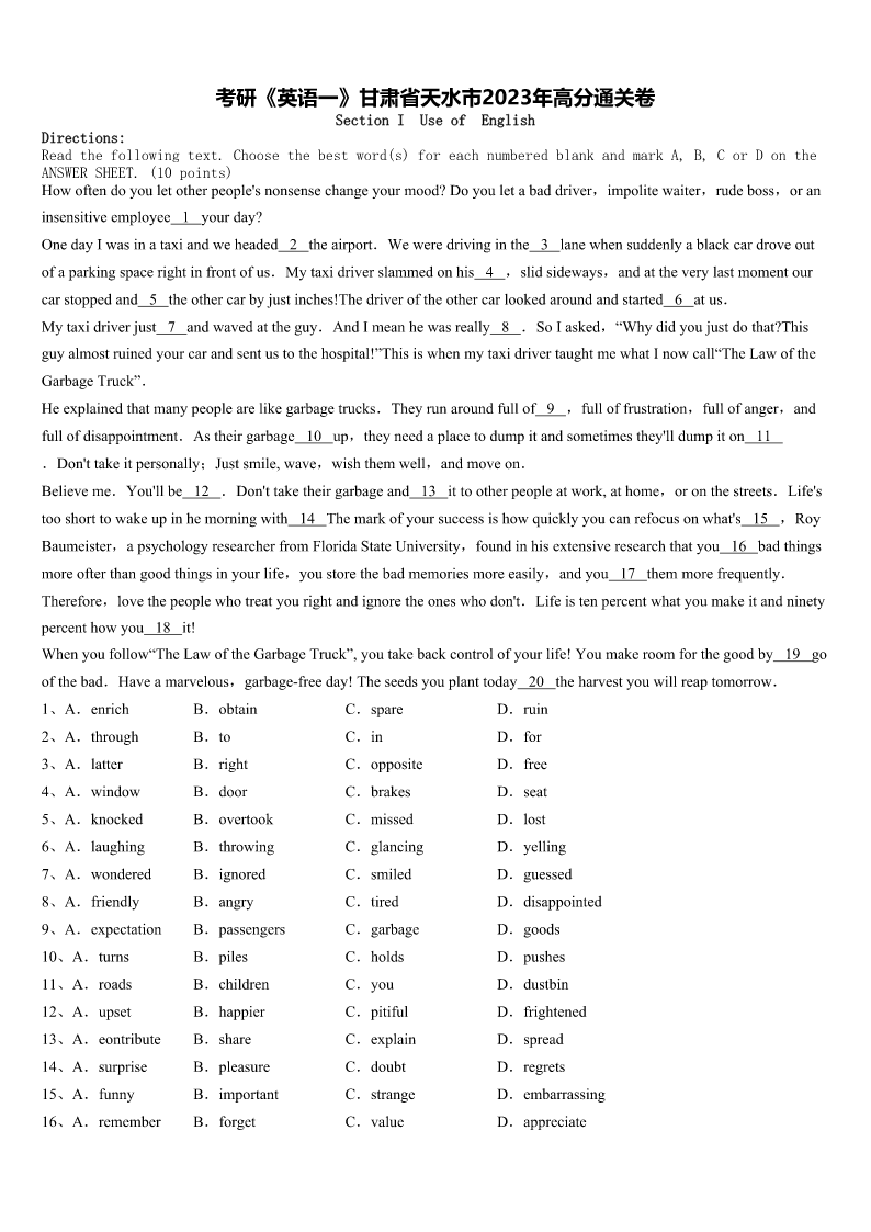 考研《英语一》甘肃省天水市2023年高分通关卷 SectionIUseofEnglish Directions: Readthefollowingtext.Choosethebestword(s)foreachnumberedblankandmarkA,B,CorDonthe ANSWERSHEET.(10points) Howoftendoyouletotherpeople'snonsensechangeyourmood?Doyouletabaddriver,impolitewaiter,rudeboss,oran insensitiveemployee1yourday? OnedayIwasinataxiandweheaded2theairport.Weweredrivinginthe3lanewhensuddenlyablackcardroveout ofaparkingspacerightinfrontofus.Mytaxidriverslammedonhis4,slidsideways,andattheverylastmomentour carstoppedand5theothercarbyjustinches!Thedriveroftheothercarlookedaroundandstarted6atus. Mytaxidriverjust7andwavedattheguy.AndImeanhewasreally8.SoIasked,“Whydidyoujustdothat?This guyalmostruinedyourcarandsentustothehospital!”ThisiswhenmytaxidrivertaughtmewhatInowcall“TheLawofthe GarbageTruck”. Heexplainedthatmanypeoplearelikegarbagetrucks.Theyrunaroundfullof9,fulloffrustration,fullofanger,and fullofdisappointment.Astheirgarbage10up,theyneedaplacetodumpitandsometimesthey'lldumpiton11 .Don'ttakeitpersonally;Justsmile,wave,wishthemwell,andmoveon. Believeme.You'llbe12.Don'ttaketheirgarbageand13ittootherpeopleatwork,athome,oronthestreets.Life's tooshorttowakeupinhemorningwith14Themarkofyoursuccessishowquicklyyoucanrefocusonwhat's15,Roy Baumeister,apsychologyresearcherfromFloridaStateUniversity,foundinhisextensiveresearchthatyou16badthings moreofterthangoodthingsinyourlife,youstorethebadmemoriesmoreeasily,andyou17themmorefrequently. Therefore,lovethepeoplewhotreatyourightandignoretheoneswhodon't.Lifeistenpercentwhatyoumakeitandninety percenthowyou18it! Whenyoufollow“TheLawoftheGarbageTruck”,youtakebackcontrolofyourlife!Youmakeroomforthegoodby19go ofthebad.Haveamarvelous,garbagefreeday!Theseedsyouplanttoday20theharvestyouwillreaptomorrow. 1、A.enrichB.obtainC.spareD.ruin 2、A.throughB.toC.inD.for 3、A.latterB.rightC.oppositeD.free 4、A.windowB.doorC.brakesD.seat 5、A.knockedB.overtookC.missedD.lost 6、A.laughingB.throwingC.glancingD.yelling 7、A.wonderedB.ignoredC.smiledD.guessed 8、A.friendlyB.angryC.tiredD
