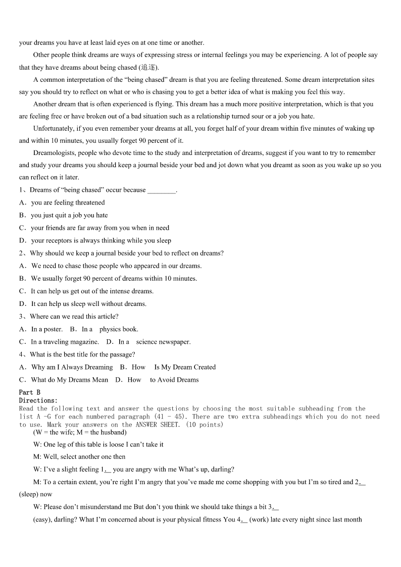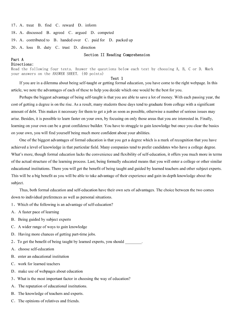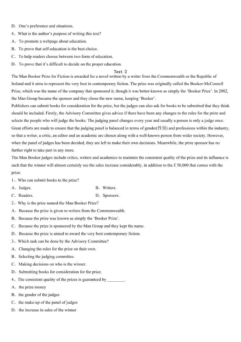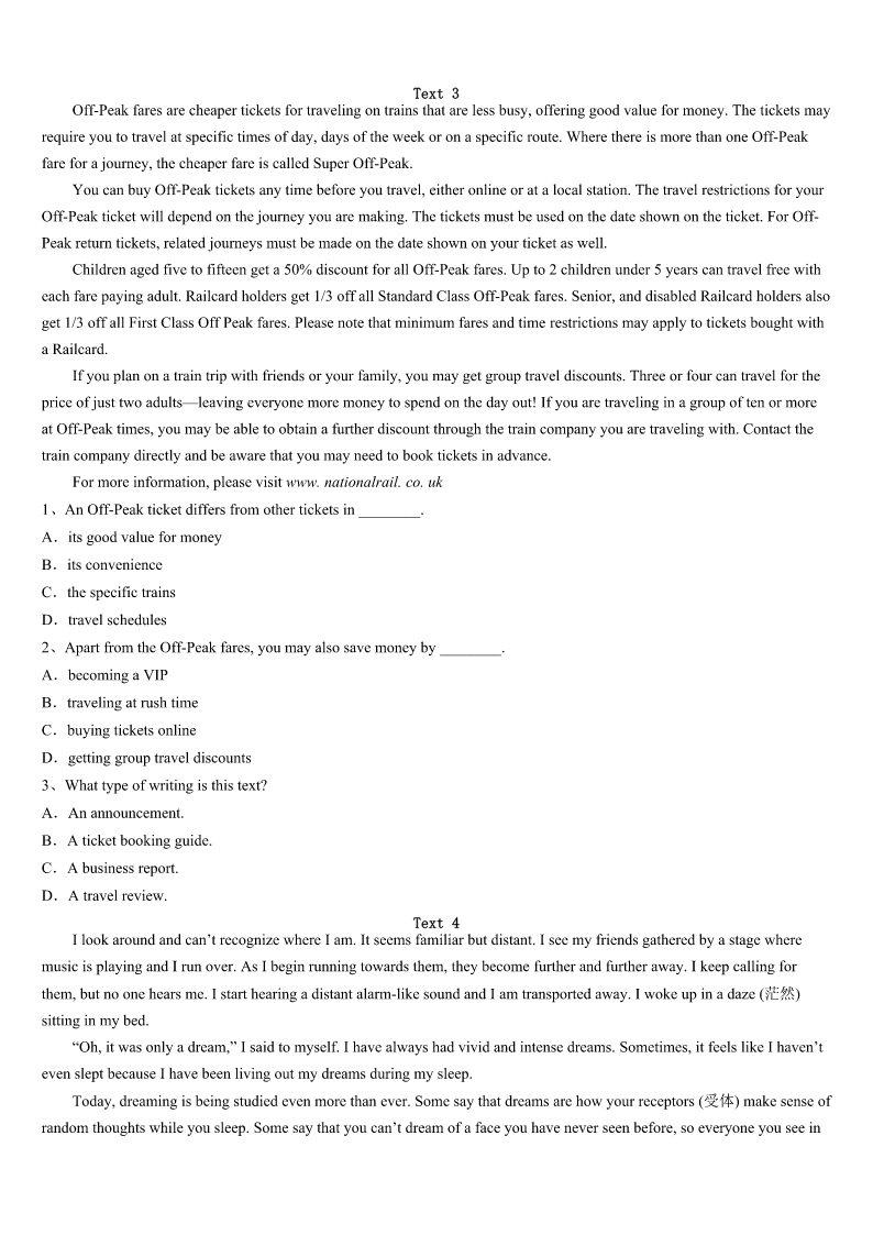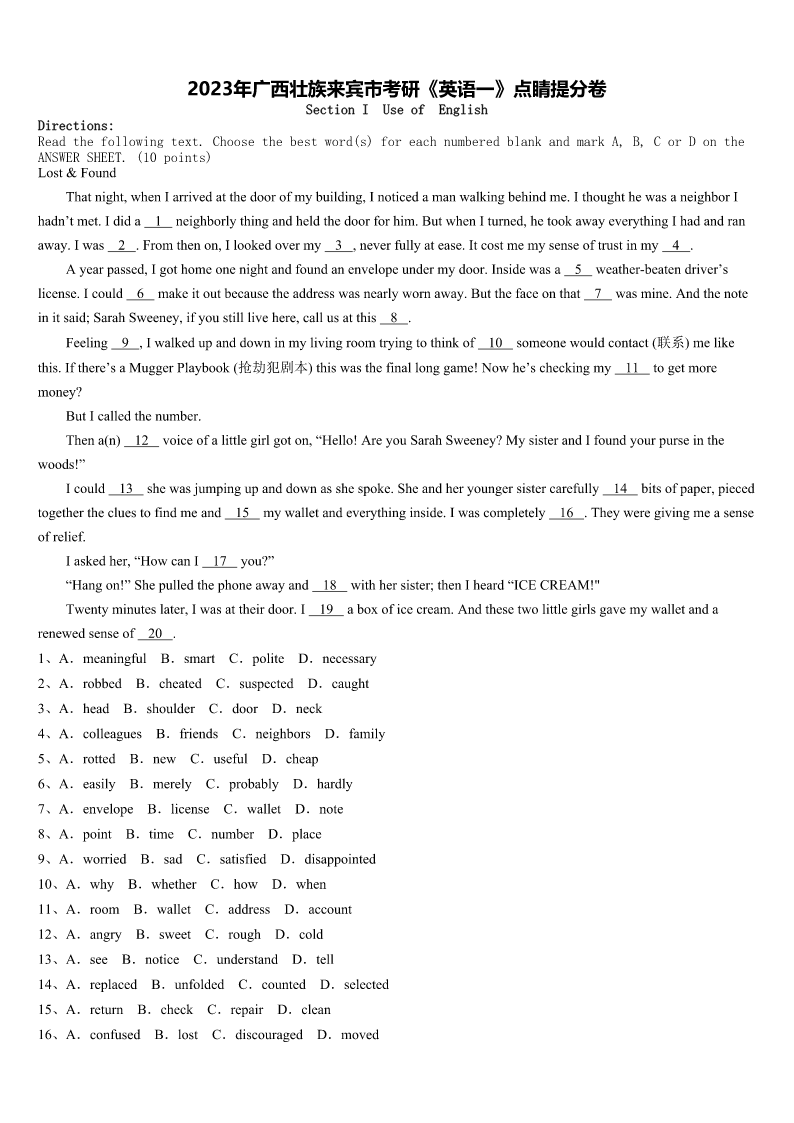 2023年广西壮族来宾市考研《英语一》点睛提分卷 SectionIUseofEnglish Directions: Readthefollowingtext.Choosethebestword(s)foreachnumberedblankandmarkA,B,CorDonthe ANSWERSHEET.(10points) Lost&Found Thatnight,whenIarrivedatthedoorofmybuilding,Inoticedamanwalkingbehindme.IthoughthewasaneighborI hadn’tmet.Idida1neighborlythingandheldthedoorforhim.ButwhenIturned,hetookawayeverythingIhadandran away.Iwas2.Fromthenon,Ilookedovermy3,neverfullyatease.Itcostmemysenseoftrustinmy4. Ayearpassed,Igothomeonenightandfoundanenvelopeundermydoor.Insidewasa5weather-beatendriver’s license.Icould6makeitoutbecausetheaddresswasnearlywornaway.Butthefaceonthat7wasmine.Andthenote initsaid;SarahSweeney,ifyoustilllivehere,callusatthis8. Feeling9,Iwalkedupanddowninmylivingroomtryingtothinkof10someonewouldcontact(联系)melike this.Ifthere’saMuggerPlaybook(抢劫犯剧本)thiswasthefinallonggame!Nowhe’scheckingmy11togetmore money? ButIcalledthenumber. Thena(n)12voiceofalittlegirlgoton,“Hello!AreyouSarahSweeney?MysisterandIfoundyourpurseinthe woods!” Icould13shewasjumpingupanddownasshespoke.Sheandheryoungersistercarefully14bitsofpaper,pieced togetherthecluestofindmeand15mywalletandeverythinginside.Iwascompletely16.Theyweregivingmeasense ofrelief. Iaskedher,“HowcanI17you?” “Hangon!”Shepulledthephoneawayand18withhersister;thenIheard“ICECREAM!" Twentyminuteslater,Iwasattheirdoor.I19aboxoficecream.Andthesetwolittlegirlsgavemywalletanda renewedsenseof20. 1、A.meaningfulB.smartC.politeD.necessary 2、A.robbedB.cheatedC.suspectedD.caught 3、A.headB.shoulderC.doorD.neck 4、A.colleaguesB.friendsC.neighborsD.family 5、A.rottedB.newC.usefulD.cheap 6、A.easilyB.merelyC.probablyD.hardly 7、A.envelopeB.licenseC.walletD.note 8、A.pointB.timeC.numberD.place 9、A.worriedB.sadC.satisfiedD.disappointed 10、A.whyB.whetherC.howD.when 11、A.roomB.walletC.addressD.account 12、A.angryB.sweetC.roughD.cold 13、A.seeB.noticeC.understandD.tell 14、A.replacedB.unfoldedC.countedD.selected 15、A.returnB.checkC.repairD.clean 16、A.confusedB.lostC.discouragedD.moved 17、A.treatB.find