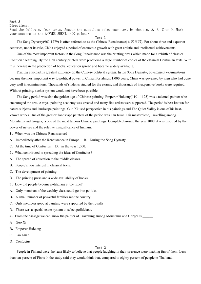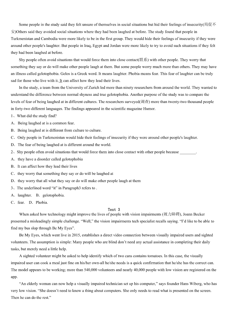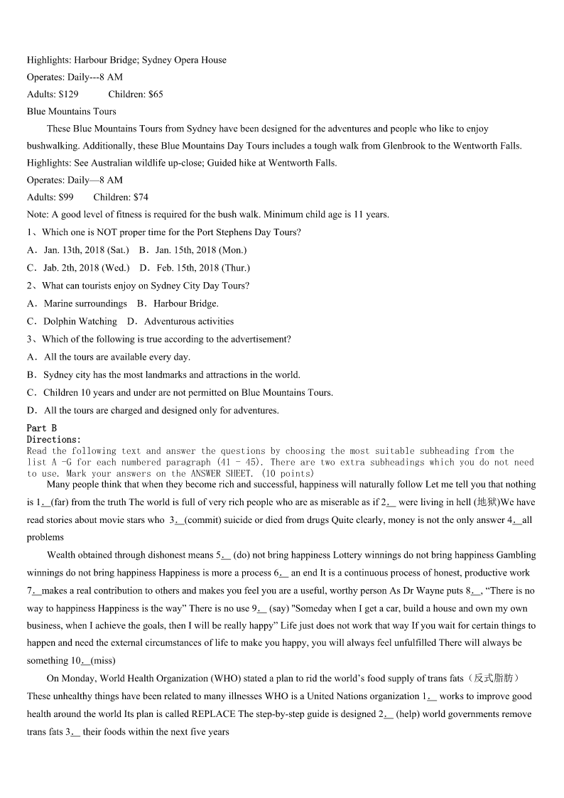 考研《英语一》白城市镇赉县2023年深度预测试卷 SectionIUseofEnglish Directions: Readthefollowingtext.Choosethebestword(s)foreachnumberedblankandmarkA,B,CorDonthe ANSWERSHEET.(10points) IwaswalkingaroundinaBigBazarstoredoingashopping,whenIsawacashiertalkingtoaboywhodidn’thaveenough moneytobuywhathewanted.Thelittleboywasstillholdingthedoll1hishand.Atthattime,IwalkedtowardhimandI askedhimwhohe2togivethisdollto.“It’sthedoll3mysisterlovedmost.Iwantedto4herforherBirthday.” Hiseyesweresosadwhilesayingthis. “MySisterhasgonetobewithGod.DaddysaysthatMommyisgoingtoseeGodverysoontoo,soIthoughtthatshe could5thedollwithhertogiveittomysister.”Myheart6stopped.Thenheshowedmeaverynice7ofhim.He thentoldme“Iwantmommytotakemypicturewithhersomysisterwon’t8me,Ilovemymommy9Iwishshe doesn’thavetoleaveme.” Iquickly10formywalletandsaidtotheboy.“Supposewe11again,justincaseyoudohaveenoughmoney 12thedoll?”Iaddedsomeofmymoneytohis,withouthimseeingandwestartedtocountit. Thelittleboysaid,“Godheardmy13lastnight.ThankGodforgivingmeenough14tobuyit.” ThenIrememberedtwodaysbeforealocal15reportedan16inwhichawomanandalittlegirlwerebadly17 .Thelittlegirldiedrightaway,andthemotherwasleftina18state.Wasthisthefamilyofthelittleboy? Twodays19,Ireadinthenewspaperthatthewomanhadpassedaway.Icouldn'tstopmyselffromgoingtothe20 .Teary-eyed,Ifeltthatmylifehadbeenchangedforever. 1、A.inB.onC.byD.at 2、A.desiredB.wishedC.expectedD.longed 3、A.whatB.whoC.thatD.which 4、A.showB.respectC.representD.gift 5、A.bringB.takeC.fetchD.send 6、A.nearlyB.rarelyC.hardlyD.merely 7、A.presentB.cardC.wishD.photo 8、A.forgetB.forgiveC.hateD.dislike 9、A.butB.sinceC.andD.or 10、A.arrivedB.reachedC.gotD.searched 11、A.checkB.findC.buyD.hold 12、A.withB.forC.toD.on 13、A.wishB.loveC.heartD.prayer 14、A.timeB.belongingsC.moneyD.interest 15、A.newspaperB.reportC.advertisementD.poster 16、A.incidentB.accidentC.eventD.coincidence 17、A.injuredB.harmfulC.woundedD.infected 18、A.seriousB.disturbedC.steadyD.stable 19、A.beforeB.afterwardsC.thenD.later 20、A.storeB.hospitalC.homeD.funeral