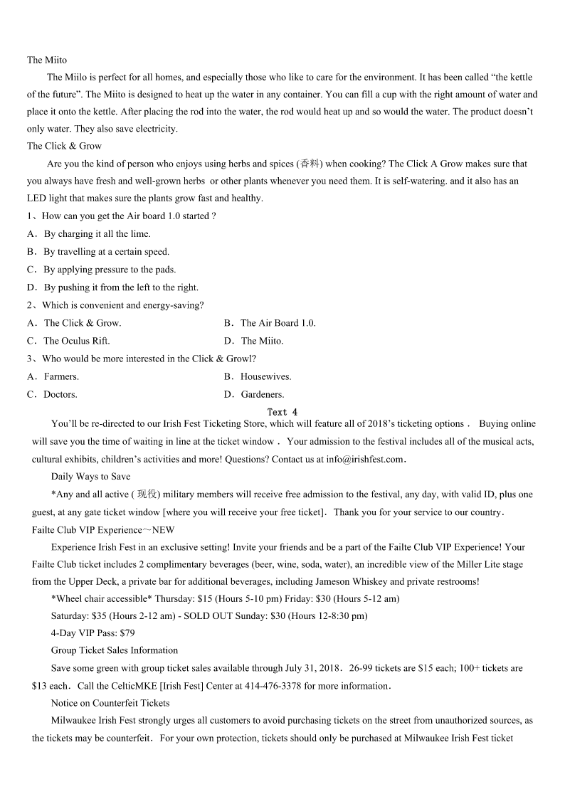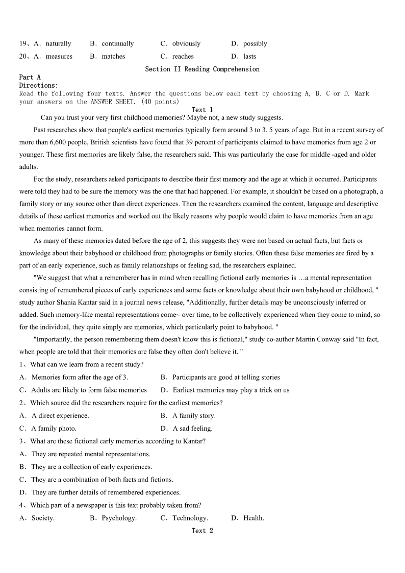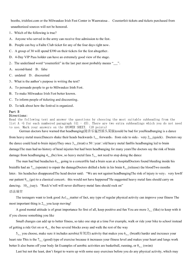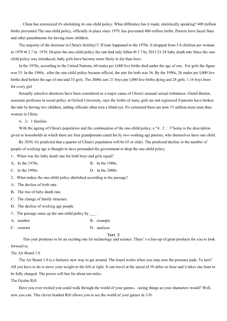 考研《英语一》福建省三明市梅列区2023年预测试卷 SectionIUseofEnglish Directions: Readthefollowingtext.Choosethebestword(s)foreachnumberedblankandmarkA,B,CorDonthe ANSWERSHEET.(10points) Theopeningandclosingofdoorsarethemostsignificantactionsofman’slife.Whata1liesindoors! Nomanknowswhatawaitshimwhenheopensadoor2themostfamiliarroom,wheretheclockticksandthehearthglows redatduskmayharbor3Theworkermayactuallyhavecalledand4theleakingpipe.Thecookmayhavebeenilland demandedherpassport. Therearemanykindsofdoors.Revolvingdoorsforhotels,shopsandpublicbuildings.Therearemany5thebusy,bustling waysofmodernlife.Canyou6WilliamShakespeareorCharlesDickensskippingthrougha7door?Therearedouble doors,slidingdoors,stagedoorsandglassdoors.The8andmysteryofadoorliesinitsqualityofbeinghidden.Aglassdoor isnotadooratall,butawindow.Themeaningofadooristo9whatliesinside;tokeeptheheartinsuspense. Also,therearemanywaysofopeningdoors.Thereisthecheery10ofelbowwithwhichthewaiteropensthekitchendoor. Thereisthesympatheticandawful11ofthedentist’smaidwhoopensthedoorintotheoperatingroomand,without speaking,12thatthedoctorisreadyforyou. Theopeningofdoorshasinitsomeflavorofthe13,somesenseofmovingintoanewmoment.Evenin14,theopening ofadoormaybringrelief.Buttheclosingofdoorscouldbe15,Adoorclosedbrings16toanend.Andtherearedegrees ofsadnessintheclosingofdoors.Adoorslammedisaconfessionofweakness.Adoor17shutmayoftenbethemosttragic gestureinlife. Theopeningandclosingofdoorsisapartoftheseriousfluencyoflife.Lifewillnotstay18andletusalone.Weare19 openingdoorswithhope,closingthemwithdespair.Life20notmuchlongerthanapipeoftobacco,anddestinyknocksus outliketheashes. 1、A.mysteryB.reliefC.sceneryD.pleasure 2、A.SoB.StillC.EvenD.Also 3、A.wishesB.puzzlesC.surprisesD.changes 4、A.checkedB.fixedC.wrappedD.removed 5、A.essentialtoB.differentfromC.consistentwithD.typicalof 6、A.imagineB.suggestC.catchD.notice 7、A.stageB.slidingC.glassD.revolving 8、A.symbolB.miracleC.signD.mark 9、A.busyB.hideC.discoverD.exhibit 10、A.knockB.bumpC.pushD.touch 11、A.silenceB.noise