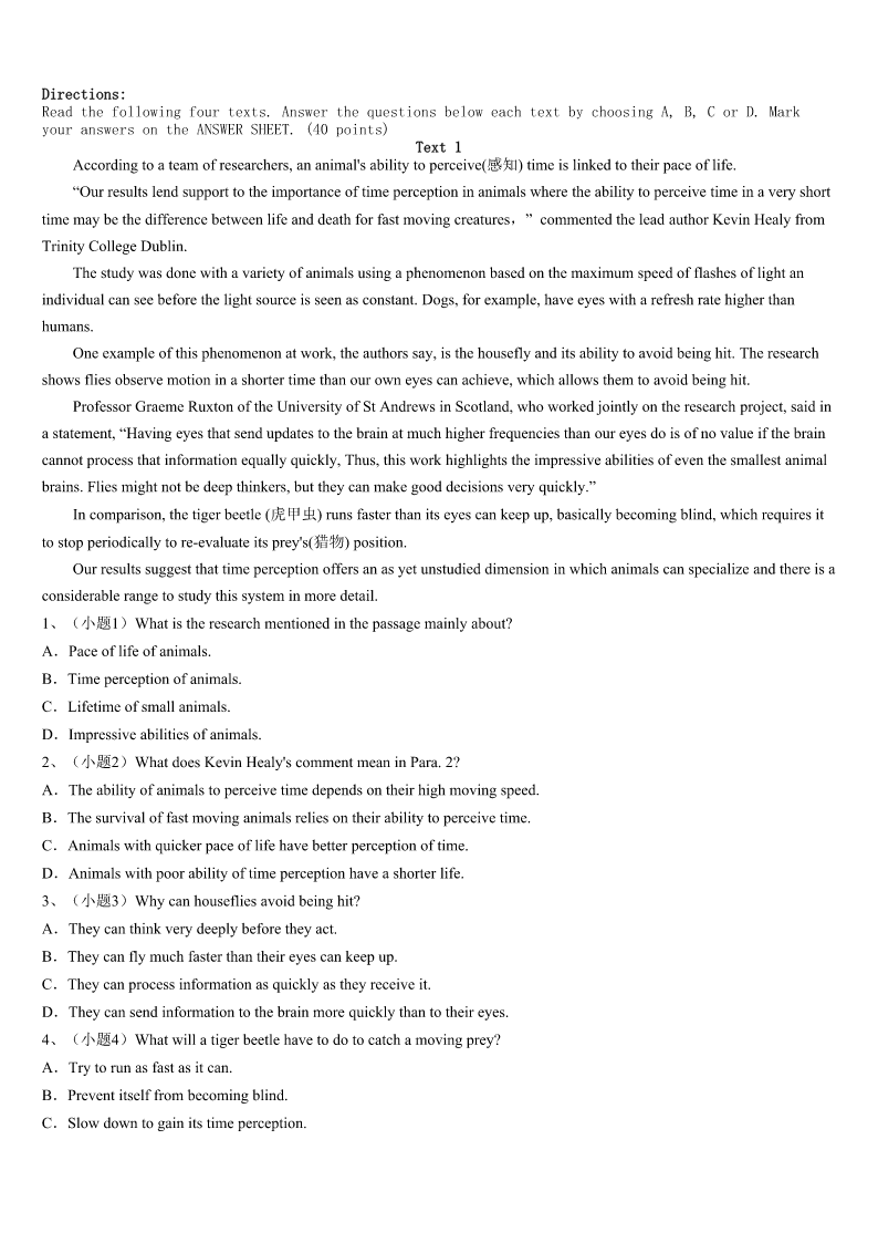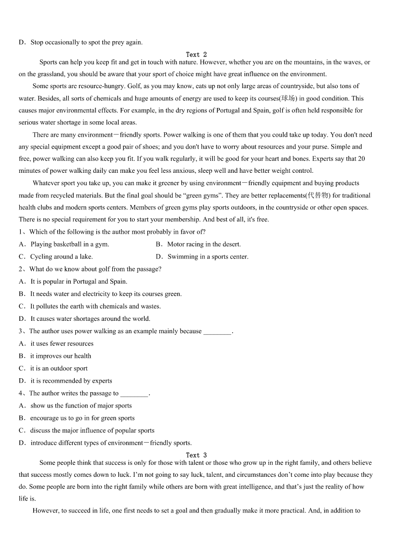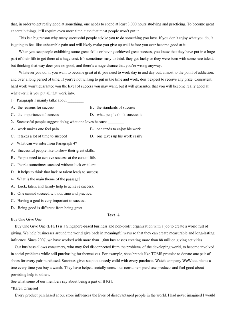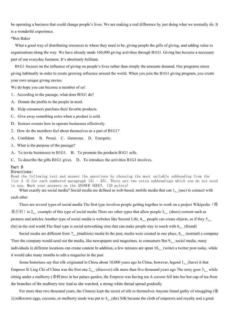 考研《英语一》禄劝彝族苗族自治县2023年预测试题 SectionIUseofEnglish Directions: Readthefollowingtext.Choosethebestword(s)foreachnumberedblankandmarkA,B,CorDonthe ANSWERSHEET.(10points) Kindnessisasimpleanswerinasometimesdifficultandchallengingworld.Foralongtimeithasbeenmyworkto1 andappreciateallpeopleandto2otherstodothesame. WhenmygranddaughterSkylarwasyoungandwe'dgoout,wehada(n)3called"Whocanmakethemostpeople smile?"Andwecontinueittoday.It4forawonderfulday.WhenSkylarseessomeonewalkingdowntheaislewithher5 down,she'llwalkuptoherandgivesherabig6.Iwatchherwalkon.turnaroundandsmileatSkylar7perhapssmileat someoneelse. Kindnessisachainthat8usalltogether.In2002,mydadhadaseriesofstrokesandotherillness.Atthattime,Iwasina women'snetworking9.OnedayIaskedtheladiesiftheycouldsendtheir10energiesandmaybedosomethingnicefor someonetowhomtheywouldnot11thinkaboutdoingsomethingnice. Thatsameday,Imadecookiesforthe12atthepostoffice.WhenIgavehimthecookieshe13lookedalittle embarrassed."Why,Linda?"heasked."BecauseI14you!"Ianswered."WhenIgethereat6a.m.anditisstill15 outside,knowingyouareinsidemakesmefeel16.AndwhenIfirstmovedhereandmypostoffice17wasalways empty,youalways18meon.Andyoukeepthisplace19."Thateveninghiswifecalledmeandsaidthathewas20."No oneevenknowshisname,letalonebakeshimcookies!" 1、A.observeB.recommendC.acknowledgeD.judge 2、A.encourageB.trainC.praiseD.comfort 3、A.contestB.speechC.surpriseD.involvement 4、A.answersB.appliesC.searchesD.makes 5、A.luckB.headC.handD.shoulder 6、A.signB.shoutC.smileD.gift 7、A.butB.stillC.soD.or 8、A.takesB.pullsC.urgesD.protects 9、A.achievementB.communicationC.organizationD.skill 10、A.positiveB.possibleC.exactD.common 11、A.adequatelyB.properlyC.increasinglyD.normally 12、A.managerB.businessmanC.guardD.protector 13、A.consequentlyB.strangelyC.otherwiseD.actually 14、A.trustB.appreciateC.admireD.inspire 15、A.darkB.coldC.lonelyD.inconvenient 16、A.excitedB.pleasedC.safeD.curious 17、A.addressB.boxC.windowD.seat 18、A.countedB.turnedC.putD.cheered 19、A.spotlessB.cheerlessC.fearlessD.fr