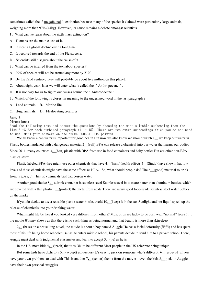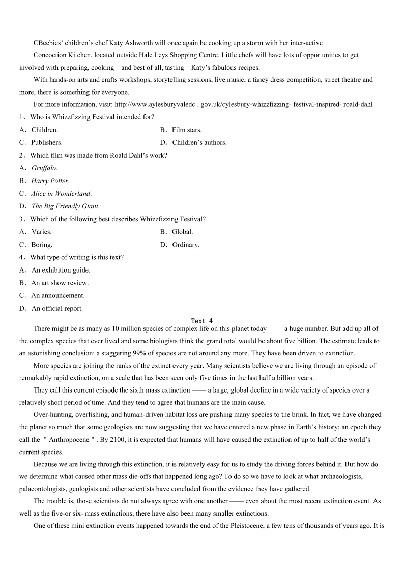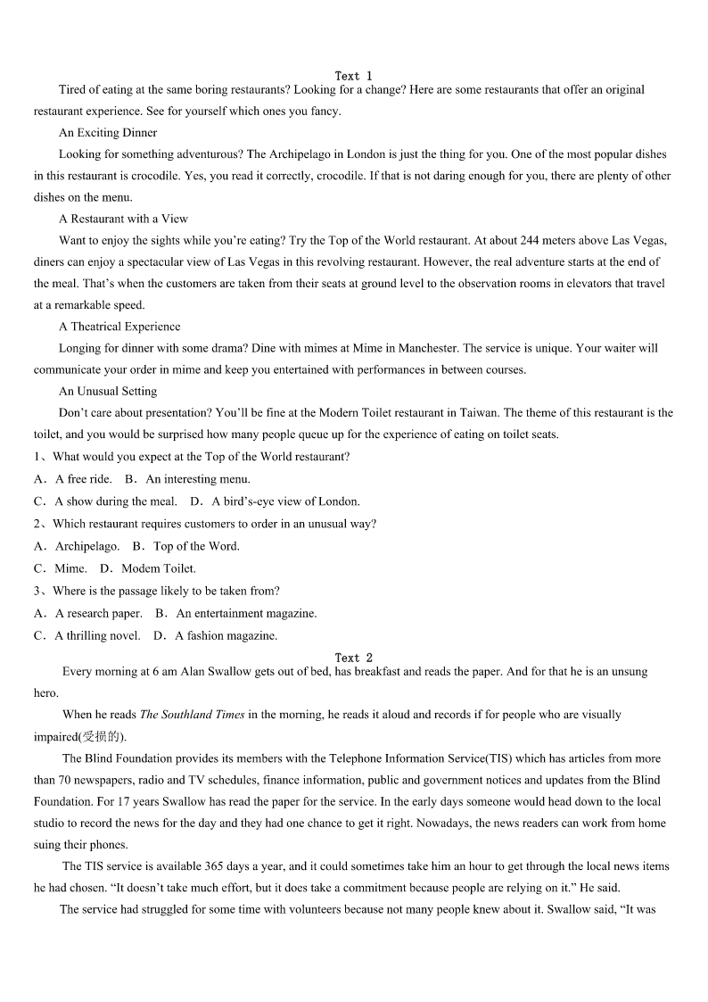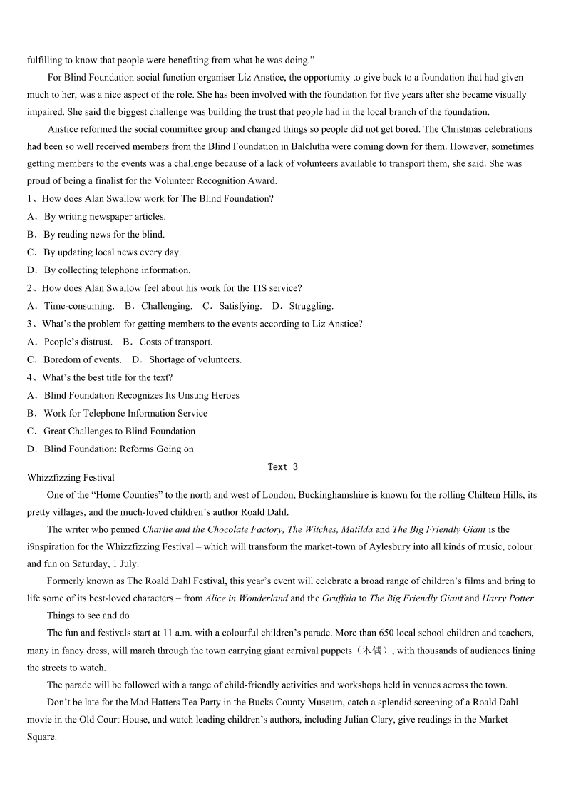 2023年廊坊市固安县考研《英语一》考前冲刺预测试卷 SectionIUseofEnglish Directions: Readthefollowingtext.Choosethebestword(s)foreachnumberedblankandmarkA,B,CorDonthe ANSWERSHEET.(10points) Wehaveallheardhowtimeismorevaluablethanmoney,butisit1tohavetoomuch? I2backinhighschoolIspentmostofmydayatschoolsinceIalso3ateamsport.BythetimeIgothome,Ionly hadafewhourstodomyhomework,andIhadtodoit4 WhenIgotintocollege,things5Isuddenlyfoundmyselfoutofclassbeforenoontime.Becauseofallthis6there wasnosenseof7todomyschoolworkimmediately.Iwasperformingthisactionofwaitinguntilitlaterbecame8. Oncethathappened,Ijustkept9mystudyingfurtherandfurtherbackinmyday.ThenIgottothepointwhereIwas10 reallylateatnighttogetmyworkalone. OnedayI11aformerclassmateofminewhowas12alotofmoneyrunningasideline(副业).Sincehisregularjob was13,Iaskedhimwhyhejustdidn'tdohissidelinefull-time.Hesaidwithoutthejob,hewould14havetoomuch timeandwouldjustdowhatIdidbackin15.Hesaidthatifhe16thejob,hewouldlosehis17toworkandsucceed. So,try18yourtimewithotherwork.Thisiswhythereisa19thatifyouwantsomethingdone,aska20person todoit. 1、A.trueB.fairC.strangeD.possible 2、A.rememberB.admitC.understandD.expect 3、A.watchedB.loved.C.CoachedD.played 4、A.atlastB.rightawayC.ofcourseD.mattered 5、A.happenedB.repeatedC.changedD.mattered 6、A.extraB.difficult.C.valuableD.limited 7、A.dutyB.achievementC.urgencyD.direction 8、A.burdenB.reliefC.riskD.habit 9、A.pushingB.takingC.settingD.calling 10、A.hangingoutB.stayingupC.joggingroundD.showingoff 11、A.metB.helpedC.treatedD.hired 12、A.raisingB.wastingC.demandingD.making 13、A.safeB.importantC.boringD.rewarding 14、A.luckilyB.hardlyC.hopefullyD.simply 15、A.childhoodB.collegeC.townD.business 16、A.quitB.foundC.acceptedD.kept 17、A.heartB.chanceC.driveD.way 18、A.savingB.fillingupC.givingupD.trading 19、A.messageB.storyC.sayingD.fact 20、A.carefulB.busyC.reliableD.kind SectionIIReadingComprehension PartA Directions: Readthefollowingfourtexts.AnswerthequestionsbeloweachtextbychoosingA,B,CorD.Mark youranswersontheANSWERSHEET.(40points) Tex