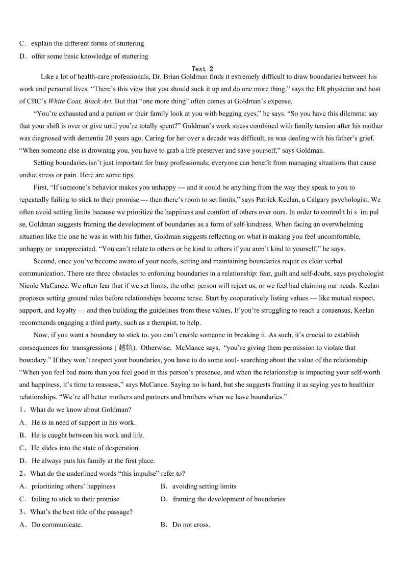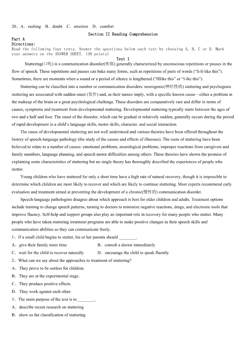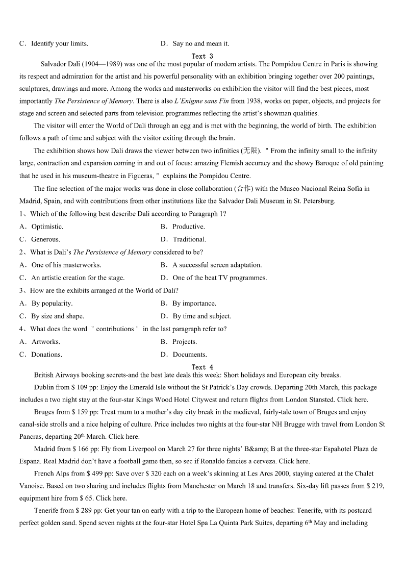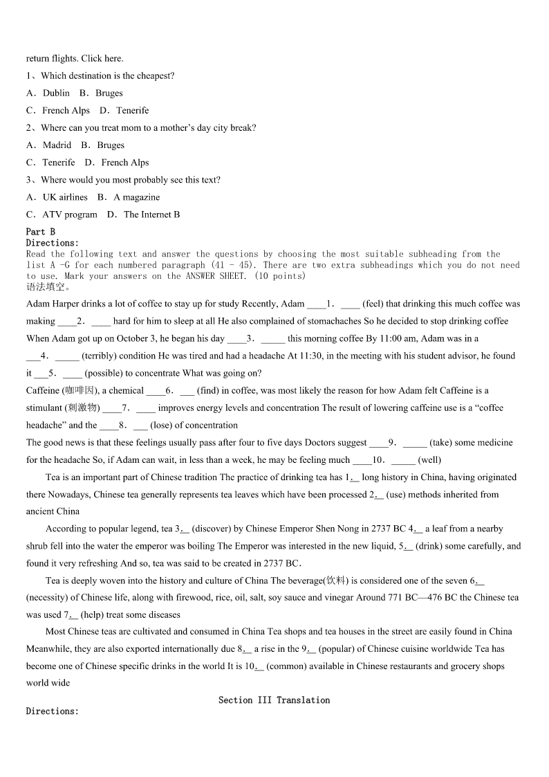 考研《英语一》眉山市仁寿县2023年深度自测卷 SectionIUseofEnglish Directions: Readthefollowingtext.Choosethebestword(s)foreachnumberedblankandmarkA,B,CorDonthe ANSWERSHEET.(10points) 阅读下面短文,从短文后所给各题四个选项(A、B、C和D)中,选出可以填入空白处的最佳选项。并在答题卡 上将该项涂黑。 At18,IwasontheflighttoEuropeforthefirsttime.Excitedaboutthe1ofalifetime,Ienjoyedafreein-flightmeal.I even2asandwichforlater. AttheLisbonairport,Igotmybackpackoffthe3conveyer(传送带)withthehelpofanother4.Igottotheyouth hostel(青年旅行社)I’dstayat.ButIhadonlyonedaytoseeeverything,sobarelystoppingto5aftermyovernightflight,I headedouttotakephotosofvariousbuildings. Thenextmorningat6a.m.,Iwasto6toBrussels.Isetmyalarmforasuper-earlystart,butIwas7whetherthe buttononthetophadtobeupordown.Obviously,Ihadmadea8becausethenextmorningI9onlyashortwhile beforesunrise.I10,tookmybelongingsandrushedtothebusstop.Iwasextremely11withthebusdriverpullingover everyfewminutes.12whatseemedages,Iarrived,onlytobetolditwastoolate.Tearsstreameddownmycheeks. Fortunately,thefriendlyladyatthedesk13toputmeontheflightthenextmorningatnoextracost.Whata14! 15,Ihadtospendthenext22hoursattheairport.Bylateafternoon,Iwastruly16sittingallday.ThenIgotto knowayoungmanwho17parcelstoandfromtheairport.SoIaskedhimtotakemeoutfortheevening.Tomysurprise, heacceptedmy18withouthesitation.Oh!Allthebeautifulpalacesandancientbuildings! Thiswasfunformeatleast;therewasamantokeepmy19andIhadenoughtimetotakeinsightswithout20.He evendroppedmeoffjustbefore4a.m.Thatwasmyfirstadventure. 1、A.storyB.purposeC.adventureD.freedom 2、A.turneddownB.setupC.turnedinD.setaside 3、A.baggageB.petrolC.foodD.rubbish 4、A.pilotB.passengerC.clerkD.cleaner 5、A.restB.playC.thinkD.explain 6、A.driveB.flyC.hikeD.swim 7、A.concernedB.curiousC.afraidD.uncertain 8、A.mistakeB.differenceC.planD.decision 9、A.wokeB.wroteC.sleptD.stayed 10、A.washedB.panickedC.laughedD.cooked 11、A.worriedB.impoliteC.impatientD.content 12、A.WhileB.BeforeC.WhenD.After 13、A.offeredB.attemptedC.aimedD.paused 14、A.pityB.bargainC.reliefD.loss 15、A.AnywayB.HoweverC.BesidesD.Other