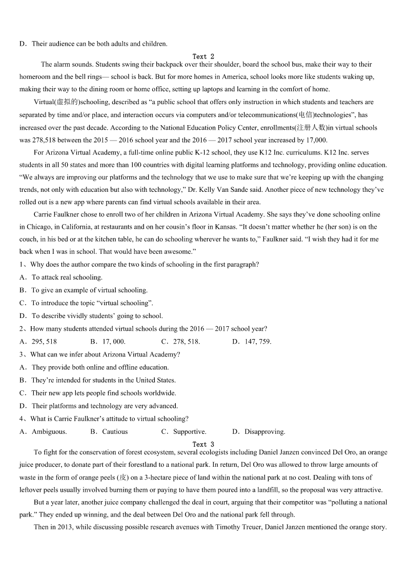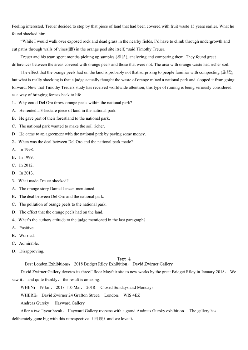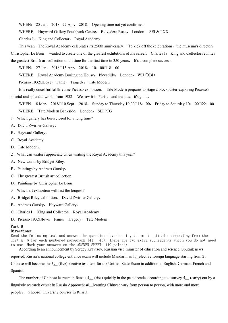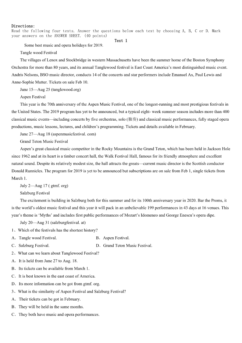 考研《英语一》福建省宁德市周宁县2023年全真模拟试题 SectionIUseofEnglish Directions: Readthefollowingtext.Choosethebestword(s)foreachnumberedblankandmarkA,B,CorDonthe ANSWERSHEET.(10points) Hundredsofpeoplehaveformedimpressionsofyouthroughthatlittledevice(装置)onyourdesk.Andthey’venever actually1you.Everythingtheyknowaboutyou2throughthisdevice,sometimesfromhundredsofmilesaway.3 theyfeeltheycanknowyou4fromthesoundofyourvoice.That’showpowerfulthe5is. Powerful,yes,butnotalways6.ForyearsIdealtwithmytravelagentonlybyphone.Rani,myfacelessagentwhom I’dnevermet7,gotmerock-bottompricesonairfares,cars,andhotels.Buthercoldvoicereally8me.Isometimes wishedto9anotheragent. Onemorning,Ihadto10animmediateflighthomeforafamilyemergency.IranintoRani’soffice11.The womansittingatthedesk,12mymadness,sympatheticallyjumpedup.Shegavemea13smile,noddedwhilelistening patiently,andthenprintedoutthe14immediately."Whatawonderfullady!"Ithought. Rushingout15Icalledoutovermyshoulder,"Bytheway,what’syourname?""I’mRani,"shesaid.Iturned aroundandsawa16womanwithabigsmileonherfacewavingtowishmeasafetrip.Iwas17!WhyhadIthought shewascold?Raniwas,well,so18. Sittingbackinthecaronthewaytotheairport,Ifigureditallout.Rani’s19—herwarmsmile,hernods,her‘I’m hereforyou’20—wereallsilentsignalsthatdidn’ttravelthroughwires. 1、A.acceptedB.noticedC.heardD.met 2、A.cameB.movedC.ranD.developed 3、A.ThusB.YetC.ThenD.Indeed 4、A.ratherB.alsoC.justD.already 5、A.telephoneB.voiceC.connectionD.impression 6、A.directB.usefulC.easyD.accurate 7、A.inpersonB.bymyselfC.inpublicD.onpurpose 8、A.annoyedB.interestedC.discouragedD.confused 9、A.promoteB.trainC.findD.know 10、A.arrangeB.postponeC.confirmD.book 11、A.forthefirsttimeB.atanytimeC.fromtimetotimeD.ingoodtime 12、A.expectingB.seeingC.testingD.avoiding 13、A.shyB.comfortingC.familiarD.forced 14、A.billB.formC.ticketD.list 15、A.hopefullyB.disappointedlyC.gratefullyD.regretfully 16、A.carefulB.seriousC.nervousD.pleasant 17、A.amusedB.worriedC.helplessD.speechless 18、A.calmB.niceC.proudD.clever 19、A.forgivenessB.eagerne