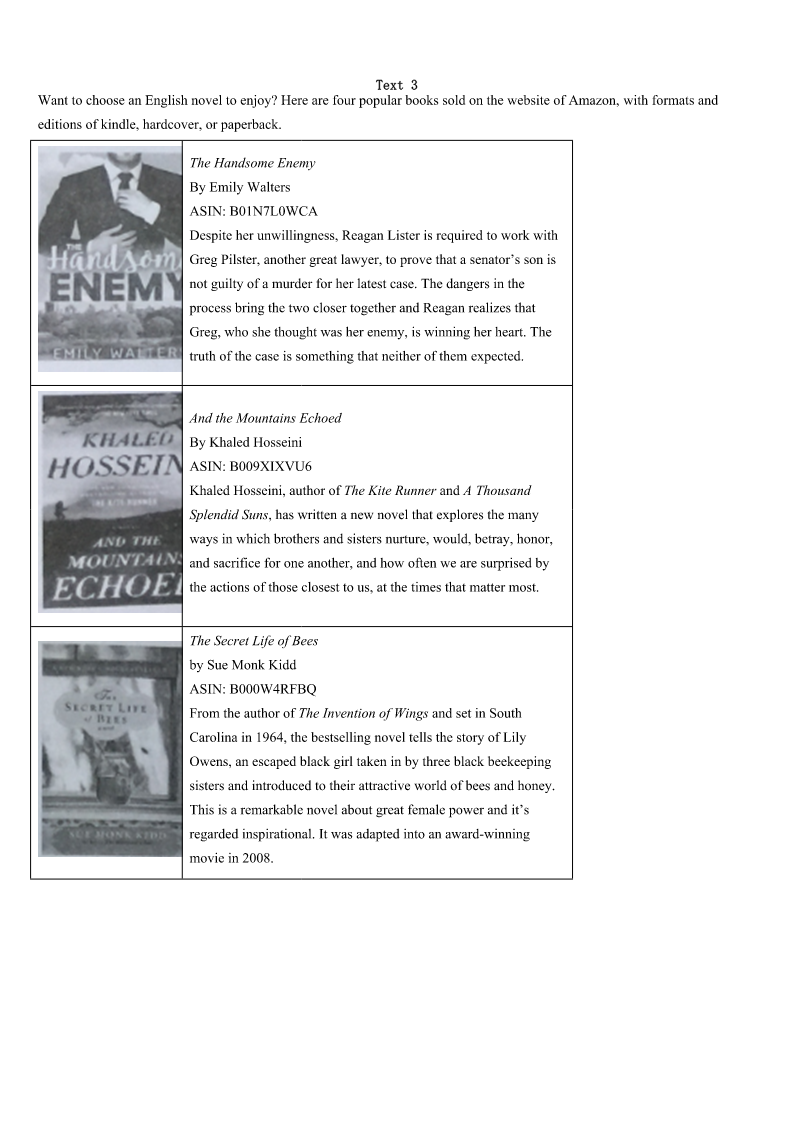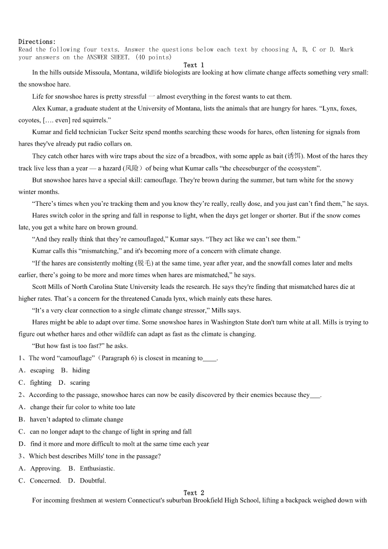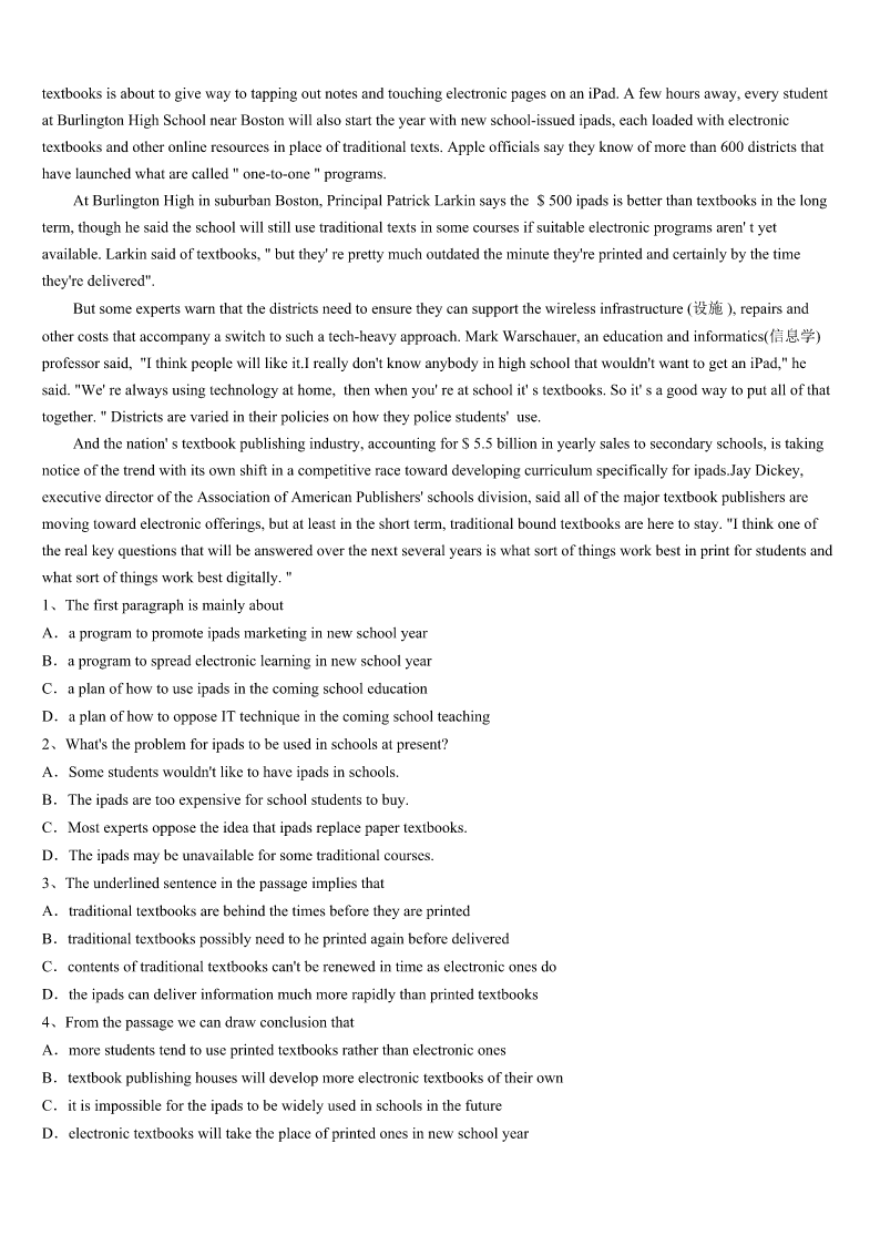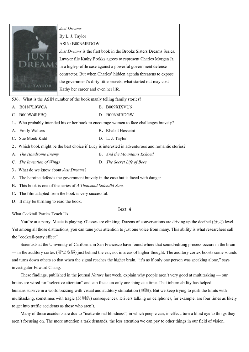 考研《英语一》祁连县2023年高分冲刺试卷 SectionIUseofEnglish Directions: Readthefollowingtext.Choosethebestword(s)foreachnumberedblankandmarkA,B,CorDonthe ANSWERSHEET.(10points) Ijusthadtwolovelyconversationswithmylong-termfriends.First,Iwaspleasedtohavean1meetingwithBryan. He’sCEOofagovernmentagencyandoneofthefirstpeopleI2whenImovedtoMedicineHat.I3toworkthat morningeighteenyearsagoandhequicklybeganintroducingmetootheremployees.His4wasappreciatedandwebegana closefriendshiprightthenashegavemeacomfortable5inmynewworkplace.OverthenextfewyearsBryanwould6 meattheoffice.Thereweremanytimeswhenwe7together.Wedidn’tseeeachothervery8afterImovedonwithother careerpaths.Latethisafternoon,weunexpectedlymetatastoreandstoodinthecoldbesideour9intheparkinglotforan hour.We10memoriesandinspiredeachotherwithtalesofourexperiences. OnedayIsawthelightonmyphoneflashingandthensawthe11messageleftformebyanother12Chris,whohas beeninmylifesince1973.He’sreturnedtoretireand13inhishometownofWhitewood,wherewefirstmet.14not havinglivedinthesametownorcitysincethen,we’veheldeachotherinour15forthepastfourdecades.Evenwhenwe’re all16anddon’tmakecontactwitheachotherformonths,italwaysfeelsliketimehasn’tpassedsinceourlast17.We understandandcareabouteachotherandthat’sallthat18. Mostdictionaries19afriendissomeoneyou“know,likeandtrust”.I’mgratefulthatmanyofmyfriendshipsgowell 20that. 1、A.unfairB.unluckyC.unplannedD.unpleasant 2、A.metB.hatedC.taughtD.hurt 3、A.forgotB.refusedC.wantedD.reported 4、A.experienceB.kindnessC.courageD.praise 5、A.endB.bedC.pastD.start 6、A.visitB.noticeC.attractD.punish 7、A.criedB.sangC.laughedD.danced 8、A.secretlyB.rarelyC.nervouslyD.frequently 9、A.taxisB.carsC.busesD.houses 10、A.storedB.clearedC.sharedD.lost 11、A.sweetB.anxiousC.terribleD.ordinary 12、A.leaderB.friendC.brotherD.employee 13、A.hidB.workedC.diedD.lived 14、A.IfB.WhenC.ThoughD.Because 15、A.roomsB.heartsC.officesD.families 16、A.busyB.patientC.regretfulD.tired 17、A.practiceB.successC.talkD.show 18、A.liesB.worksC.differsD.matters 19、A.requireB.sta