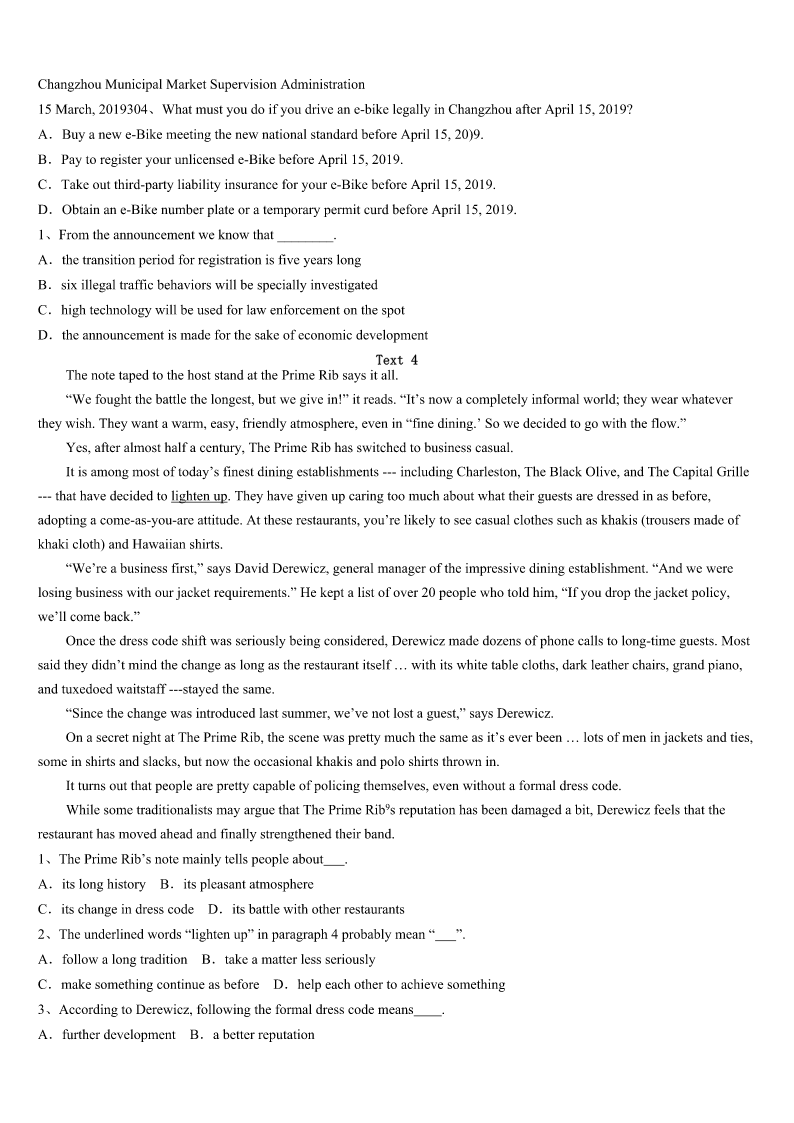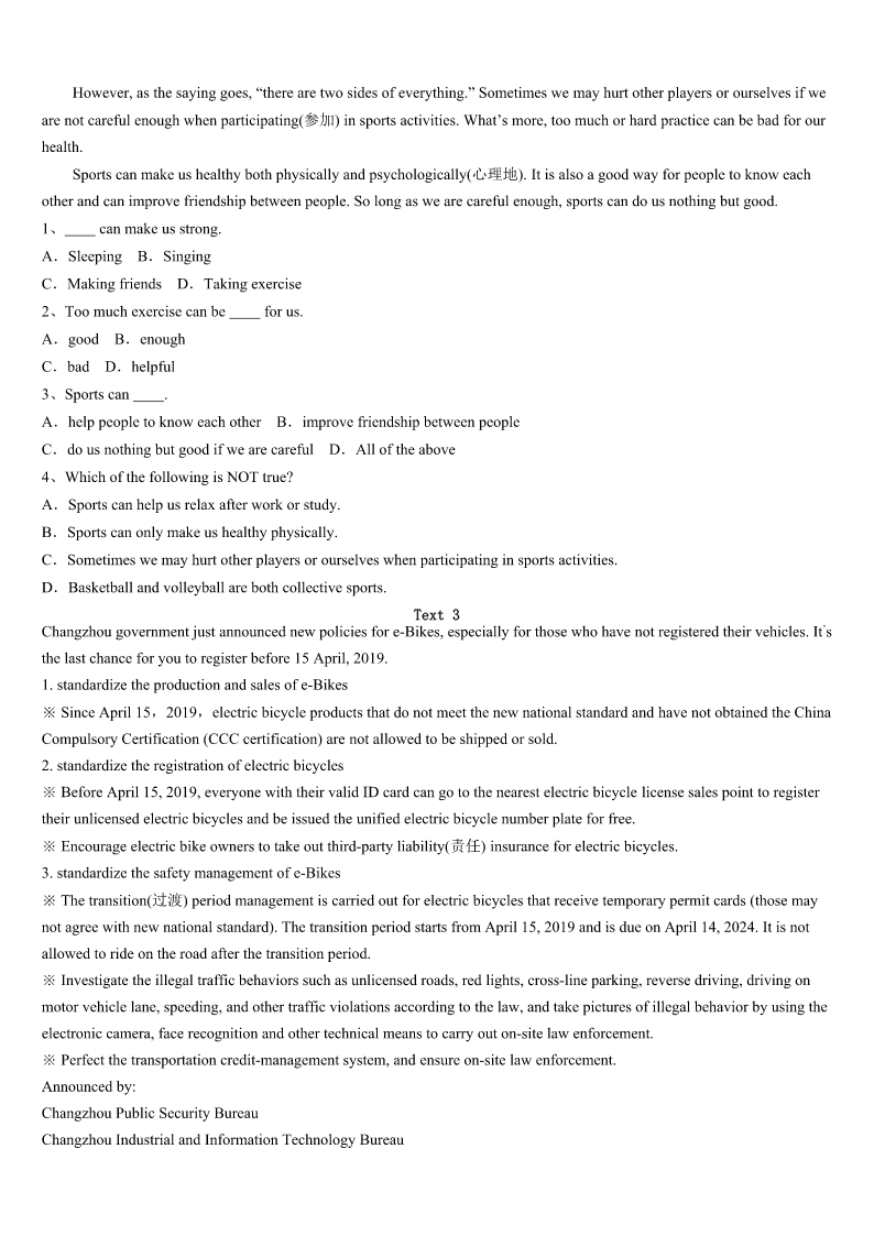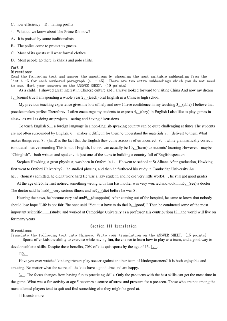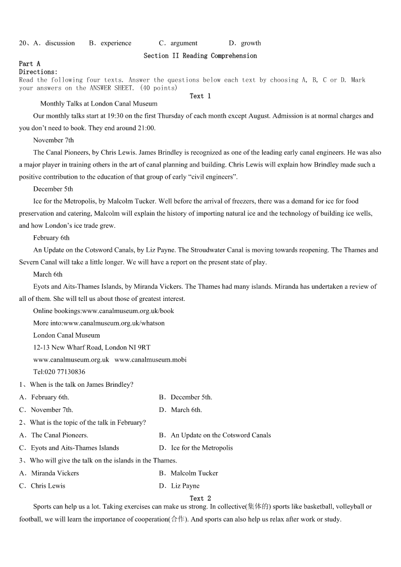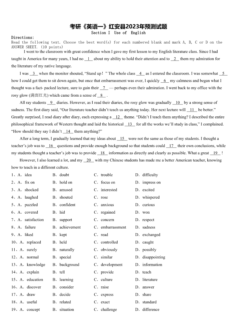 考研《英语一》红安县2023年预测试题 SectionIUseofEnglish Directions: Readthefollowingtext.Choosethebestword(s)foreachnumberedblankandmarkA,B,CorDonthe ANSWERSHEET.(10points) IwenttotheclassroomwithgreatconfidencewhenIgavemyfirstlessontomyEnglishliteratureclass.SinceIhad taughtinAmericaformanyyears,Ihadno1aboutmyabilitytoholdtheirattentionandto2themmyadmirationfor theliteratureofmynativelanguage. Iwas3whenthemonitorshouted,“Standup!”Thewholeclass4asIenteredtheclassroom.Iwassomewhat5 howIcouldgetthemtositdownagain,butoncethatembarrassmentwasover,Iquickly6mycalmnessandbeganwhatI thoughtwasafact-packedlecture,suretogaintheir7—perhapseventheiradmiration.Iwentbacktomyofficewiththe rosyglow(满面红光)whichcamefromasenseof8. Allraystudents9diaries.However,asIreadtheirdiaries,therosyglowwasgradually10byastrongsenseof sadness.Thefirstdiarysaid,“Ourliteratureteacherdidn’tteachusanythingtoday.Hernextlecturewill11bebetter.” Greatlysurprised,Ireaddiaryafterdiary,eachexpressinga12theme.“Didn’tIteachthemanything?Idescribedtheentire philosophicalframeworkofWesternthoughtandlaidthehistorical13foralltheworkswe’llstudyinclass,”Icomplained. “HowshouldtheysayIdidn’t14themanything?” Afteralongterm,Igraduallylearnedthatmyideasabout15werenotthesameasthoseofmystudents.Ithoughta teacher’sjobwasto16questionsandprovideenoughbackgroundsothatstudentscould17theirownconclusions,while mystudentsthoughtateacher’sjobwastoprovide18informationasdirectlyandclearlyaspossible.Whatagreat19! However,Ialsolearnedalot,andmy20withmyChinesestudentshasmademeabetterAmericanteacher,knowing howtoteachinadifferentculture. 1、A.ideaB.doubtC.troubleD.difficulty 2、A.fixonB.holdonC.focusonD.impresson 3、A.shockedB.amusedC.interestedD.excited 4、A.laughedB.shoutedC.roseD.whispered 5、A.puzzledB.confidentC.anxiousD.curious 6、A.coveredB.hidC.regainedD.won 7、A.satisfactionB.supportC.concernD.respect 8、A.failureB.achievementC.embarrassmentD.sadness 9、A.likedB.keptC.readD.exchanged 10、A.replacedB.heldC.controlledD.caught 11、A.surelyB.naturallyC.obviou