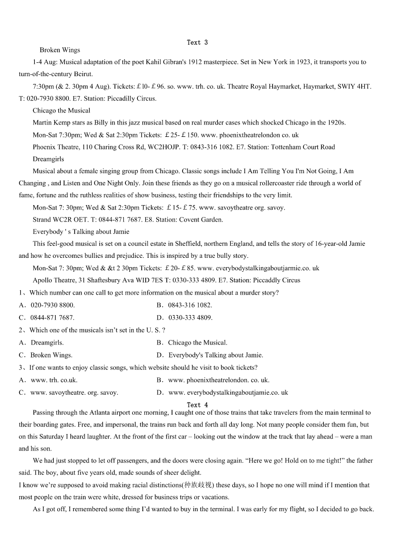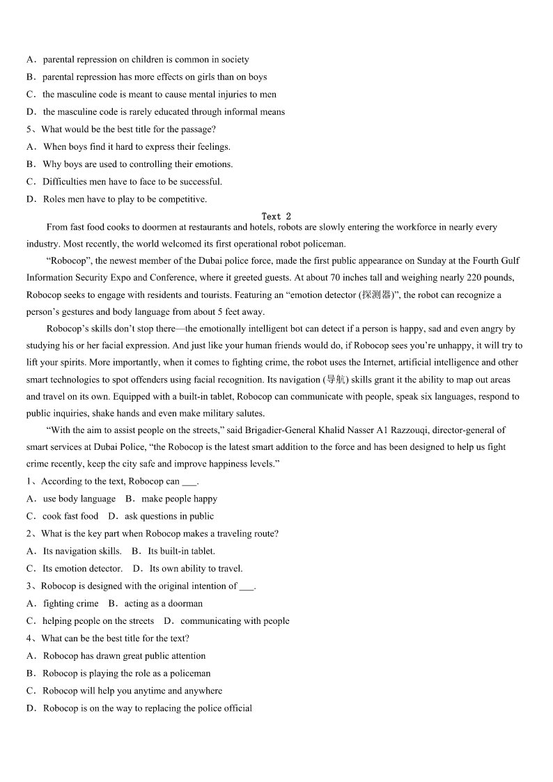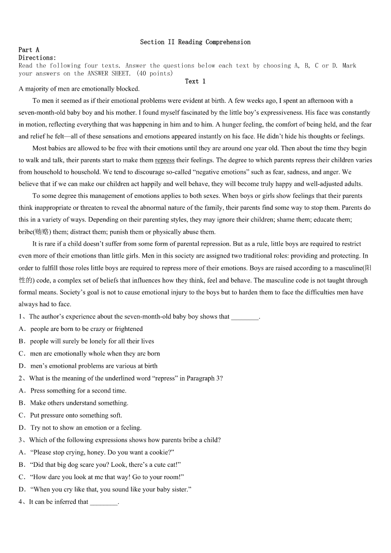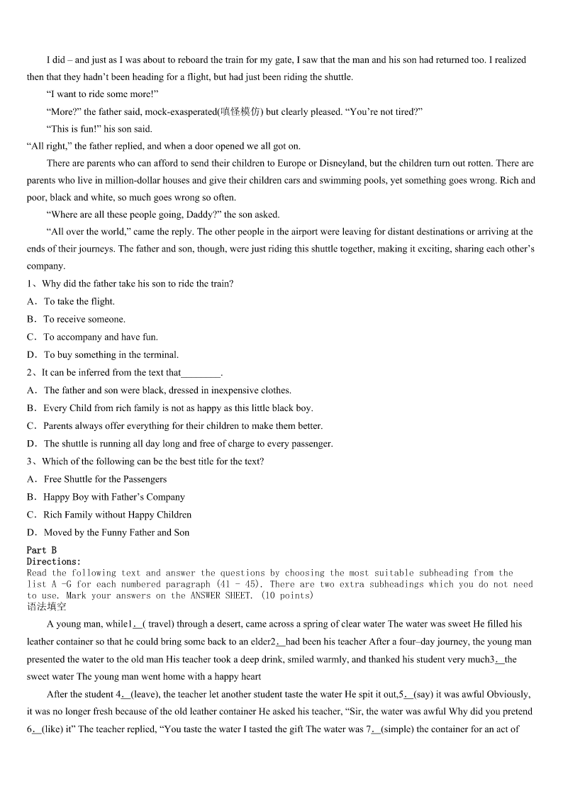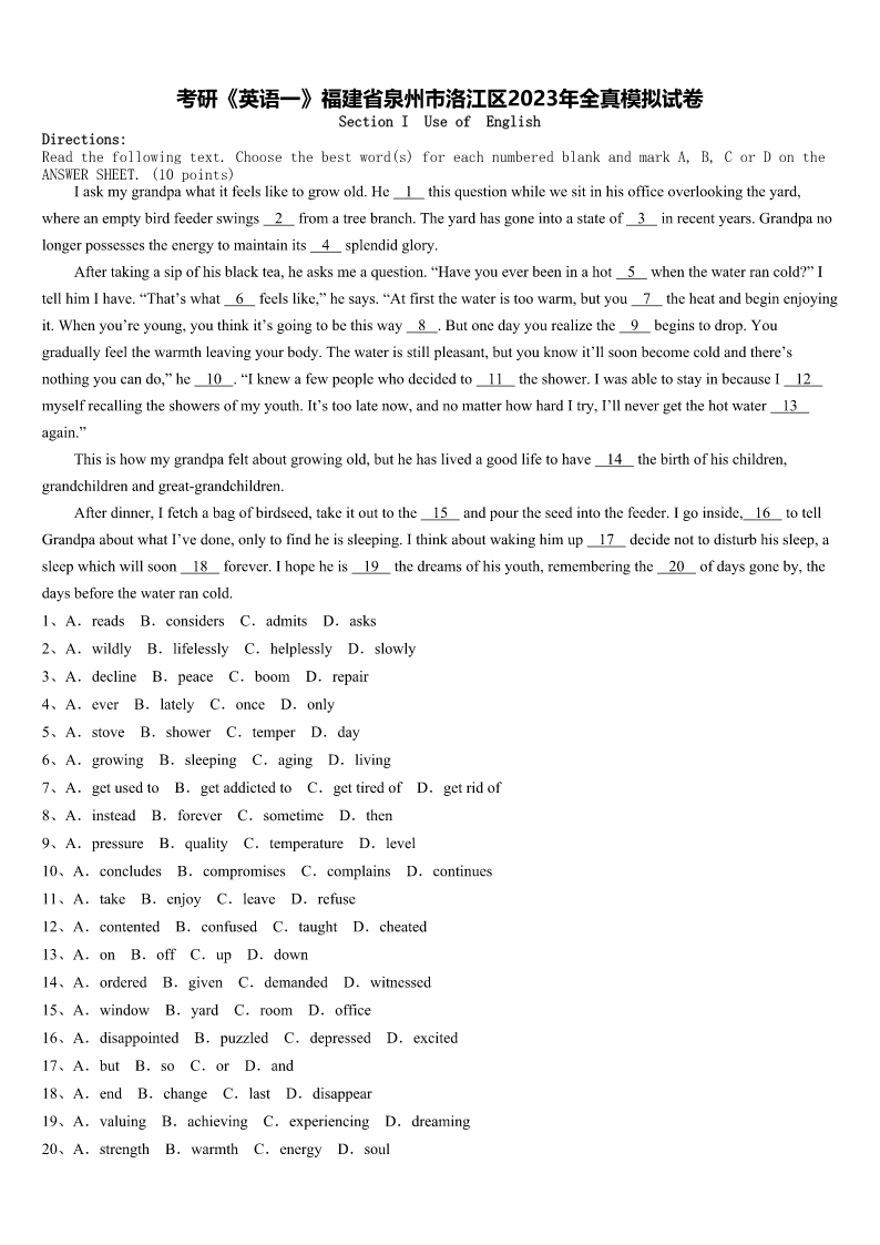 考研《英语一》福建省泉州市洛江区2023年全真模拟试卷 SectionIUseofEnglish Directions: Readthefollowingtext.Choosethebestword(s)foreachnumberedblankandmarkA,B,CorDonthe ANSWERSHEET.(10points) Iaskmygrandpawhatitfeelsliketogrowold.He1thisquestionwhilewesitinhisofficeoverlookingtheyard, whereanemptybirdfeederswings2fromatreebranch.Theyardhasgoneintoastateof3inrecentyears.Grandpano longerpossessestheenergytomaintainits4splendidglory. Aftertakingasipofhisblacktea,heasksmeaquestion.“Haveyoueverbeeninahot5whenthewaterrancold?”I tellhimIhave.“That’swhat6feelslike,”hesays.“Atfirstthewateristoowarm,butyou7theheatandbeginenjoying it.Whenyou’reyoung,youthinkit’sgoingtobethisway8.Butonedayyourealizethe9beginstodrop.You graduallyfeelthewarmthleavingyourbody.Thewaterisstillpleasant,butyouknowit’llsoonbecomecoldandthere’s nothingyoucando,”he10.“Iknewafewpeoplewhodecidedto11theshower.IwasabletostayinbecauseI12 myselfrecallingtheshowersofmyyouth.It’stoolatenow,andnomatterhowhardItry,I’llnevergetthehotwater13 again.” Thisishowmygrandpafeltaboutgrowingold,buthehaslivedagoodlifetohave14thebirthofhischildren, grandchildrenandgreat-grandchildren. Afterdinner,Ifetchabagofbirdseed,takeitouttothe15andpourtheseedintothefeeder.Igoinside,16totell GrandpaaboutwhatI’vedone,onlytofindheissleeping.Ithinkaboutwakinghimup17decidenottodisturbhissleep,a sleepwhichwillsoon18forever.Ihopeheis19thedreamsofhisyouth,rememberingthe20ofdaysgoneby,the daysbeforethewaterrancold. 1、A.readsB.considersC.admitsD.asks 2、A.wildlyB.lifelesslyC.helplesslyD.slowly 3、A.declineB.peaceC.boomD.repair 4、A.everB.latelyC.onceD.only 5、A.stoveB.showerC.temperD.day 6、A.growingB.sleepingC.agingD.living 7、A.getusedtoB.getaddictedtoC.gettiredofD.getridof 8、A.insteadB.foreverC.sometimeD.then 9、A.pressureB.qualityC.temperatureD.level 10、A.concludesB.compromisesC.complainsD.continues 11、A.takeB.enjoyC.leaveD.refuse 12、A.contentedB.confusedC.taughtD.cheated 13、A.onB.offC.upD.down 14、A.orderedB.givenC.demandedD.witnessed 15、A.windowB.yardC.roomD.office 16、A.disa
