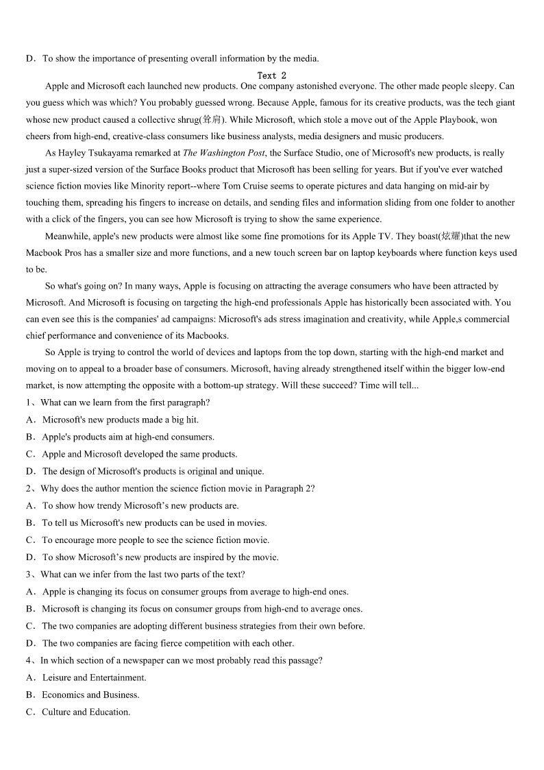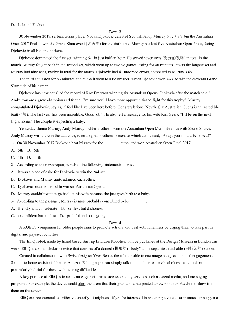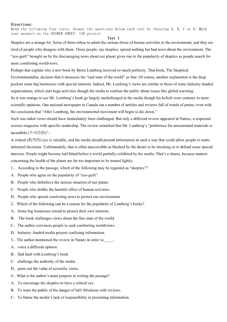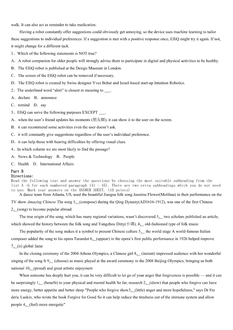 考研《英语一》福建省福州市台江区2023年预测试卷 SectionIUseofEnglish Directions: Readthefollowingtext.Choosethebestword(s)foreachnumberedblankandmarkA,B,CorDonthe ANSWERSHEET.(10points) Ioftenthoughtthatpolitenesswasoutoffashion.VeryrarelyhaveImetso1apersoninsuchabusyandnoisy2. Lately,Iwouldhavetochangemy3. Notlongago,whenIwenttoacoffeeplacewithtwoofmygrown-up4,I5suchahumanbeingfacetoface.The placewasfullof6asusualandwehadtoclimbsteep(陡峭)stairsinordertofindanemptytable.7enjoyingcoffeeand snacks,wewentdownthe8stairs,wheretherewashardlyanyspaceforanotherpersontoeitherclimbuporcomedown. JustasIwasinthe9ofthestairs,agentleman10themainentranceofthecaféwhichwasrightinfrontofthe staircase.IwassureIwouldbe11roughlybythismangoingup.IkeptcomingdownasfastasIcould.Mydaughterswere alreadydown.Theylookedupatme12,hopingIwouldreachthembeforethestrangerstartedwalkingupthestairs. Nearlyreachingthem,Inoticedthemanstillstandingnearthedoor.I13mydaughtersandpassedthestrangeratthe entrancedoorwhichhekeptholdingopen.Ilookedbackthinkinghewasstillatthedoor,14whethertogoinorfindanother less15place.Isawhimgoingupthestairs,twostepsatatime.Itoldmydaughtersaboutitandallthreeofusfelt16that wedidnoteven17thepolitegentlemanwhowasactuallyholdingthedooropenforus18topassthroughbeforegoingup. Suchwell-manneredpeopleare19tofindthesedays,whenpushingisvery20inouradvancedbutaggressive society.Weapplaudedforhisgentlemanspirit. 1、A.impoliteB.politeC.helpfulD.selfless 2、A.societyB.streetC.marketD.restaurant 3、A.positionB.impressionC.feelingD.opinion 4、A.neighborsB.friendsC.daughtersD.nieces 5、A.cameacrossB.wentthroughC.gotacrossD.passedby 6、A.customersB.guestsC.strangersD.children 7、A.WhenB.AsC.BeforeD.After 8、A.smoothB.narrowC.wideD.solid 9、A.beginningB.middleC.endD.front 10、A.leftB.passedC.enteredD.arrived 11、A.interruptedB.stoppedC.pushedD.pulled 12、A.excitedlyB.worriedlyC.delightedlyD.disappointedly 13、A.approachedB.desertedC.walkedD.signaled 14、A.doubtingB.whisperingC.expectingD.deciding 15、A.awkwardB.quietC.crowdedD.interesti