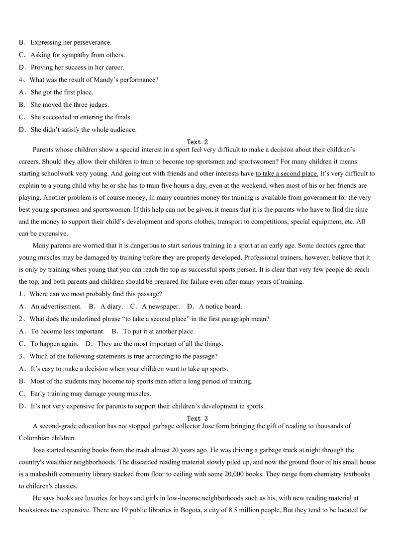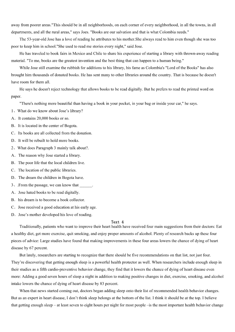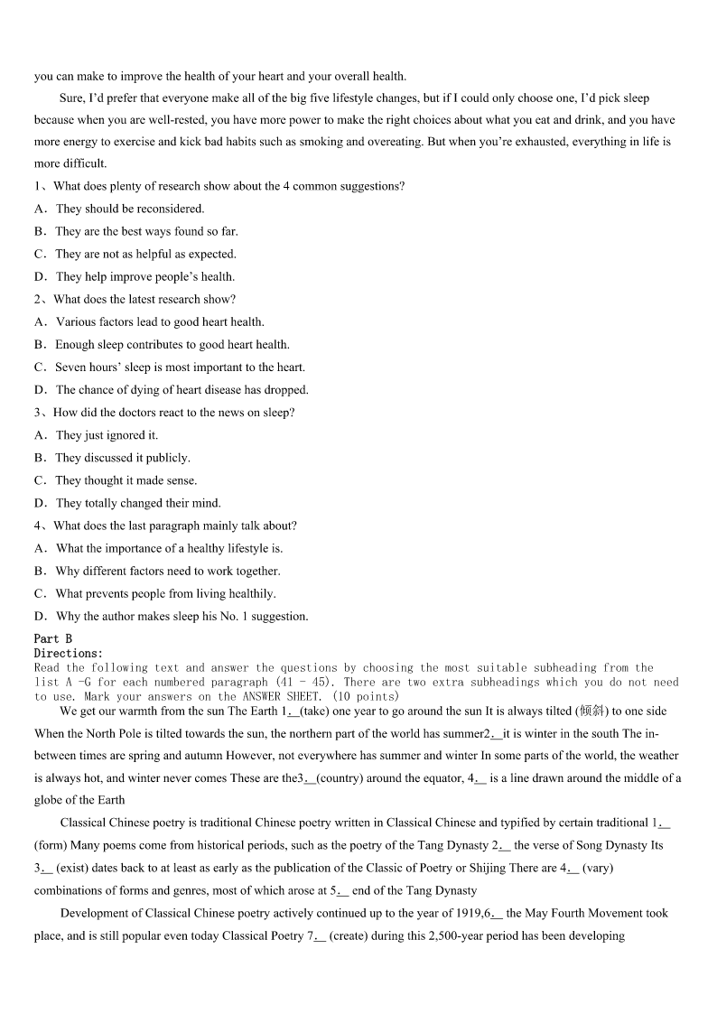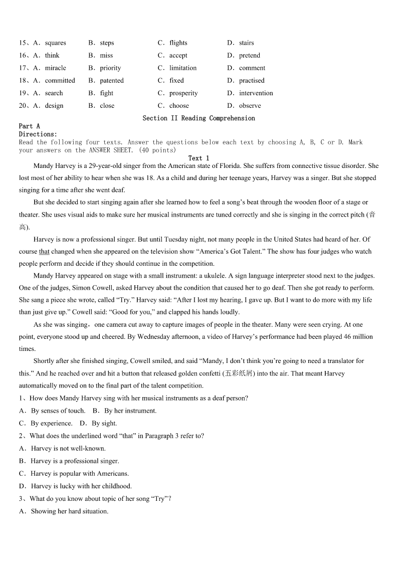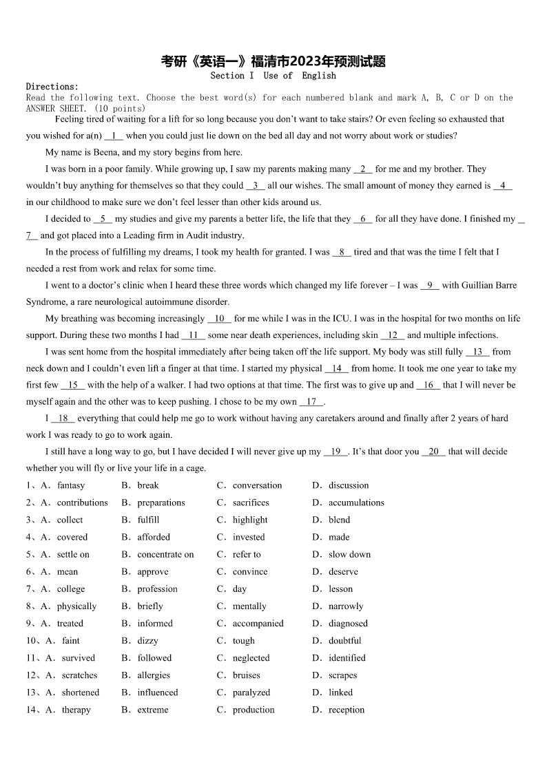 考研《英语一》福清市2023年预测试题 SectionIUseofEnglish Directions: Readthefollowingtext.Choosethebestword(s)foreachnumberedblankandmarkA,B,CorDonthe ANSWERSHEET.(10points) Feelingtiredofwaitingforaliftforsolongbecauseyoudon’twanttotakestairs?Orevenfeelingsoexhaustedthat youwishedfora(n)1whenyoucouldjustliedownonthebedalldayandnotworryaboutworkorstudies? MynameisBeena,andmystorybeginsfromhere. Iwasborninapoorfamily.Whilegrowingup,Isawmyparentsmakingmany2formeandmybrother.They wouldn’tbuyanythingforthemselvessothattheycould3allourwishes.Thesmallamountofmoneytheyearnedis4 inourchildhoodtomakesurewedon’tfeellesserthanotherkidsaroundus. Idecidedto5mystudiesandgivemyparentsabetterlife,thelifethatthey6foralltheyhavedone.Ifinishedmy 7andgotplacedintoaLeadingfirminAuditindustry. Intheprocessoffulfillingmydreams,Itookmyhealthforgranted.Iwas8tiredandthatwasthetimeIfeltthatI neededarestfromworkandrelaxforsometime. Iwenttoadoctor’sclinicwhenIheardthesethreewordswhichchangedmylifeforever–Iwas9withGuillianBarre Syndrome,arareneurologicalautoimmunedisorder. Mybreathingwasbecomingincreasingly10formewhileIwasintheICU.Iwasinthehospitalfortwomonthsonlife support.DuringthesetwomonthsIhad11someneardeathexperiences,includingskin12andmultipleinfections. Iwassenthomefromthehospitalimmediatelyafterbeingtakenoffthelifesupport.Mybodywasstillfully13from neckdownandIcouldn’tevenliftafingeratthattime.Istartedmyphysical14fromhome.Ittookmeoneyeartotakemy firstfew15withthehelpofawalker.Ihadtwooptionsatthattime.Thefirstwastogiveupand16thatIwillneverbe myselfagainandtheotherwastokeeppushing.Ichosetobemyown17. I18everythingthatcouldhelpmegotoworkwithouthavinganycaretakersaroundandfinallyafter2yearsofhard workIwasreadytogotoworkagain. Istillhavealongwaytogo,butIhavedecidedIwillnevergiveupmy19.It’sthatdooryou20thatwilldecide whetheryouwillflyorliveyourlifeinacage. 1、A.fantasyB.breakC.conversationD.discussion 2、A.contributionsB.preparationsC.sacrificesD.accumulations 3、A.collectB.fulfillC.highlightD.blend 4、A.coveredB.