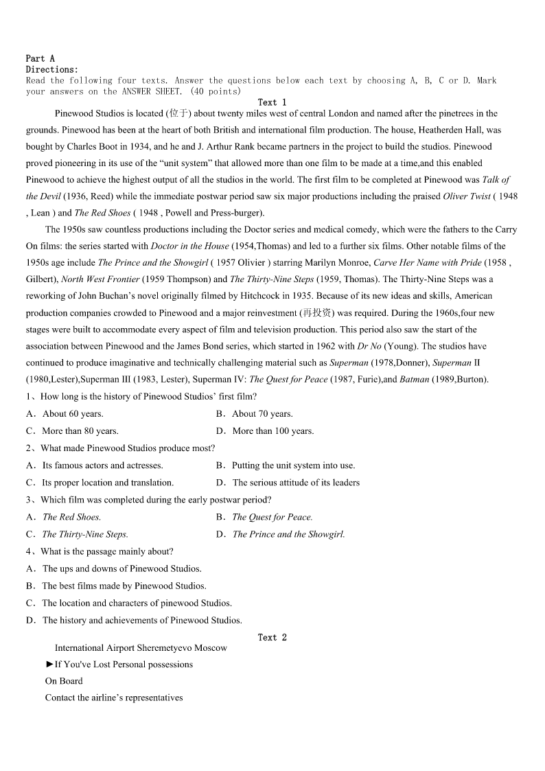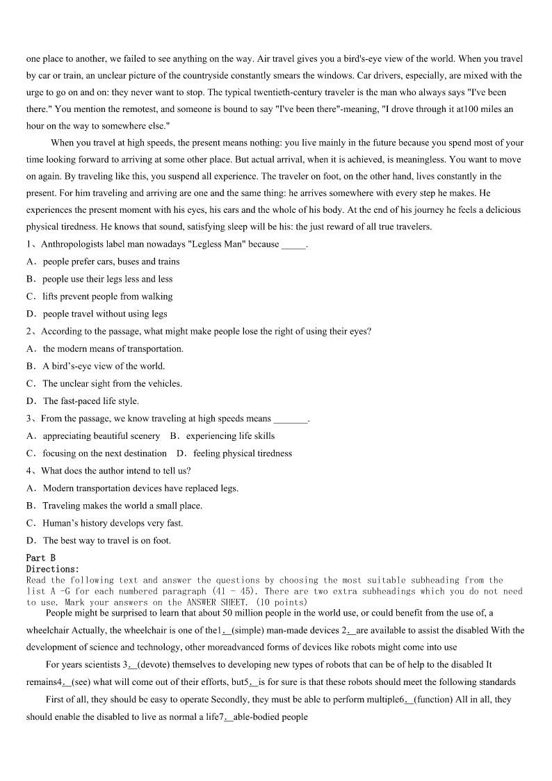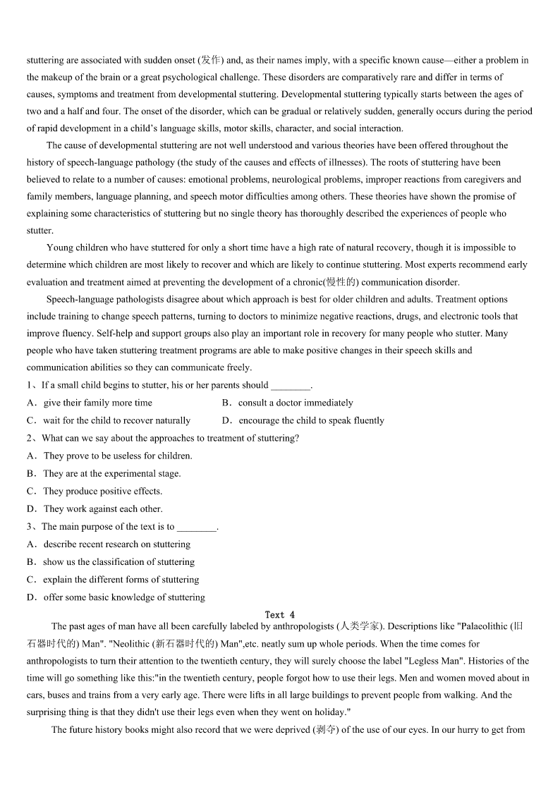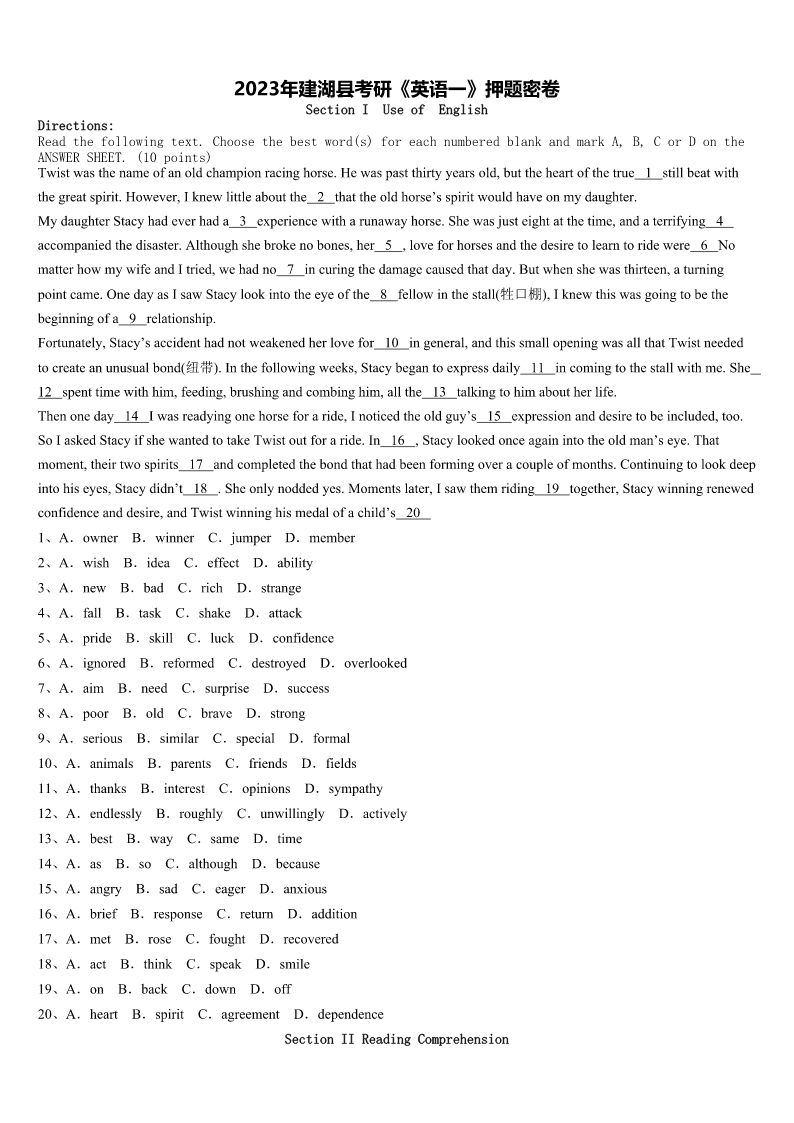 2023年建湖县考研《英语一》押题密卷 SectionIUseofEnglish Directions: Readthefollowingtext.Choosethebestword(s)foreachnumberedblankandmarkA,B,CorDonthe ANSWERSHEET.(10points) Twistwasthenameofanoldchampionracinghorse.Hewaspastthirtyyearsold,buttheheartofthetrue1stillbeatwith thegreatspirit.However,Iknewlittleaboutthe2thattheoldhorse’sspiritwouldhaveonmydaughter. MydaughterStacyhadeverhada3experiencewitharunawayhorse.Shewasjusteightatthetime,andaterrifying4 accompaniedthedisaster.Althoughshebrokenobones,her5,loveforhorsesandthedesiretolearntoridewere6No matterhowmywifeandItried,wehadno7incuringthedamagecausedthatday.Butwhenshewasthirteen,aturning pointcame.OnedayasIsawStacylookintotheeyeofthe8fellowinthestall(牲口棚),Iknewthiswasgoingtobethe beginningofa9relationship. Fortunately,Stacy’saccidenthadnotweakenedherlovefor10ingeneral,andthissmallopeningwasallthatTwistneeded tocreateanunusualbond(纽带).Inthefollowingweeks,Stacybegantoexpressdaily11incomingtothestallwithme.She 12spenttimewithhim,feeding,brushingandcombinghim,allthe13talkingtohimaboutherlife. Thenoneday14Iwasreadyingonehorseforaride,Inoticedtheoldguy’s15expressionanddesiretobeincluded,too. SoIaskedStacyifshewantedtotakeTwistoutforaride.In16,Stacylookedonceagainintotheoldman’seye.That moment,theirtwospirits17andcompletedthebondthathadbeenformingoveracoupleofmonths.Continuingtolookdeep intohiseyes,Stacydidn’t18.Sheonlynoddedyes.Momentslater,Isawthemriding19together,Stacywinningrenewed confidenceanddesire,andTwistwinninghismedalofachild’s20 1、A.ownerB.winnerC.jumperD.member 2、A.wishB.ideaC.effectD.ability 3、A.newB.badC.richD.strange 4、A.fallB.taskC.shakeD.attack 5、A.prideB.skillC.luckD.confidence 6、A.ignoredB.reformedC.destroyedD.overlooked 7、A.aimB.needC.surpriseD.success 8、A.poorB.oldC.braveD.strong 9、A.seriousB.similarC.specialD.formal 10、A.animalsB.parentsC.friendsD.fields 11、A.thanksB.interestC.opinionsD.sympathy 12、A.endlesslyB.roughlyC.unwillinglyD.actively 13、A.bestB.wayC.sameD.time 14、A.asB.soC.althoughD.because 15、A.angry