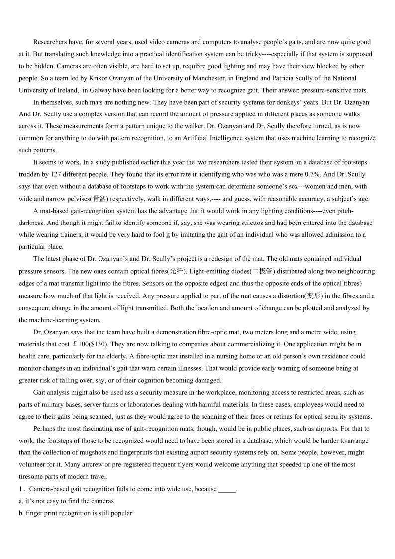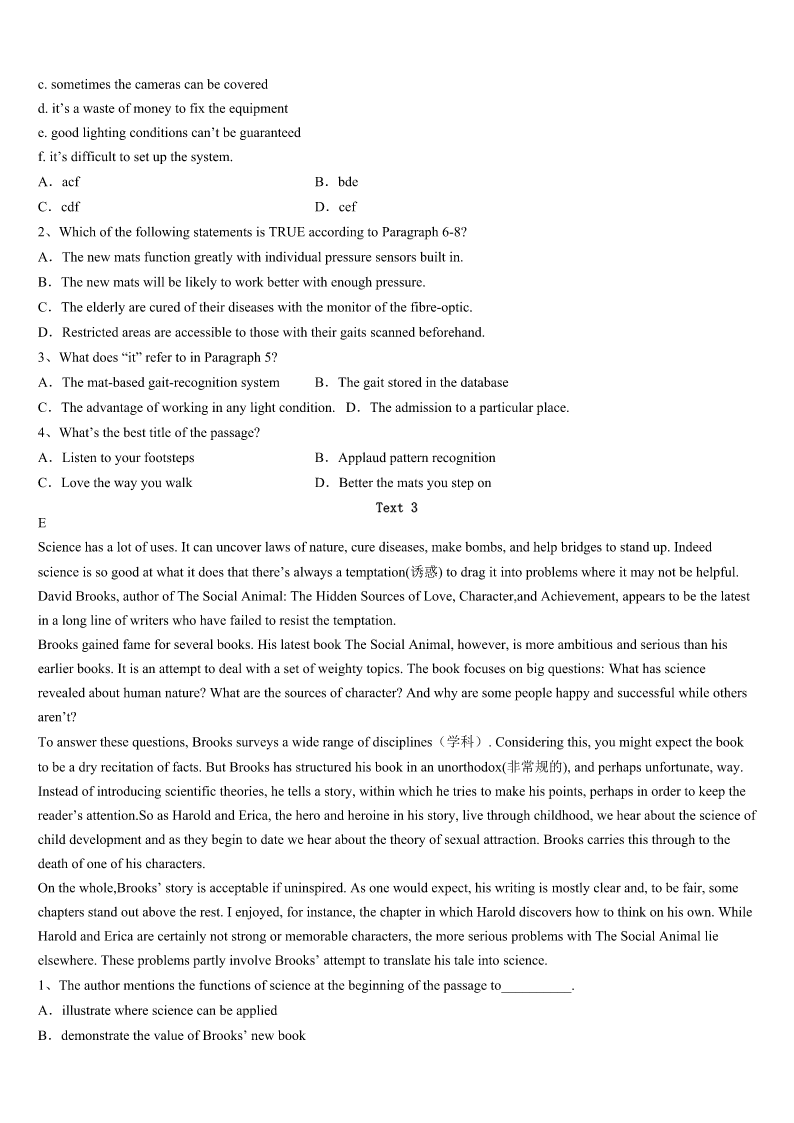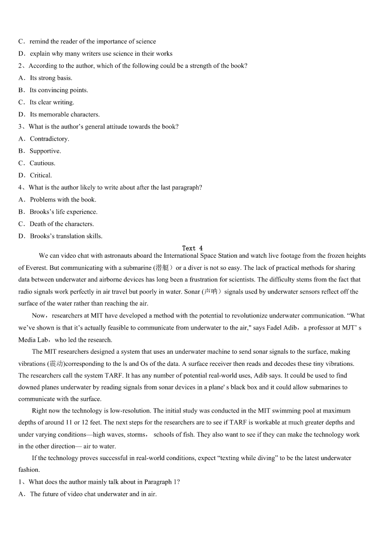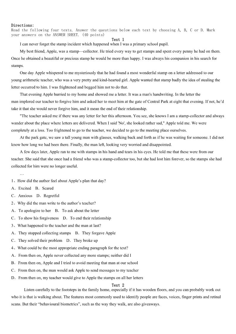 考研《英语一》罗江县2023年点睛提分卷 SectionIUseofEnglish Directions: Readthefollowingtext.Choosethebestword(s)foreachnumberedblankandmarkA,B,CorDonthe ANSWERSHEET.(10points) WhenIwaswalkingthroughtheforest,Iheardsomeoneweeping.I1thesoundofthesoftcryuntilIsawawoman sittingonthesnow.Hereyeswerefilledwithtearsforherheavy2duetohardlife.Isatonthecoldsnowwithherand3 hermyshoulderandmyears. “Whatisyourname?”,sheasked.Ismiledather.4,mynameisJane,buttocomforther,Isaid,“Myfirstnameis5 ,mymiddlenameisHopeandmylastnameisCompassion(同情).”Isawa6smilecomeuponherfaceasIaskedher “whatisyourname?”“MynameisAnn7Ihadgivenuphope.”IreadherapoemthroughwhichI8themessageofself- worthtoher.Otherswill9uswhenweloveourselves.10,itwasimportantforonetohaveself-worth.AfterIsharedthe poem,wetalkedawhileandthenIpickedawildrosethatwasinthesnow.Itwas11thattherewasawildroseinsuch weather.Iplacedtheroseinherhandandabig12appearedonherface.ThenIfeltkindof13atherchangeandhanded herapieceofpaperwithmy14onit.Iwalkedaway.Shecalledmecheerfullythenextdayandexpressedher15tome. ShetoldmeItruly16myname.Obviously,shehadfoundherfaith,herhopeandhercompassion. WeallneedsomeoneinlifetosayIbelieveinyou.17isasrareasaroseinthesnow.Whenyou18it,don’tletit everdie.Lifeistoo19tothankallthepeoplewhohaveencouragedus.Weshouldreceiveandgiveencouragementrather thanletunimportantthingsstand20ourway. 1、A.heardB.followedC.reflectedD.enjoyed 2、A.heartB.headC.bodyD.waist 3、A.sharedB.broughtC.fetchedD.offered 4、A.EventuallyB.DeliberatelyC.ActuallyD.Specially 5、A.CareerB.InspirationC.MotivationD.Faith 6、A.puzzledB.forcedC.tiredD.worried 7、A.butB.soC.becauseD.or 8、A.transformedB.leftC.conveyedD.took 9、A.tolerateB.serveC.hateD.treasure 10、A.ThereforeB.HoweverC.OtherwiseD.Moreover 11、A.usualB.rareC.frightfulD.admirable 12、A.worryB.satisfactionC.smileD.shock 13、A.interestB.securityC.disappointmentD.relief 14、A.nameB.numberC.addressD.photo 15、A.regretB.apologyC.gratitudeD.concern 16、A.liveduptoB.lookeduptoC.cameuptoD.madeupfor 17、A.PleasureB.FriendshipC.Passi