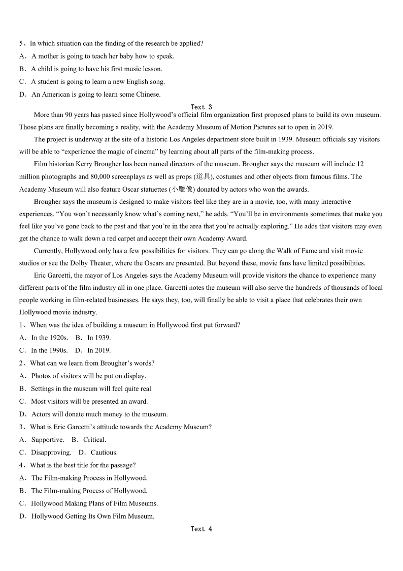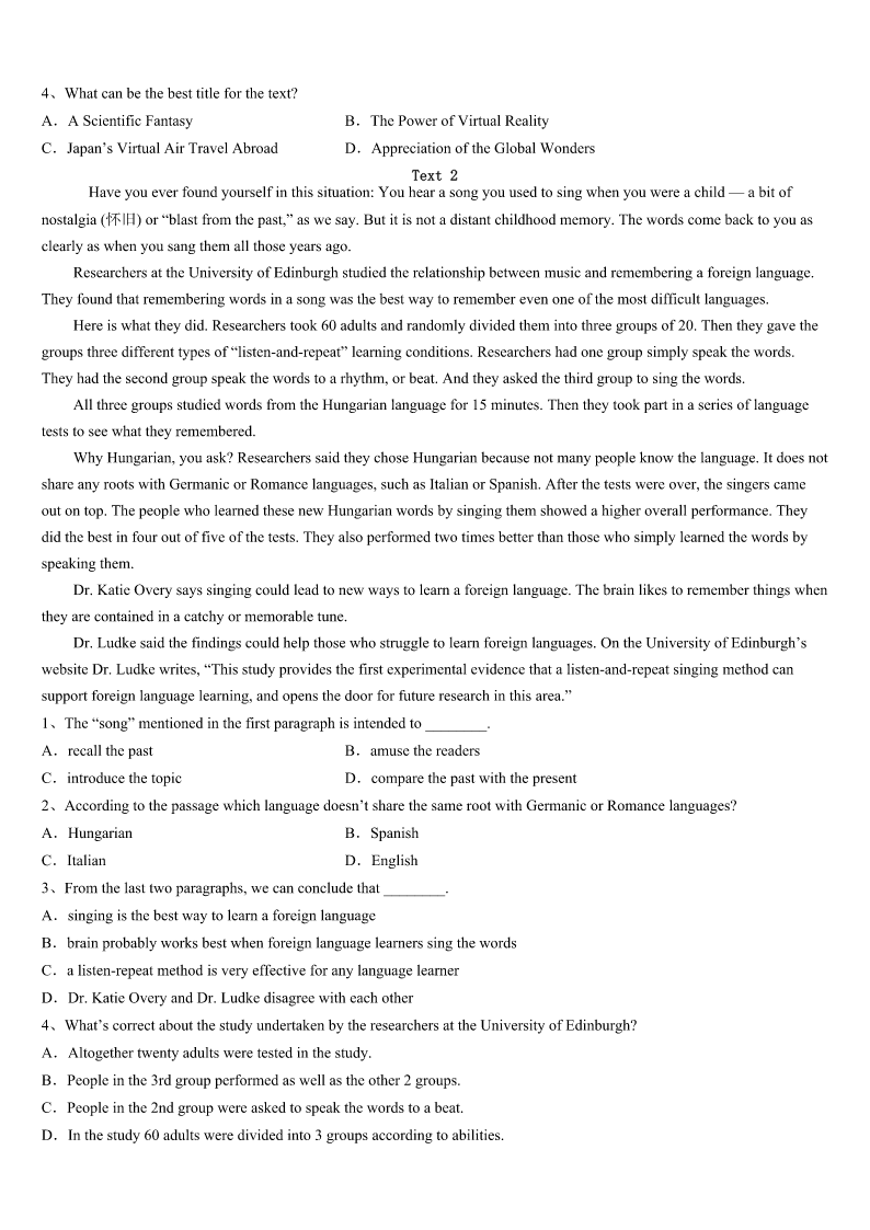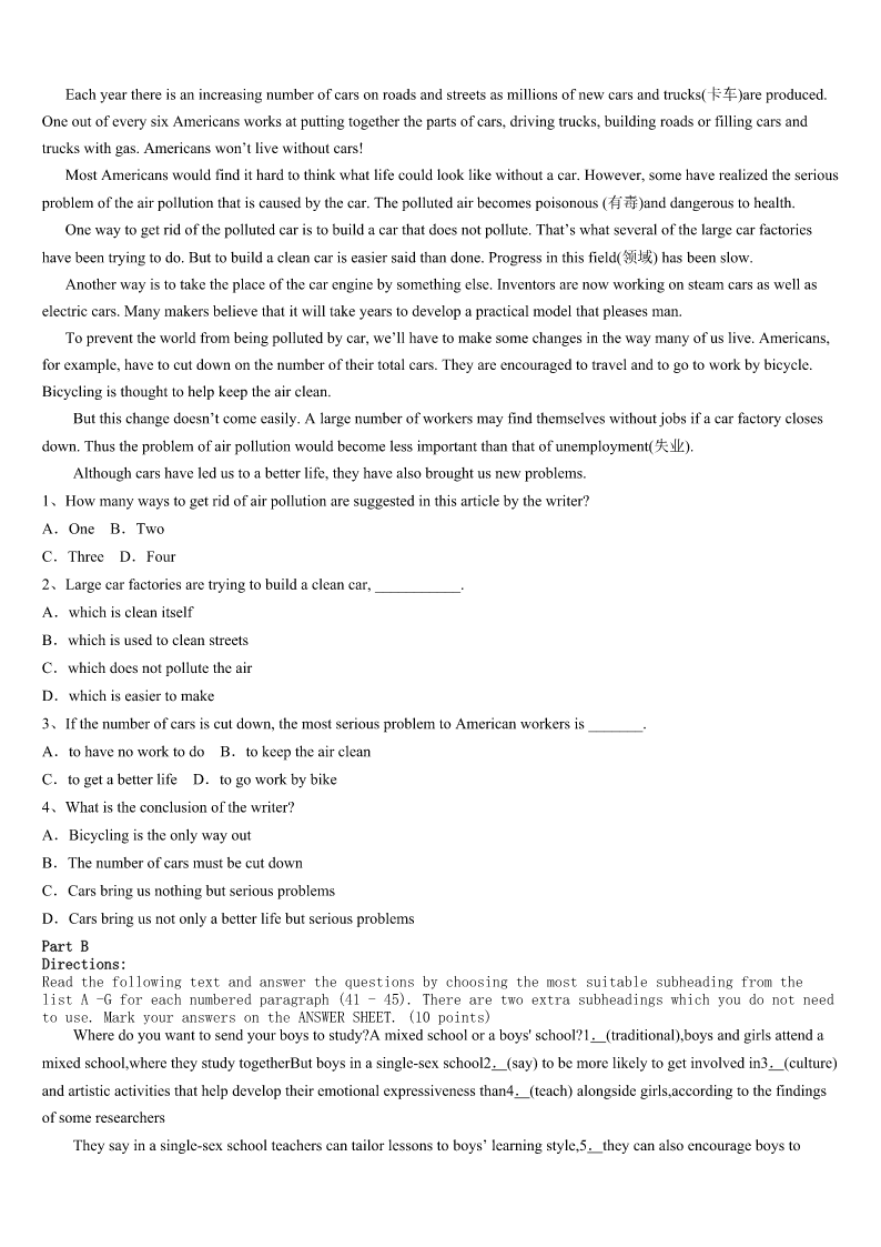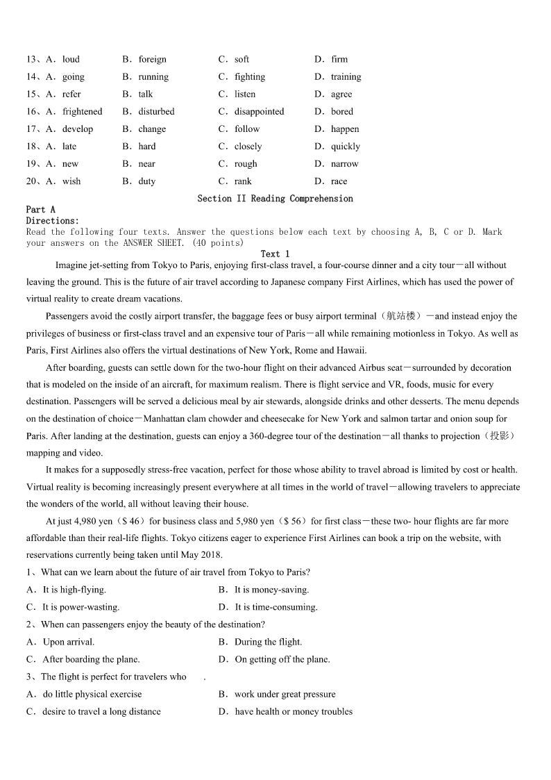 考研《英语一》绵阳市游仙区2023年统考试题 SectionIUseofEnglish Directions: Readthefollowingtext.Choosethebestword(s)foreachnumberedblankandmarkA,B,CorDonthe ANSWERSHEET.(10points) RunningforaDream IwillneverforgetthatNovemberday.Itwashotterthannormal.Thiswasthe1myfatherandIhadwaitedsolong for,becausewehadbeenworkingtowardsthisraceforthreeyears.Dozensoffamiliarfacesfromchurchandschoolflashed acrossmyview.Theyhadcome2me.Isawworryand3onmyfather'sface.Thentheracebegan! Forthefirsttwoandahalfmiles.Ifelt4.Ihadneverbeforebeensoreadyforsomething.Theweeksleadingupto theracewerefilledwithcontrolled5andastrictdiet.Myfriendshadn'tseenmeinweeks,buttheyunderstoodthe6 requiredtomakemydreamareality.Asinallofmyraces,Ididn't7outinthefront,Ilovedthepleasureofpassing peopleasmystrengthovertooktheirprematurespeed. Thenwithoutwarning,mystrengthbegantodecrease.Neckandneckwithoneofmygreatestcompetitors,I8see thefinishline.Ihadbegunthefinaldashinto9whenmykneesbecameweakandmylegsgaveway.NothingIcoulddo wouldmakethem10weight. Iwatchedasrunnersrushedbyme.11Iknewmydreamsofvictoryweredestroyed.Ihadtofinishthe race.However,mylegshurtbadly.Withallofthe12leftinme,Igotonmyhandsandkneesandcrawled(爬), inchbyinch,acrossthefinishline.Voices,both13andfamiliar,cheeredmeon.Theygavemethecouragetokeep 14untiltheveryend. Thedoctorswerethereinseconds,butmyeyessearchedthecrowdforhim.TherewasonlyonepersonIwantedto15 to.Iwhispered,"I'msosorry,Dad,I'msosorryI16you."Helookedatme,saying,"Youcouldneverdisappoint me.Sometimesthesethingsjust17.Allthatmattersisthatyoudidyourbest." "Butweworkedso18.Whataboutourdream?"Hereachedoverformyhandandsaid,"Don'tyouknowthatyou aremydreamandithascometrue?" Itwasn'tlongbeforemyrunningshoeswerebackon,markinga19pathformyjourney,Ilearnedthatallofthe miles,thetears,thesweat,andthepainmydadandIexperiencedtogetherwerenotfora20.WhatI realized,though,wasthattohim,Iwasthegreatestprizehehadeverwon. 1、A.dreamB.weatherC.resultD.day 2、A.forB.toC.acrossD.over 3、A.coldnessB.astonishmentC.excitementD.amusement 4、A.pr