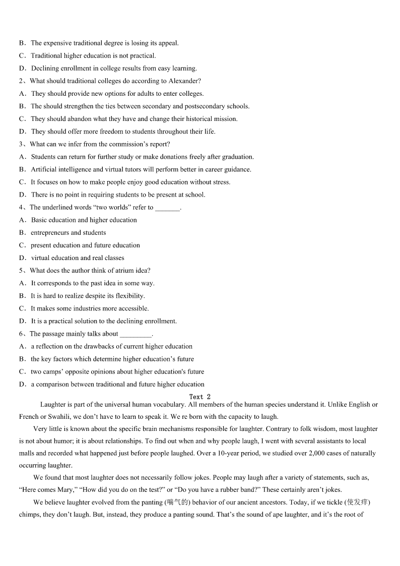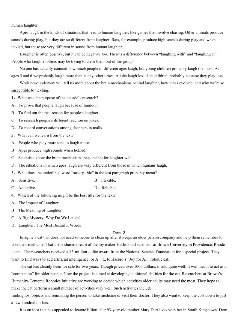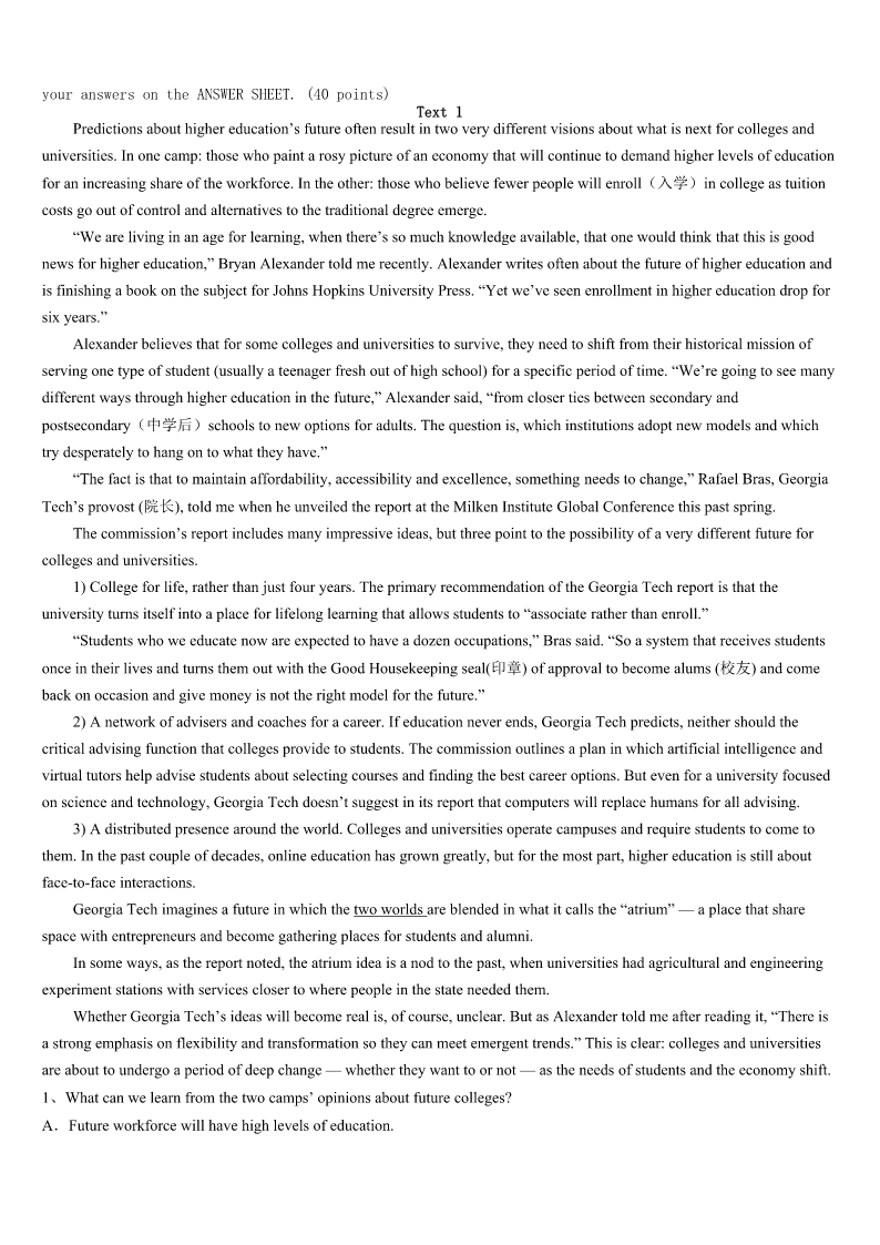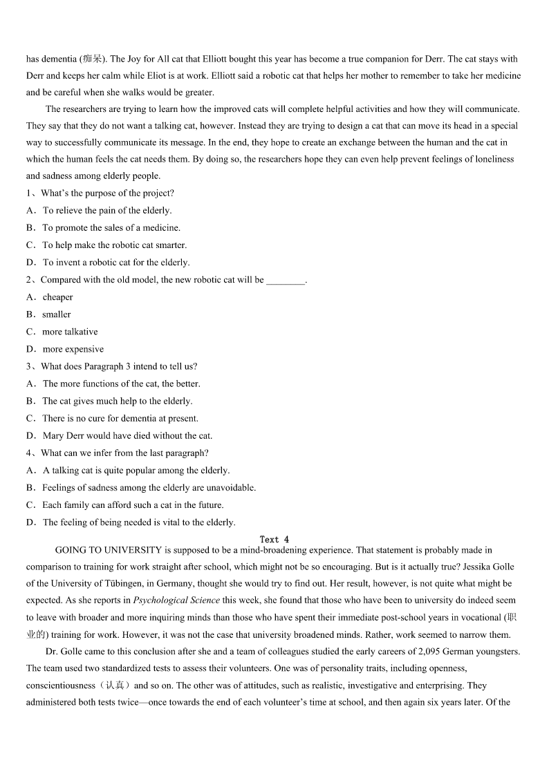 考研《英语一》泰州市靖江市2023年巅峰冲刺试卷 SectionIUseofEnglish Directions: Readthefollowingtext.Choosethebestword(s)foreachnumberedblankandmarkA,B,CorDonthe ANSWERSHEET.(10points) Onedoctorisbeingrecognizedasthebestdoctor.Heevertookthetimeto1ayoungpatient'sbrokentoy. Thelittleboy,Ryan,hasseveralhealth2.The9-year-oldhashadeightoperationsinhislife,sowhenhewentto Children'sHospitalfor3inearlyNovember,hebroughtalonghisfavoritetoyfor4. Hisdoctor,Groth,noticedtheone-eyedtoywasalittleshabbyanddecidedto5bysewingitbackup,justlikehe6 Ryan.“Youmightthinkthisishisfourthorfifthone,”Grothsaid.“Heisextremely7thistoy.”WhenRyanwokeupfromhis operationtofindhis8recoveringbyhisside,hewasvery9."Withthislittleguy,Ithinkitmadeabig10,"Groth said.“Froma11aspectithelpsalotandit12him.” The44-year-olddoctorhasseenmanykidscomeinwith13toysandhasmadeita14tosewthemupwheneverhe can.Thiswasthefirsttime,15,thatsomeonecaughthimintheact.Hedidn'tknowthe16wasbeingtaken,butsinceitwas 17tothewebsite,it'sbeenlikedover13000times,18theattentionoflocalandnationalmedia. Thedoctorhasaprettygoodtheoryaboutwhyhissmall19hasgottensomuchattentiononline.“Peoplejust20to seesympathyforothers.Itresonates(引起共鸣).” Thatitdoesdoctor,thatitdoes. 1、A.putawayB.sewupC.playwithD.washup 2、A.careB.educationC.problemsD.benefits 3、A.operationB.adviceC.trainingD.complaint 4、A.treatmentB.repairC.donationD.comfort 5、A.operateB.helpC.exchangeD.foster 6、A.worriedaboutB.calledforC.didwithD.pickedup 7、A.attachedB.devotedC.limitedD.attracted 8、A.injuryB.parentsC.doctorD.toy 9、A.painfulB.excitedC.energeticD.pessimistic 10、A.effortB.smileC.differenceD.noise 11、A.commercialB.moralC.financeD.recovery 12、A.relaxesB.approachesC.servesD.reminds 13、A.carefully-chosenB.well-wornC.newly-designedD.brand-new 14、A.careerB.viewC.homeD.practice 15、A.thereforeB.besidesC.howeverD.instead 16、A.photoB.toyC.measureD.seat 17、A.deliveredB.postedC.appliedD.fastened 18、A.requiringB.switchingC.avoidingD.catching 19、A.changeB.progressC.gestureD.misfortune 20、A.likeB.failC.tryD.manage