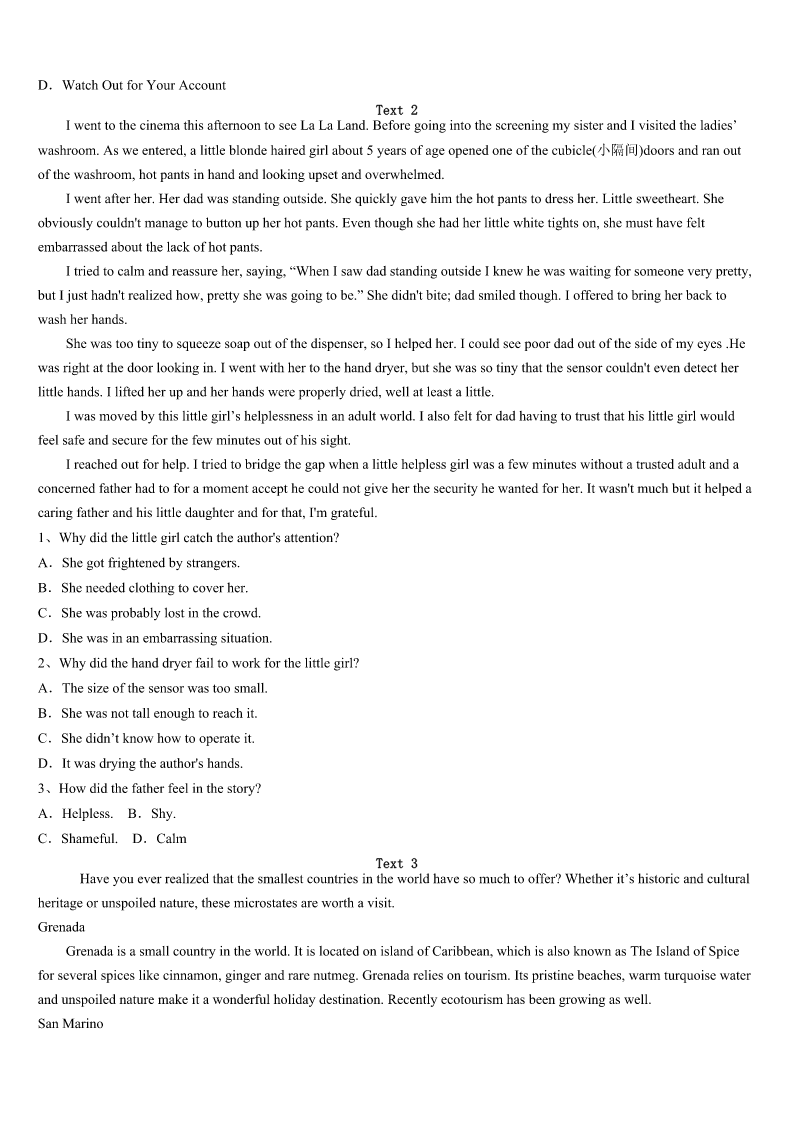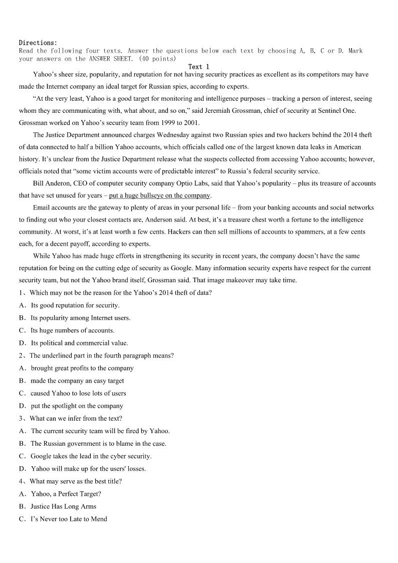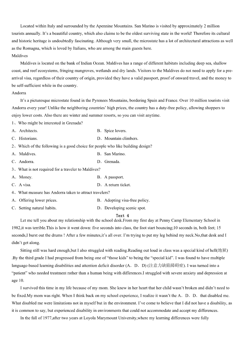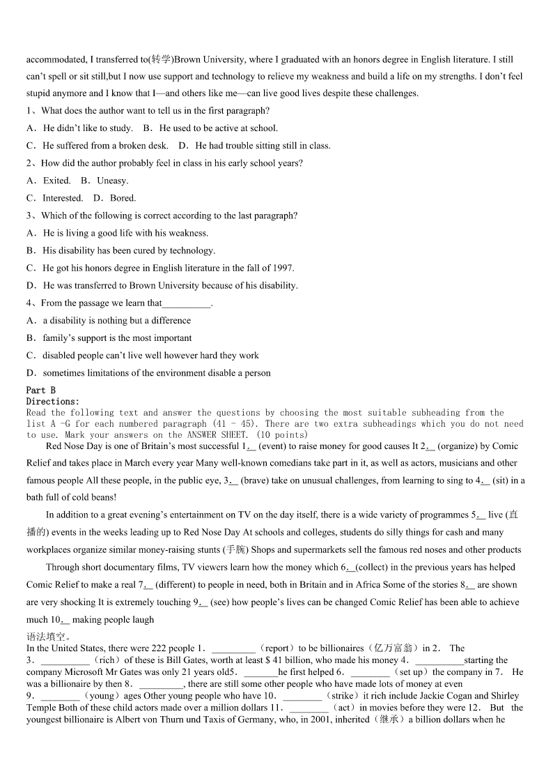 考研《英语一》荥经县2023年押题密卷 SectionIUseofEnglish Directions: Readthefollowingtext.Choosethebestword(s)foreachnumberedblankandmarkA,B,CorDonthe ANSWERSHEET.(10points) Goodafternoon,everyone, I’dliketointroducemyfriendChristytoyouall.Christyisagreatexampleofhowonepersonwith1canmakeherdreama reality,sosheshouldwintheStudentoftheYearAward. Christylovestoridebikes.Shedoesnotjustridealongcitystreets,2Sheisinterestedin3trail(小路)rides.4Christy knewthatpeoplewholoveridinghadtotravel5thecitytolocategoodbiketrails,soshe6todosomething. ChristyknewthatRooseveltParkhadaclean,livelycreek(小溪)7throughit.12milesoflandaroundthecreekwas8 used.Christydecidedtogettogetherwithothertrail9toaskthecitycouncilto10abikepathalongtheunusedland. Christy11apetition(请愿书).Sheandotherridersaskedalloftheirbikingfriendsiftheywould12thelist,andthey gathered300signatures.Thecitycouncilevaluatedthe13and,more14,agreedtoallowthebiketrail. The15tooktwomonthsofwork,andnowRooseveltParkhasa16biketrail.Ithasmanyupsanddowns;itisagreatride. Thistrailisbecomingoneofthecommunity’simportant17spots.Ican’t18withChristywhenweridetogether,butIam gladthatshedecidedtoworkhardtobeginthe19oftheRooseveltParkbikepath.Christy20thisawardbecausesheacted onherdream,causingacommunitytocometogether. Thankyou! 1、A.patienceB.satisfactionC.determinationD.permission 2、A.stillB.insteadC.eitherD.though 3、A.toughB.vacantC.convenientD.remote 4、A.HoweverB.AsC.ButD.Since 5、A.aroundB.beyondC.alongD.outside 6、A.expectedB.decidedC.offeredD.claimed 7、A.runningB.goingC.comingD.walking 8、A.oftenB.everC.seldomD.even 9、A.runnersB.playersC.passengersD.riders 10、A.approveB.applyC.proveD.accuse 11、A.formedB.developedC.drewD.described 12、A.writeB.viewC.callD.sign 13、A.demandB.requestC.invitationD.scheme 14、A.importantlyB.naturallyC.obviouslyD.necessarily 15、A.destructionB.organizationC.constructionD.protection 16、A.interestingB.competingC.parkingD.rewarding 17、A.matchB.exerciseC.playD.game 18、A.putupB.keepupC.endupD.turnup 19、A.discoveryB.inventionC.creationD.co
