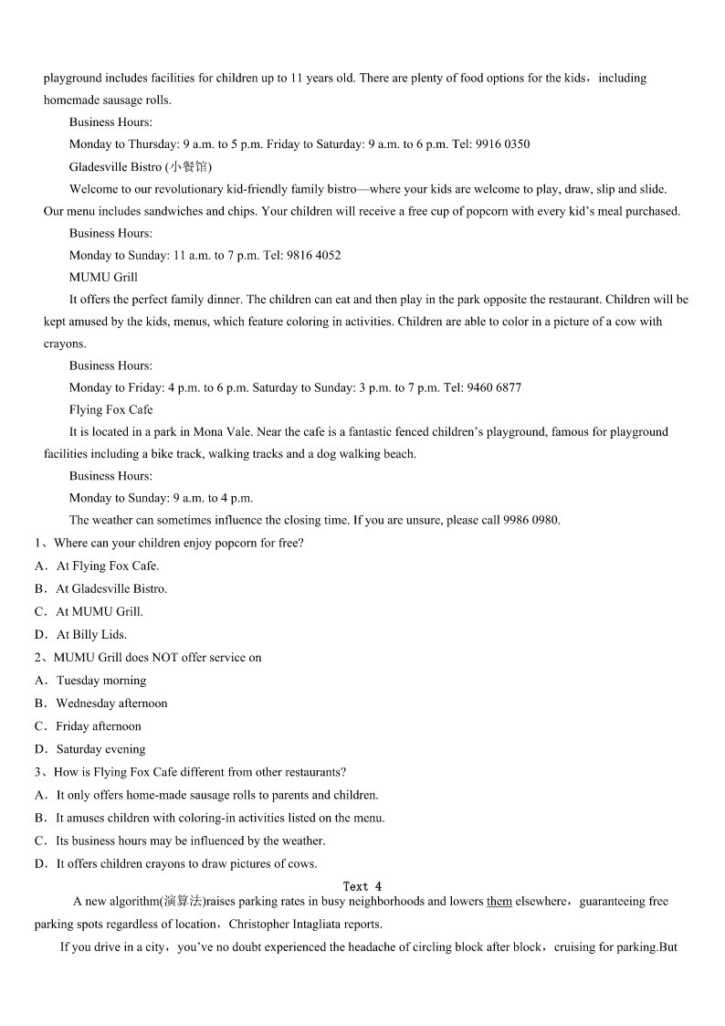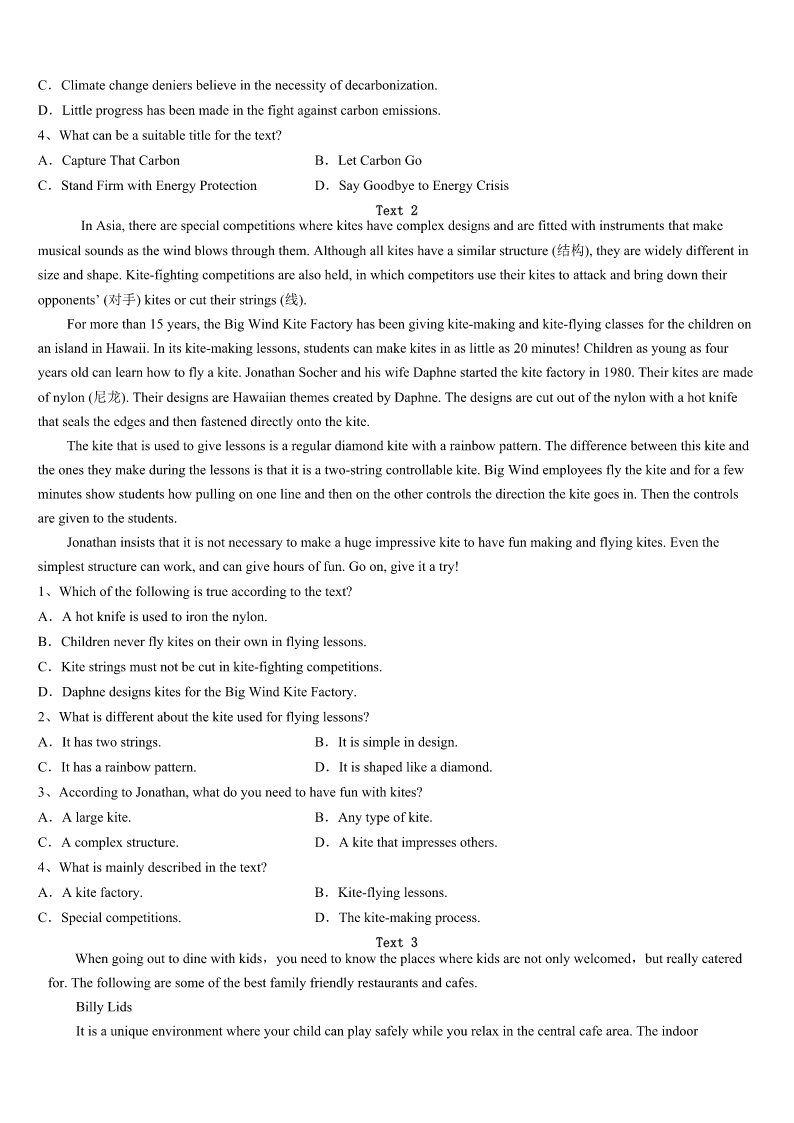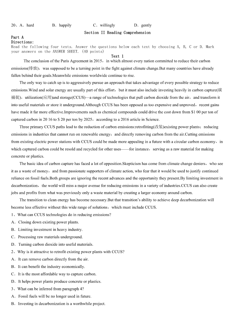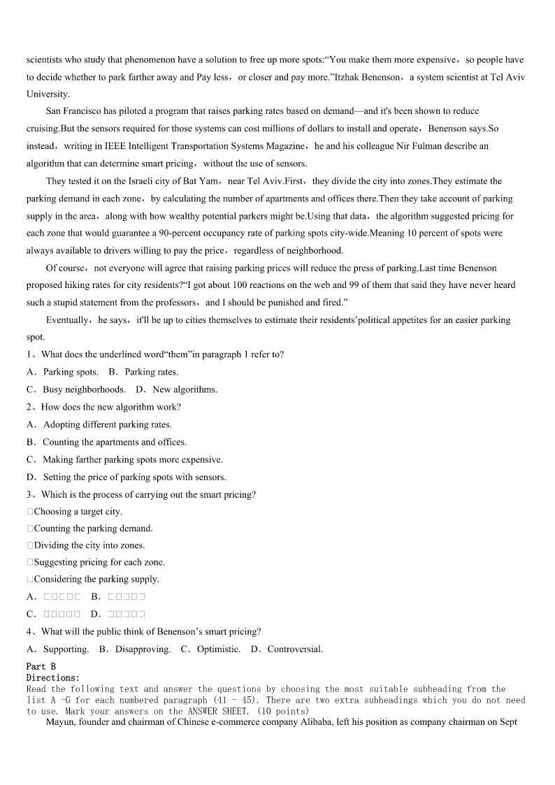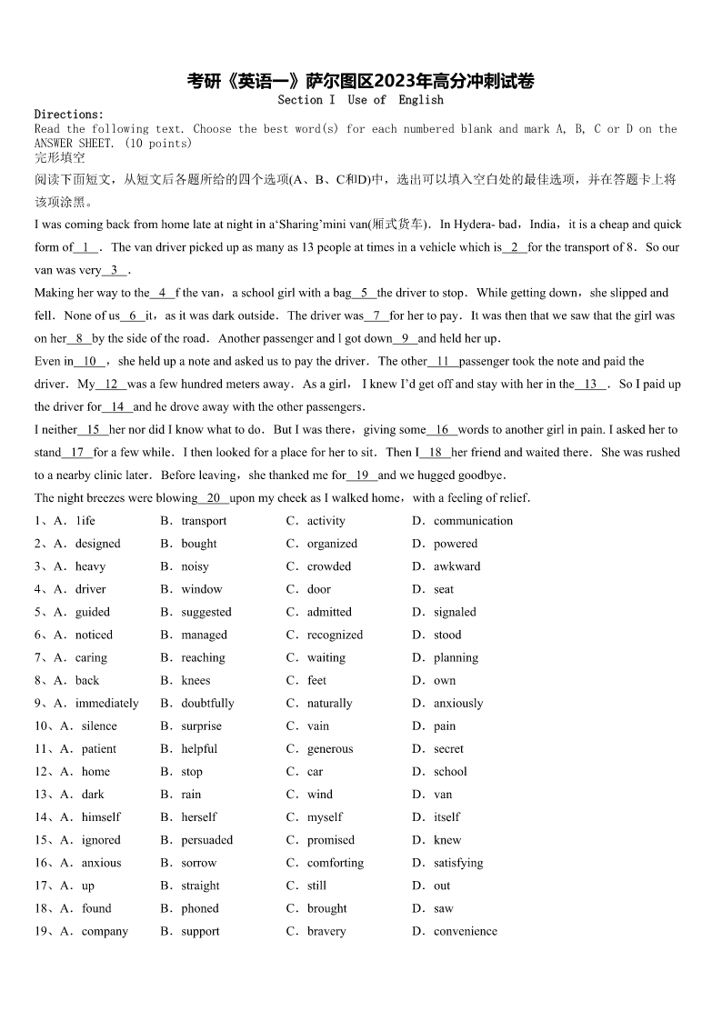 考研《英语一》萨尔图区2023年高分冲刺试卷 SectionIUseofEnglish Directions: Readthefollowingtext.Choosethebestword(s)foreachnumberedblankandmarkA,B,CorDonthe ANSWERSHEET.(10points) 完形填空 阅读下面短文,从短文后各题所给的四个选项(A、B、C和D)中,选出可以填入空白处的最佳选项,并在答题卡上将 该项涂黑。 Iwascomingbackfromhomelateatnightina‘Sharing’minivan(厢式货车).InHydera-bad,India,itisacheapandquick formof1.Thevandriverpickedupasmanyas13peopleattimesinavehiclewhichis2forthetransportof8.Soour vanwasvery3. Makingherwaytothe4fthevan,aschoolgirlwithabag5thedrivertostop.Whilegettingdown,sheslippedand fell.Noneofus6it,asitwasdarkoutside.Thedriverwas7forhertopay.Itwasthenthatwesawthatthegirlwas onher8bythesideoftheroad.Anotherpassengerandlgotdown9andheldherup. Evenin10,sheheldupanoteandaskedustopaythedriver.Theother11passengertookthenoteandpaidthe driver.My12wasafewhundredmetersaway.Asagirl,IknewI’dgetoffandstaywithherinthe13.SoIpaidup thedriverfor14andhedroveawaywiththeotherpassengers. Ineither15hernordidIknowwhattodo.ButIwasthere,givingsome16wordstoanothergirlinpain.Iaskedherto stand17forafewwhile.Ithenlookedforaplaceforhertosit.ThenI18herfriendandwaitedthere.Shewasrushed toanearbycliniclater.Beforeleaving,shethankedmefor19andwehuggedgoodbye. Thenightbreezeswereblowing20uponmycheekasIwalkedhome,withafeelingofrelief. 1、A.1ifeB.transportC.activityD.communication 2、A.designedB.boughtC.organizedD.powered 3、A.heavyB.noisyC.crowdedD.awkward 4、A.driverB.windowC.doorD.seat 5、A.guidedB.suggestedC.admittedD.signaled 6、A.noticedB.managedC.recognizedD.stood 7、A.caringB.reachingC.waitingD.planning 8、A.backB.kneesC.feetD.own 9、A.immediatelyB.doubtfullyC.naturallyD.anxiously 10、A.silenceB.surpriseC.vainD.pain 11、A.patientB.helpfulC.generousD.secret 12、A.homeB.stopC.carD.school 13、A.darkB.rainC.windD.van 14、A.himselfB.herselfC.myselfD.itself 15、A.ignoredB.persuadedC.promisedD.knew 16、A.anxiousB.sorrowC.comfortingD.satisfying 17、A.upB.straightC.stillD.out 18、A.foundB.phonedC.broughtD.saw 19、A.companyB.supportC.braveryD.convenience 20、A.hardB.happilyC.willinglyD.gen