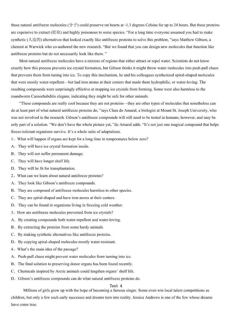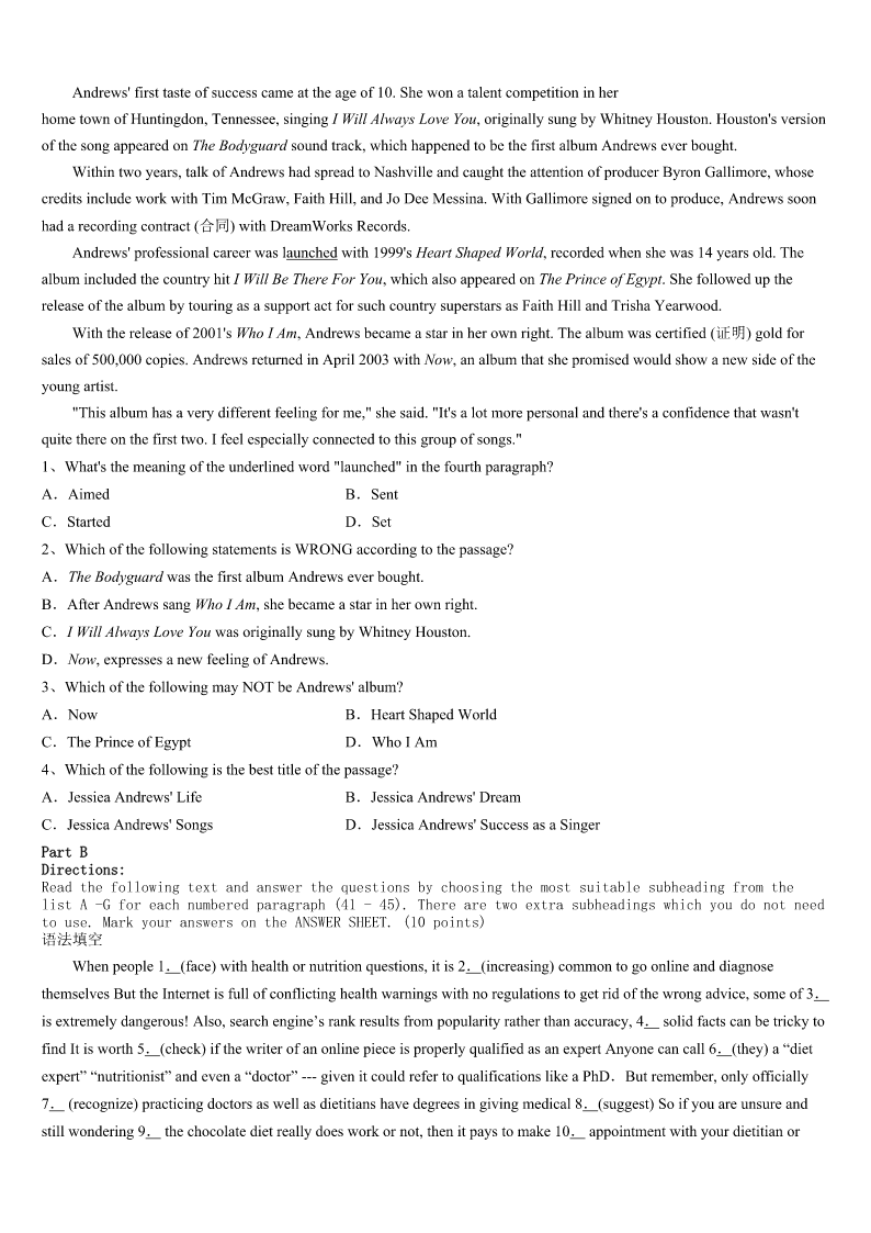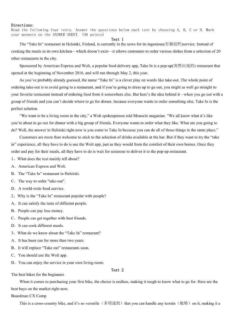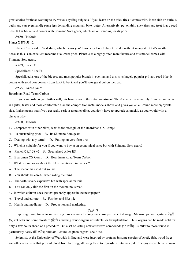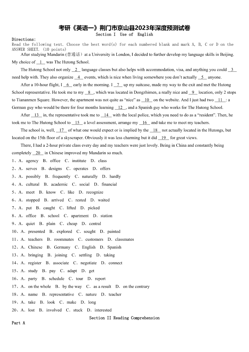 考研《英语一》荆门市京山县2023年深度预测试卷 SectionIUseofEnglish Directions: Readthefollowingtext.Choosethebestword(s)foreachnumberedblankandmarkA,B,CorDonthe ANSWERSHEET.(10points) AfterstudyingMandarin(普通话)ataUniversityinLondon,IdecidedtofurtherdevelopmylanguageskillsinBeijing. Mychoiceof1wasTheHutongSchool. TheHutongSchoolnotonly2languageclassesbutalsohelpswithaccommodation,visa,andanythingyoucould3 needhelpwith.Theyalsoorganize4events,whichisnicewhenlivingsomewhereyoudon’tactually5anyone. Aftera10-hourflight,I6earlyinthemorning.I7upmysuitcase,mademywaytotheexitandmettheHutong Schoolrepresentative.Hetookmetomy8,whichwaslocatedinDongzhimen,areallyniceand9location,only2stops toTiananmenSquare.However,theapartmentwasnotquiteas“nice”as10onthewebsite.AndIjusthadtwo11:a Germanguywhowouldbethereforfourmonthslearning12,andaSpanishguywhoworksforTheHutongSchool. After13in,therepresentativetookmeto14withthelocalpolice,whichyouneedtodoasa“resident”.Then,he tookmetoTheHutongSchoolto15alevelassessment,arrangemy16andtakemetomeetmyteachers. Theschoolis,well,17ofwhatonewouldexpectorisimpliedbythe18notactuallylocatedintheHutongs,but locatedonthe15thfloorofaskyscraper.Obviouslyitwaslesscharmingbutitdid19forgreatviews. There,Ihada2-hourprivateclasseverydayandmyteacherswerejustlovely.BeinginChinaandconstantlybeing completely20inChineseimprovedmyMandarinsomuch. 1、A.agencyB.officeC.instituteD.class 2、A.servesB.designsC.operatesD.offers 3、A.possiblyB.frequentlyC.naturallyD.hardly 4、A.culturalB.academicC.socialD.financial 5、A.meetB.knowC.likeD.recognize 6、A.stoppedB.arrivedC.restedD.waited 7、A.putB.caughtC.liftedD.picked 8、A.officeB.schoolC.apartmentD.station 9、A.quietB.plainC.cheapD.central 10、A.presentedB.exploredC.soughtD.painted 11、A.teachersB.roommatesC.customersD.classmates 12、A.ChineseB.GermanyC.EnglishD.Spanish 13、A.bringingB.joiningC.settlingD.taking 14、A.registerB.associateC.negotiateD.connect 15、A.studyB.payC.adaptD.get 16、A.partyB.scheduleC.tourD.report 17、A.onthewholeB.bythewayC.asaresultD.ont