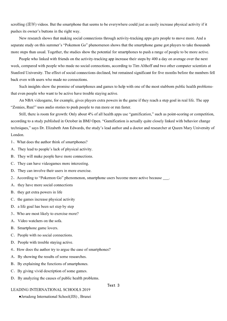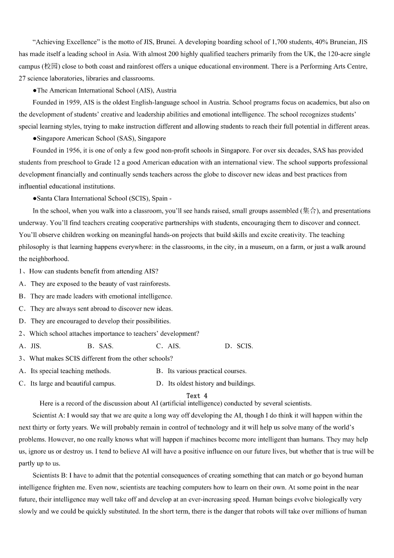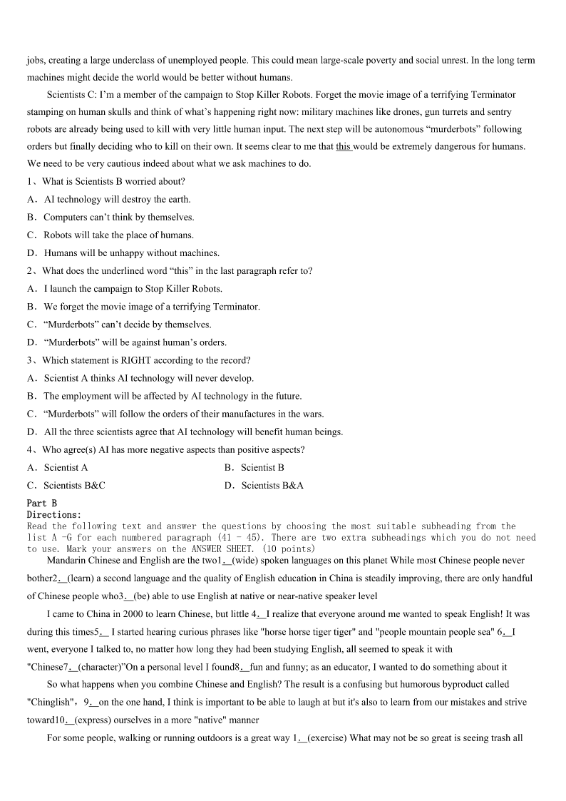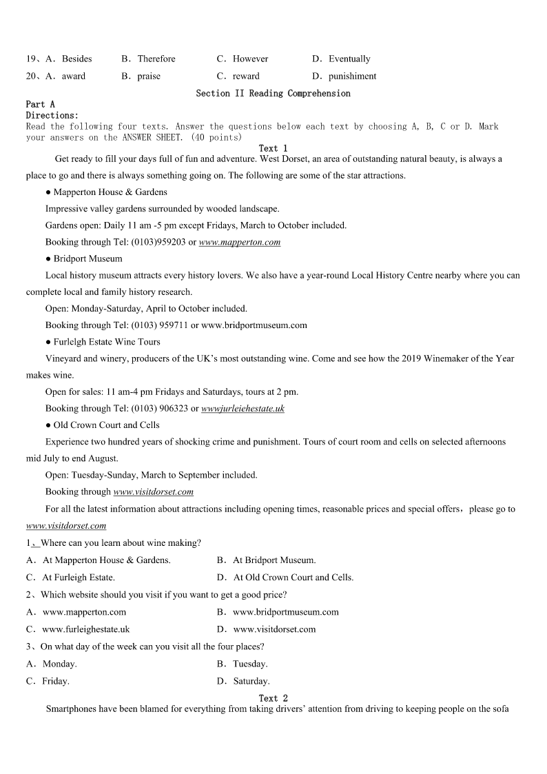 考研《英语一》聊城市东阿县2023年高分冲刺试题 SectionIUseofEnglish Directions: Readthefollowingtext.Choosethebestword(s)foreachnumberedblankandmarkA,B,CorDonthe ANSWERSHEET.(10points) Theroomintheworkhousewheretheboyswerefedwasalargestonehall.Atoneendthemaster,inhiscook’s uniform,andtwowomenservedthefood.This1abowlofthinsoupthreetimesaday,withapieceofbreadonSundays. Theboysate2andwerealwayshungry.Thebowlsneverneeded3.Theboyspolishedthemwiththeirspoonsuntilthey 4.Afterthreemonthsofthisslowstarvation,oneoftheboystoldtheothersthatsohungrywashe5onenighthemight eatthe6sleepingnexttohim.Hehadawild7eye,andtheotherboys8him.Afteralong9,theydecidedthat oneofthemshouldaskformorefoodaftersupperthatevening,andOliverwas10. Theeveningarrived:thesoupwasserved,andthebowlswere11againinafewseconds.Oliverwentuptothemaster, withhisbowlinhishand.Hefeltvery12,butalso13withhunger. “Please,sir,Iwantsomemore.” Themasterwasafat,healthyman,butheturnedverypale.Helookedatthelittleboyinfrontofhimwith14.Nobody elsespoke. “What?”heaskedatlast,ina15voice. “Please,sir,”repliedOliver,“Iwantsomemore.” Themaster16himwiththeservingspoon,thenseizedOliver’sarmsand17forthebeadle(执事).Thebeadle camequickly,heardtheterriblenews,andimmediatelyrantotelltheboard. “Heaskedforme?”Mr.Limbkins,thefattestboardmember,askedin18.“Isthisreallytrue?” 19,Oliverwasledawaytobelockedup,anda(n)20offivepoundswasofferedtoanybodywhowouldtakehim awayandusehimforwork. 1、A.belongedtoB.turnedtoC.accountedforD.consistedof 2、A.nothingB.cleaningC.buyingD.something 3、A.washingB.cleaningC.buyingD.changing 4、A.finishedB.starvedC.shoneD.slept 5、A.thatB.untilC.whenD.before 6、A.boyB.masterC.bowlsD.spoons 7、A.bigB.badC.angryD.hungry 8、A.hatedB.fearedC.believedD.trusted 9、A.quarrelB.bargainC.argumentD.discussion 10、A.electedB.chosenC.determinedD.recognized 11、A.fullB.emptyC.brokenD.available 12、A.shyB.braveC.worriedD.frightened 13、A.pleasedB.hopefulC.desperateD.exhausted 14、A.amusementB.amazementC.intensionD.appreciation 15、A.calmB.clearC.faintD.cautious 16、A.hitB.t