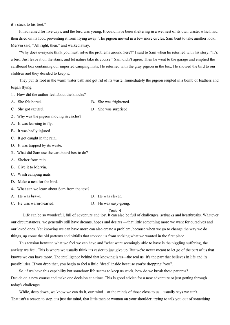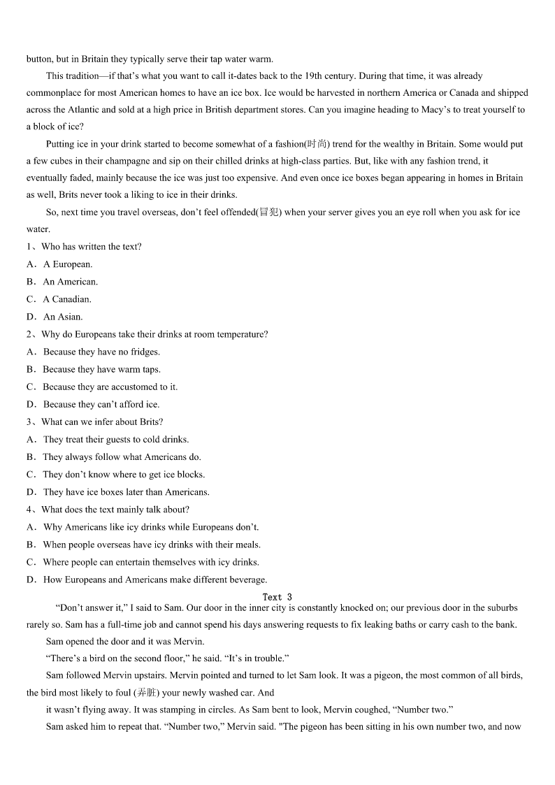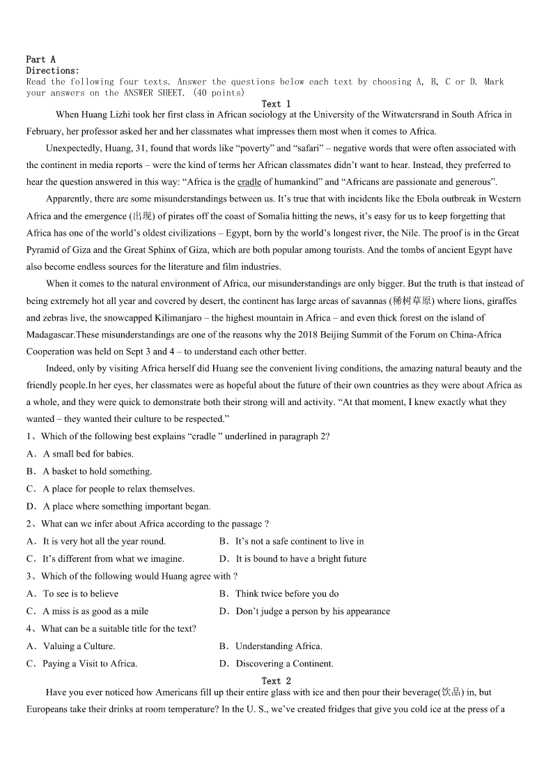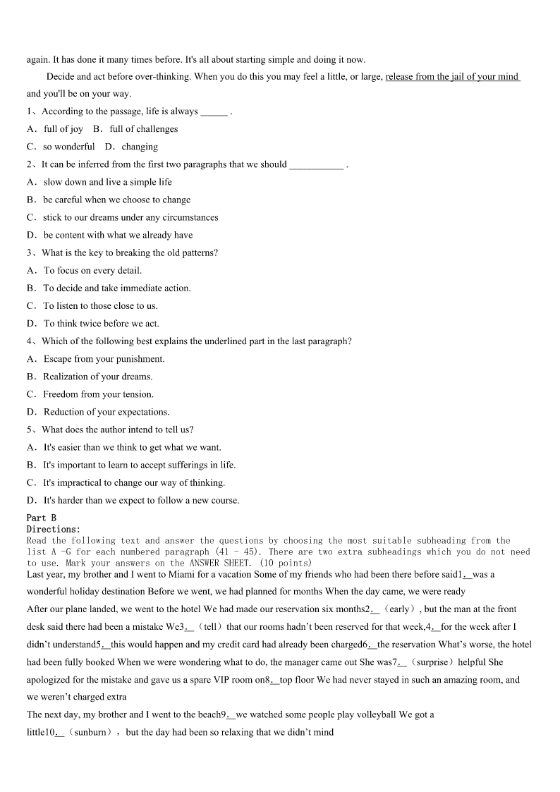 考研《英语一》莱芜市2023年预测试卷 SectionIUseofEnglish Directions: Readthefollowingtext.Choosethebestword(s)foreachnumberedblankandmarkA,B,CorDonthe ANSWERSHEET.(10points) WhenIwasthree,Connie,mynewsister,wasbornonDecember17,1993.Elevenmonthslater,thissmilingchildwas diagnosedwithAcuteLymphocyticLeukemia(ALL).ThedoctorsatJohnHopkinsgaveheran8%1ofsurvival.Withthe helpofour2parents,Conniewasabletofightagainstthediseaseand3wentintoremission(缓解期).Monthslater, Conniehadarelapse(复发).Aftera(n)4secondrelapsein1996,withasurvivalratenowatonly1%,thedoctors5 abonemarrowtransplant(骨髓移植)wasthebestroutetotake.After6ourbloodtypes,thedoctorsfoundanexact7. Me.Iwashonoredtobeabletohelpmysister. AfterthebonemarrowtransplantConniespenthersummersintheneighborhoodpool.Shecouldalwaysbe8running aroundthehouseinbathingsuit.StayingintheremissionforfiveyearswouldmeanConnie’scancerwouldbe9.But beforeConniecould10yearthree,cancerouscellsstartedto11herbodyoncemore;sherelapsed. Connie12duringthisrelapse.becomingprogressively13.Duringthesummerof1999,shewasnotableto14 inthepoolorrideherbike.Shespenthersummerdaysinhospital. WhenNovember15around,Conniehitrockbottom.Thedoctorssaiditwasher16.WhenIwasnineyearsold,on November19,1999,myfamilyandIsaidourgoodbyetoachildwhodidnotlive17theageofsix. Connieisa18,tomyfamilyandme.Sheisarolemodeltopeoplewhoknewher.Herbraveryandcouragewas greaterthan19Iknow.Conniehastaughtmebyexample:itishardto20apersonwhonevergivesup. 1、A.abilityB.riskC.effortD.chance 2、A.worriedB.determinedC.confusedD.exhausted 3、A.continuouslyB.immediatelyC.naturallyD.eventually 4、A.expectingB.disappointingC.experimentingD.promising 5、A.decidedB.wonderedC.remindedD.warned 6、A.searchingB.discussingC.analyzingD.learning 7、A.matchB.typeC.bloodD.method 8、A.takenB.keptC.foundD.stopped 9、A.treatedB.curedC.developedD.diagnosed 10、A.changeB.spendC.realizeD.reach 11、A.handoverB.getoverC.takeoverD.comeover 12、A.survivedB.abandonedC.complainedD.struggled 13、A.betterB.worseC.strongerD.harder 14、A.runB.jumpC.swimD.smile 15