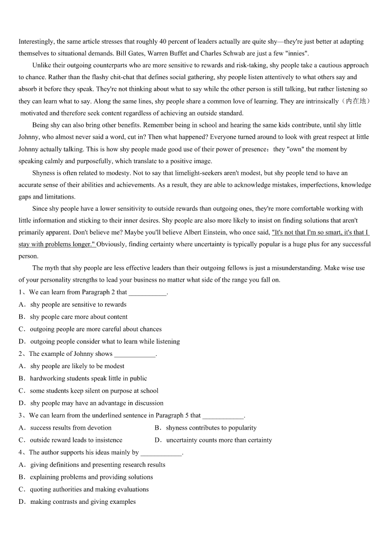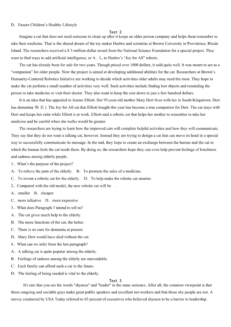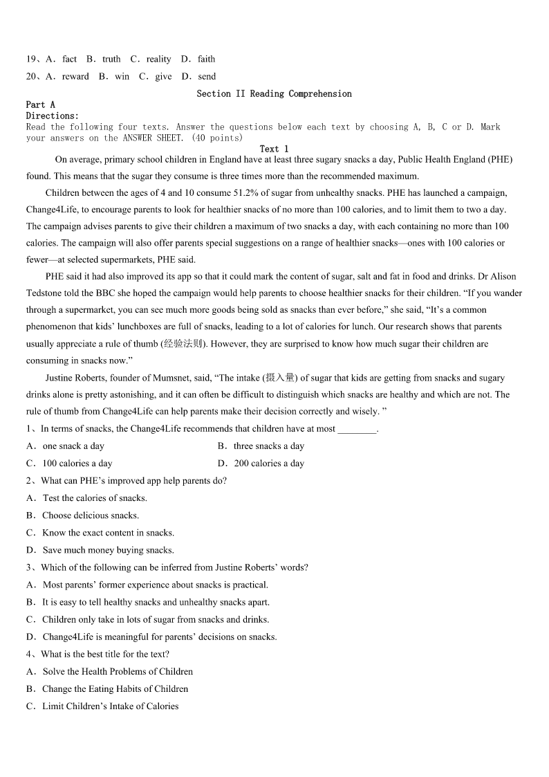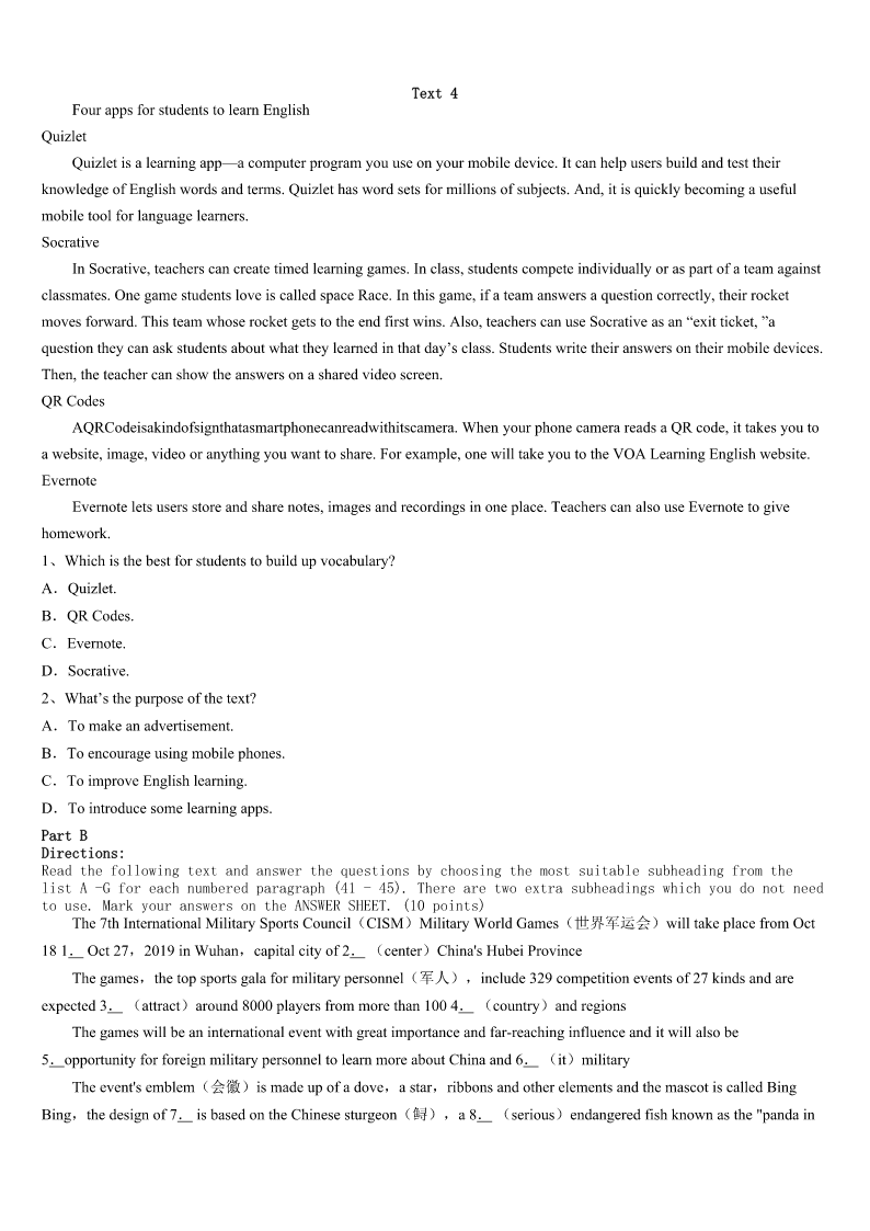 2023年开封县考研《英语一》全真模拟试卷 SectionIUseofEnglish Directions: Readthefollowingtext.Choosethebestword(s)foreachnumberedblankandmarkA,B,CorDonthe ANSWERSHEET.(10points) 阅读下面短文,掌握其大意,然后从各题所给的四个选项(A、B、C和D)中,选出最佳选项,并在答题纸上将该项 选项的标号涂黑。 Ayoungstudentwasonedaytakingawalkwithaprofessor.Astheywentalong,theysaw1belongedtoapoormanwho wasemployedinafieldcloseby. Thestudentturnedtotheprofessor,saying,“Letusplaythemana2:wewillhidehisshoesandwaittoseehis3whenhe cannotfindthem.” “Myyoungfriend,”answeredtheprofessor,“weshouldneveramuseourselvesatthe4ofthepoor.Butyouarerich,and maygiveyourselfamuchgreaterpleasure5thepoorman.Putacoinintoeachshoe,andthenwewillhideourselvesand watch6thediscoveryaffectshim.” Thestudentdidso,andtheybothplacedthemselvesbehindthebushescloseby. Thepoormansoonfinishedhiswork,andcame7thefieldtothepathwherehehadlefthisshoes.While8hisfootinto oneofhisshoes,he9somethinghard,10hebentdownandfoundthecoin.Astonishmentand11wereseenuponhis face.Hethenlookedaroundhimselfonallsides,butnopersonwastobeseen.Henowputthemoneyintohispocket,andwent ontoputontheothershoe;buthissurprisewas12onfindingtheothercoin.Hisfeelings13him;hefelluponhis14, lookeduptoheavenandthankedGodaloud. Thestudentstoodthere15affected,andhiseyesfilledwithtears.“Now,”saidtheprofessor,“areyounotmuchbetter16 thanifyouhadplayedyour17trick?”Theyouthreplied,“YouhavetaughtmealessonwhichIwillneverforget.Ifeelnow the18ofthosewords,whichIneverunderstoodbefore:Itismoreblessedto19thantoreceive.” 1、A.sittingB.lyingC.hidingD.laying 2、A.imaginedB.expectedC.supposedD.recognized 3、A.trickB.roleC.partD.game 4、A.impatienceB.puzzlementC.pityD.disappointment 5、A.expenseB.riskC.needD.poverty 6、A.inreplytoB.inresponsetoC.bymeansofD.bywayof 7、A.whyB.whenC.whereD.how 8、A.acrossB.aroundC.throughD.towards 9、A.risingB.rushingC.slippingD.sliding 10、A.foundB.noticedC.kickedD.felt 11、A.butB.soC.asD.for 12、A.wonderB.admirationC.guiltD.anxiety 13、A.advancedB.improvedC.progressedD.doubled 14、A.graspedB.overcameC.inspiredD.sank 15、A.kneesB.handsC