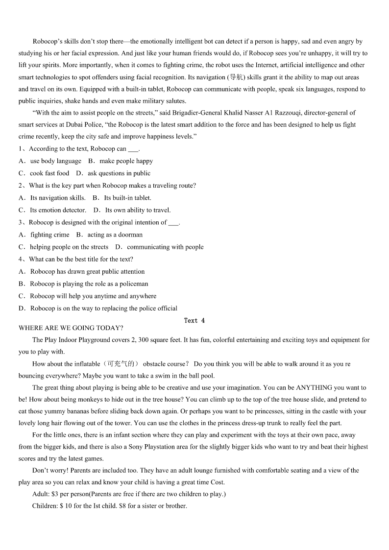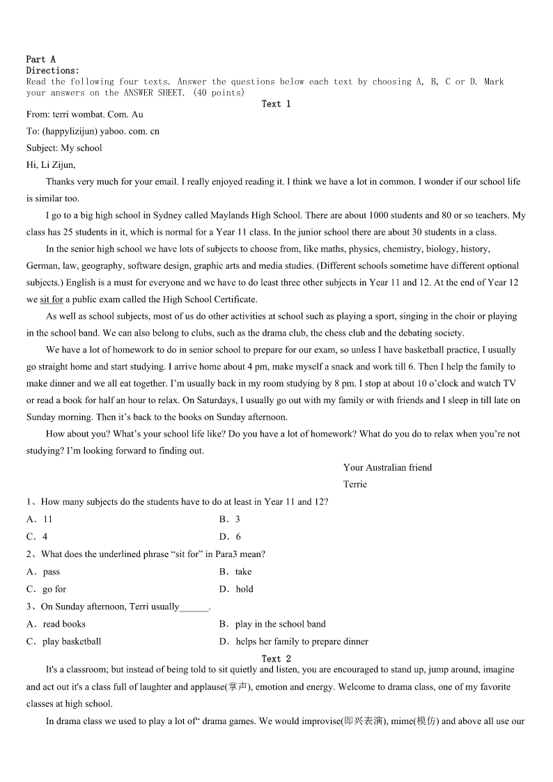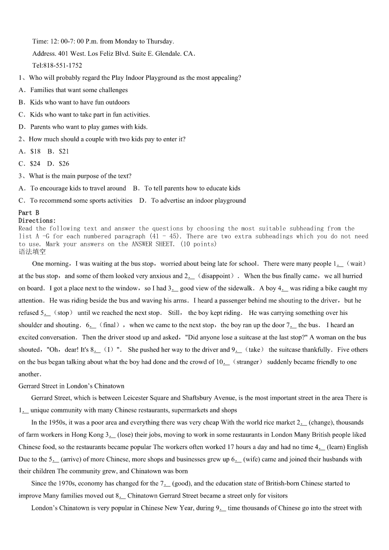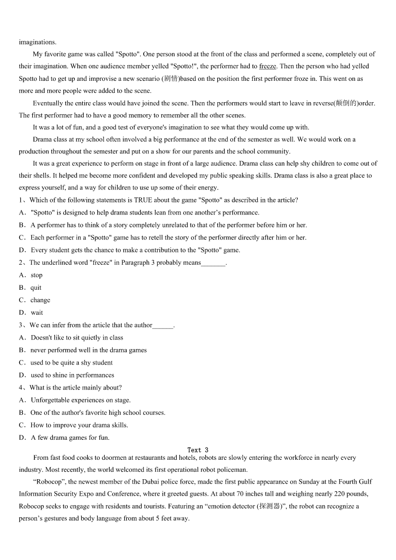 考研《英语一》茂名市信宜市2023年巅峰冲刺试卷 SectionIUseofEnglish Directions: Readthefollowingtext.Choosethebestword(s)foreachnumberedblankandmarkA,B,CorDonthe ANSWERSHEET.(10points) Twistwasthenameofanoldchampionracinghorse.Hewaspastthirtyyearsold,buttheheartofthetrue1stillbeatwith thegreatspirit.However,Iknewlittleaboutthe2thattheoldhorse’sspiritwouldhaveonmydaughter. MydaughterStacyhadeverhada3experiencewitharunawayhorse.Shewasjusteightatthetime,andaterrifying4 accompaniedthedisaster.Althoughshebrokenobones,her5,loveforhorsesandthedesiretolearntoridewere6No matterhowmywifeandItried,wehadno7incuringthedamagecausedthatday.Butwhenshewasthirteen,aturning pointcame.OnedayasIsawStacylookintotheeyeofthe8fellowinthestall(牲口棚),Iknewthiswasgoingtobethe beginningofa9relationship. Fortunately,Stacy’saccidenthadnotweakenedherlovefor10ingeneral,andthissmallopeningwasallthatTwistneeded tocreateanunusualbond(纽带).Inthefollowingweeks,Stacybegantoexpressdaily11incomingtothestallwithme.She 12spenttimewithhim,feeding,brushingandcombinghim,allthe13talkingtohimaboutherlife. Thenoneday14Iwasreadyingonehorseforaride,Inoticedtheoldguy’s15expressionanddesiretobeincluded,too. SoIaskedStacyifshewantedtotakeTwistoutforaride.In16,Stacylookedonceagainintotheoldman’seye.That moment,theirtwospirits17andcompletedthebondthathadbeenformingoveracoupleofmonths.Continuingtolookdeep intohiseyes,Stacydidn’t18.Sheonlynoddedyes.Momentslater,Isawthemriding19together,Stacywinningrenewed confidenceanddesire,andTwistwinninghismedalofachild’s20 1、A.ownerB.winnerC.jumperD.member 2、A.wishB.ideaC.effectD.ability 3、A.newB.badC.richD.strange 4、A.fallB.taskC.shakeD.attack 5、A.prideB.skillC.luckD.confidence 6、A.ignoredB.reformedC.destroyedD.overlooked 7、A.aimB.needC.surpriseD.success 8、A.poorB.oldC.braveD.strong 9、A.seriousB.similarC.specialD.formal 10、A.animalsB.parentsC.friendsD.fields 11、A.thanksB.interestC.opinionsD.sympathy 12、A.endlesslyB.roughlyC.unwillinglyD.actively 13、A.bestB.wayC.sameD.time 14、A.asB.soC.althoughD.because 15、A.