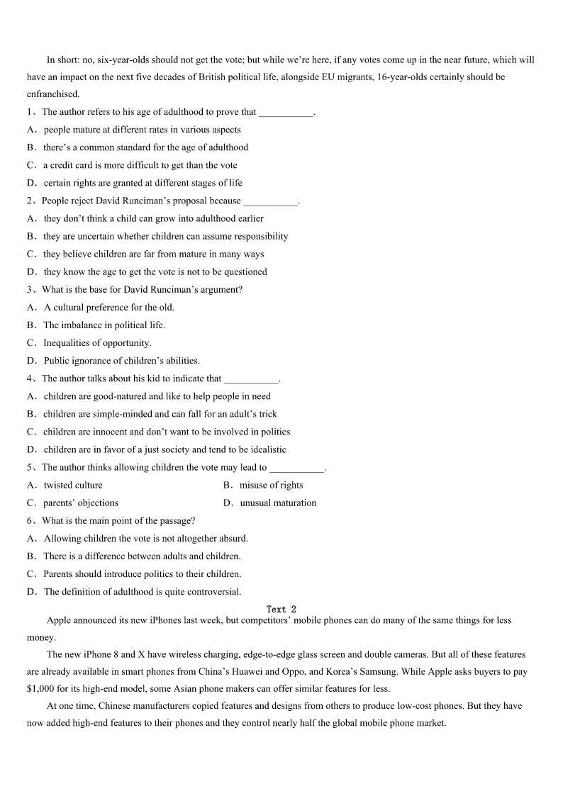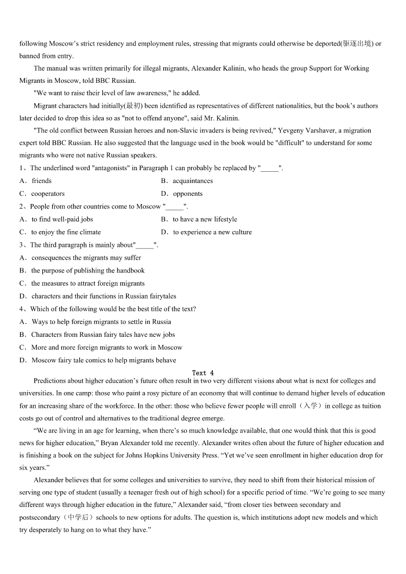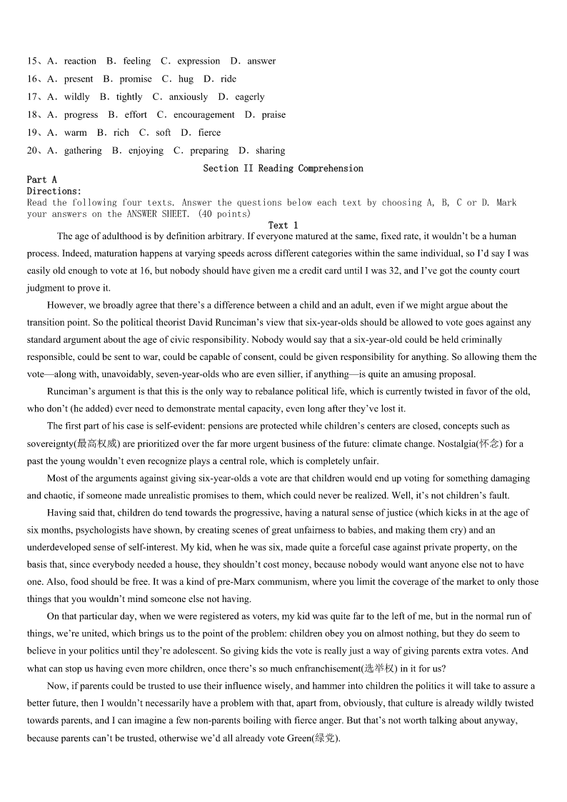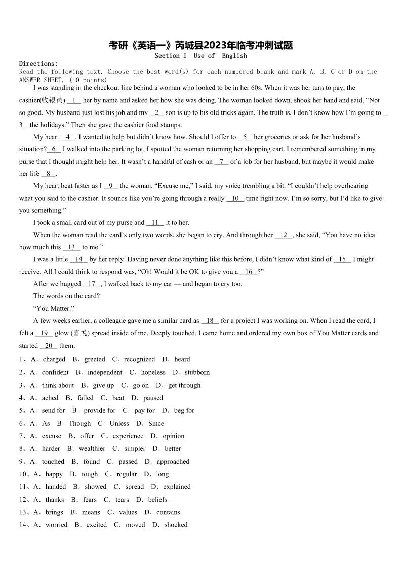 考研《英语一》芮城县2023年临考冲刺试题 SectionIUseofEnglish Directions: Readthefollowingtext.Choosethebestword(s)foreachnumberedblankandmarkA,B,CorDonthe ANSWERSHEET.(10points) Iwasstandinginthecheckoutlinebehindawomanwholookedtobeinher60s.Whenitwasherturntopay,the cashier(收银员)1herbynameandaskedherhowshewasdoing.Thewomanlookeddown,shookherhandandsaid,“Not sogood.Myhusbandjustlosthisjobandmy2sonisuptohisoldtricksagain.Thetruthis,Idon’tknowhowI’mgoingto 3theholidays.”Thenshegavethecashierfoodstamps. Myheart4.Iwantedtohelpbutdidn’tknowhow.ShouldIofferto5hergroceriesoraskforherhusband’s situation?6Iwalkedintotheparkinglot,Ispottedthewomanreturninghershoppingcart.Irememberedsomethinginmy pursethatIthoughtmighthelpher.Itwasn’tahandfulofcashoran7ofajobforherhusband,butmaybeitwouldmake herlife8. MyheartbeatfasterasI9thewoman.“Excuseme,”Isaid,myvoicetremblingabit.“Icouldn’thelpoverhearing whatyousaidtothecashier.Itsoundslikeyou’regoingthroughareally10timerightnow.I’msosorry,butI’dliketogive yousomething.” Itookasmallcardoutofmypurseand11ittoher. Whenthewomanreadthecard’sonlytwowords,shebegantocry.Andthroughher12,shesaid,“Youhavenoidea howmuchthis13tome.” Iwasalittle14byherreply.Havingneverdoneanythinglikethisbefore,Ididn’tknowwhatkindof15Imight receive.AllIcouldthinktorespondwas,“Oh!WoulditbeOKtogiveyoua16?” Afterwehugged17,Iwalkedbacktomycar—andbegantocrytoo. Thewordsonthecard? “YouMatter.” Afewweeksearlier,acolleaguegavemeasimilarcardas18foraprojectIwasworkingon.WhenIreadthecard,I felta19glow(喜悦)spreadinsideofme.Deeplytouched,IcamehomeandorderedmyownboxofYouMattercardsand started20them. 1、A.chargedB.greetedC.recognizedD.heard 2、A.confidentB.independentC.hopelessD.stubborn 3、A.thinkaboutB.giveupC.goonD.getthrough 4、A.achedB.failedC.beatD.paused 5、A.sendforB.provideforC.payforD.begfor 6、A.AsB.ThoughC.UnlessD.Since 7、A.excuseB.offerC.experienceD.opinion 8、A.harderB.wealthierC.simplerD.better 9、A.touchedB.foundC.passedD.approached 10、A.happyB.toughC.regularD.long 11、A.handedB.showedC.spreadD.e