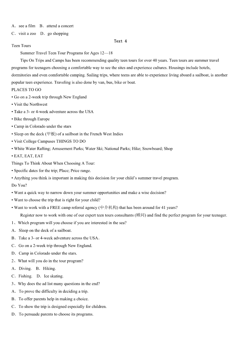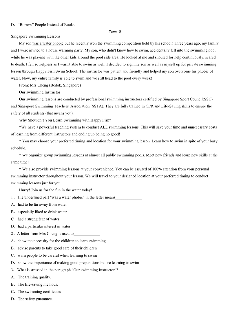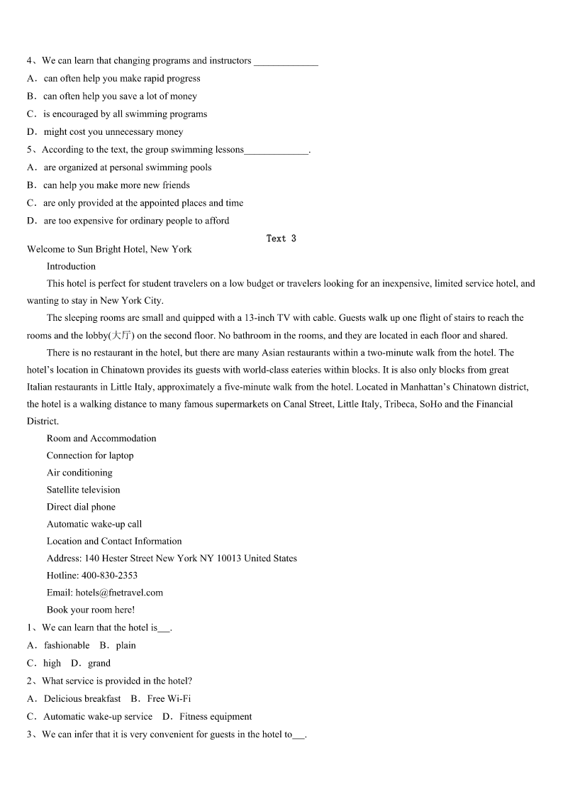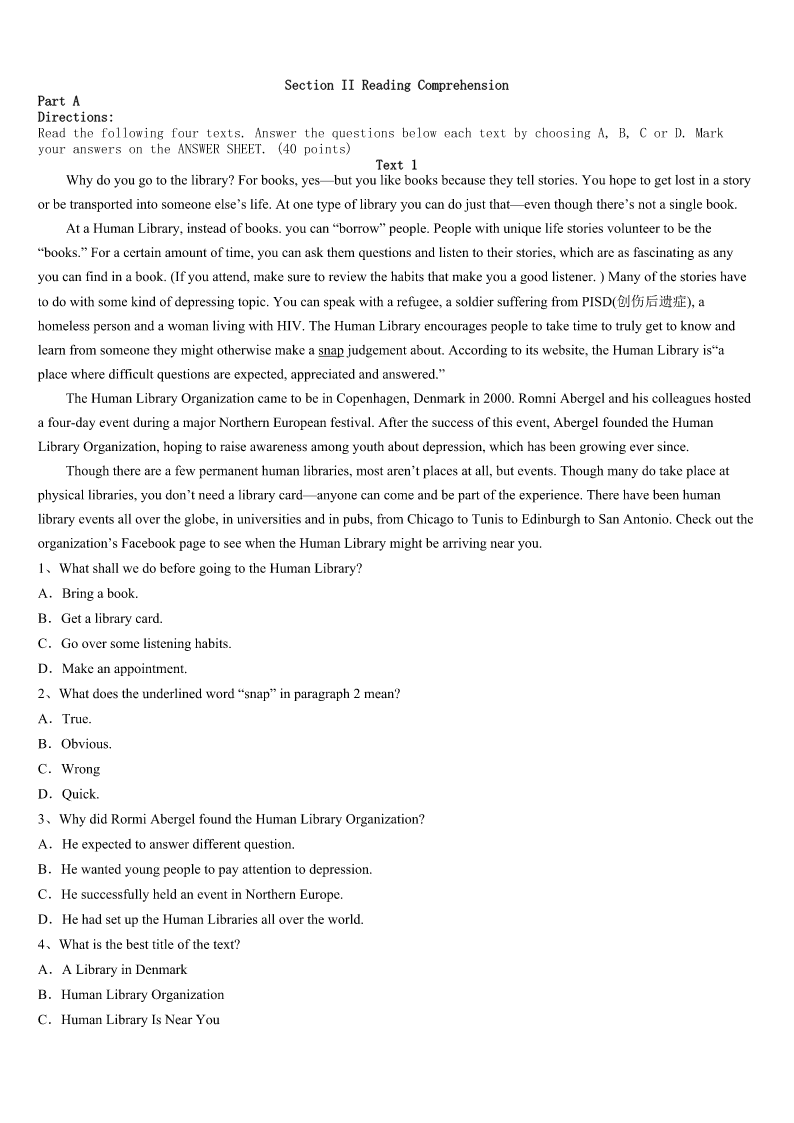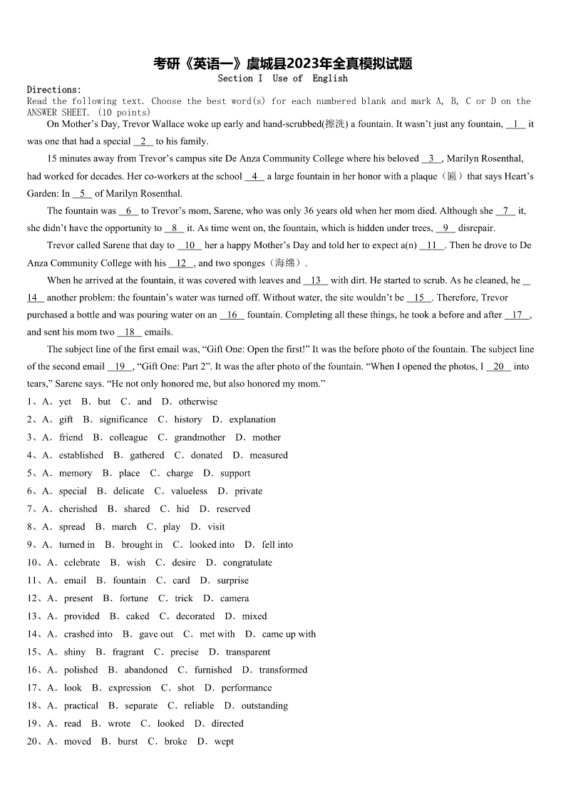考研《英语一》虞城县2023年全真模拟试题 SectionIUseofEnglish Directions: Readthefollowingtext.Choosethebestword(s)foreachnumberedblankandmarkA,B,CorDonthe ANSWERSHEET.(10points) OnMother’sDay,TrevorWallacewokeupearlyandhand-scrubbed(擦洗)afountain.Itwasn’tjustanyfountain,1it wasonethathadaspecial2tohisfamily. 15minutesawayfromTrevor’scampussiteDeAnzaCommunityCollegewherehisbeloved3,MarilynRosenthal, hadworkedfordecades.Herco-workersattheschool4alargefountaininherhonorwithaplaque(匾)thatsaysHeart’s Garden:In5ofMarilynRosenthal. Thefountainwas6toTrevor’smom,Sarene,whowasonly36yearsoldwhenhermomdied.Althoughshe7it, shedidn’thavetheopportunityto8it.Astimewenton,thefountain,whichishiddenundertrees,9disrepair. TrevorcalledSarenethatdayto10herahappyMother’sDayandtoldhertoexpecta(n)11.ThenhedrovetoDe AnzaCommunityCollegewithhis12,andtwosponges(海绵). Whenhearrivedatthefountain,itwascoveredwithleavesand13withdirt.Hestartedtoscrub.Ashecleaned,he 14anotherproblem:thefountain’swaterwasturnedoff.Withoutwater,thesitewouldn’tbe15.Therefore,Trevor purchasedabottleandwaspouringwateronan16fountain.Completingallthesethings,hetookabeforeandafter17, andsenthismomtwo18emails. Thesubjectlineofthefirstemailwas,“GiftOne:Openthefirst!”Itwasthebeforephotoofthefountain.Thesubjectline ofthesecondemail19,“GiftOne:Part2”.Itwastheafterphotoofthefountain.“WhenIopenedthephotos,I20into tears,”Sarenesays.“Henotonlyhonoredme,butalsohonoredmymom.” 1、A.yetB.butC.andD.otherwise 2、A.giftB.significanceC.historyD.explanation 3、A.friendB.colleagueC.grandmotherD.mother 4、A.establishedB.gatheredC.donatedD.measured 5、A.memoryB.placeC.chargeD.support 6、A.specialB.delicateC.valuelessD.private 7、A.cherishedB.sharedC.hidD.reserved 8、A.spreadB.marchC.playD.visit 9、A.turnedinB.broughtinC.lookedintoD.fellinto 10、A.celebrateB.wishC.desireD.congratulate 11、A.emailB.fountainC.cardD.surprise 12、A.presentB.fortuneC.trickD.camera 13、A.providedB.cakedC.decoratedD.mixed 14、A.crashedintoB.gaveoutC.metwithD.cameupwith 15、A.shinyB.fragrantC.preciseD.tr