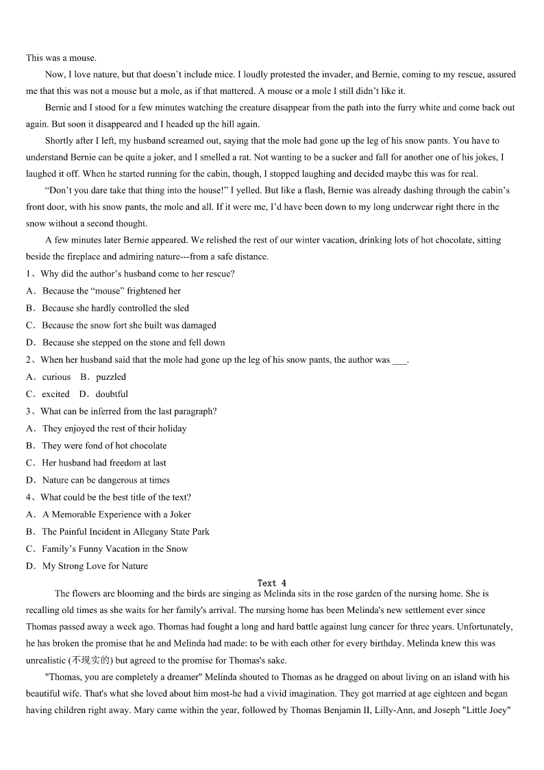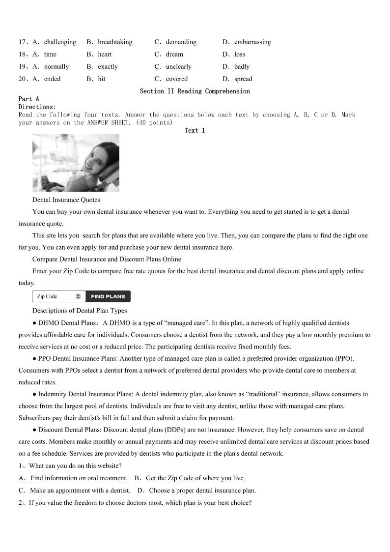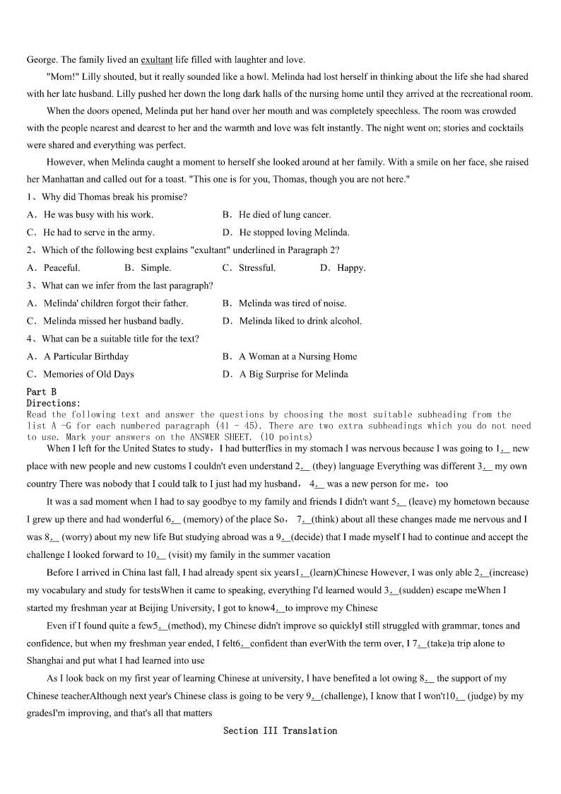 考研《英语一》襄樊市襄城区2023年点睛提分卷 SectionIUseofEnglish Directions: Readthefollowingtext.Choosethebestword(s)foreachnumberedblankandmarkA,B,CorDonthe ANSWERSHEET.(10points) 完形填空 阅读下面短文,从短文后各题所给的四个选项(A、B、C、D)中,选出可以填入空白处的最佳选项,并在答题卡上将 该项涂黑。 Myheartbeatwiththatfeeling,likebloodtomybodyasmyfingersflewacrossthepianokeys.Asthepiecenearedtheend,I 1uptotakemyfinalbow.Forasecond,theroomwas2Yet,eveninthatonesecond,Ihadenoughtimeto3whetherI haddoneperfectly.Then,4,theapplause(掌声)came. “Thankyou…somuch,”Isaid,5tothepersonstandingonmyotherside.Olga,mypianoteacherforsixyears,smiledback atme.“You’vebeenan6studentalltheseyears,”shesaid,“Ihopethatwhateveryoudo,youneverstop7” Ileanedforward,8IwouldkeepplayingbecauseIlovedpiano,andhuggedher. Asit9,thepromisesweren’tasmeaningfulasI’dhoped.Rightafterthe10,Ikeptupmystrictpracticingscheduleevery day.11,itbeganslippingawayfromme.ThereasonIhadstoppedtaking12wasbecauseofmybusyschedulewith homework.Notlongafter,Istoppedpracticingaltogether.Itwas13nottohavetostressaboutpianoanymore.But somethingwas14insideofme.Iwasemptyinside. OnedayImetMichelle,whohadalsotakenpianolessonsfromOlga. “Areyou15takinglessonsfromOlga?”sheasked. “ActuallyIjustquitawhileago,”Ireplied. “That’sa16,”sheresponded,“Irememberyourperformanceayearago;itwas17” TwodaysaftertalkingtoMichelle,Iwasata18whattodo.Imovedslowlyintothelivingroomunconsciously,butinfactI knew19whatIwasdoing. Asthemusic20,afamiliarfeelingroseinsideme. 1、A.showedB.satC.stoodD.looked 2、A.lightB.quietC.colorfulD.nervous 3、A.expectB.remindC.knowD.doubt 4、A.immediatelyB.successfullyC.hopefullyD.suddenly 5、A.turningB.wavingC.runningD.pointing 6、A.easy-goingB.imaginativeC.amazingD.honest 7、A.practisingB.learningC.competingD.gaining 8、A.tellingB.promisingC.admittingD.speaking 9、A.carriedonB.broughtupC.turnedoutD.takenin 10、A.performanceB.finalC.presentationD.play 11、A.SoonB.BesidesC.ThusD.Instead 12、A.lecturesB.partsC.lessonsD.pieces 13、A.disappointingB.pleasingC.inspiringD.puzzling 14、A.beatingB.risingC.changingD.shining 1